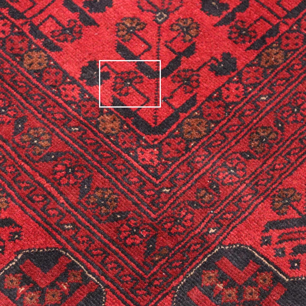 Typically, it has the flowers found on most Afghan rugs. Also the dark red colouring makes this Kahl Mohammadi unmistakably an Afghan rug. Often Kahl Mohammadi have the so-called elephant foot pattern in the central part of the carpet. This is an octagonal ornament, whose outer shape is reminiscent of an elephant foot. This carpet, on the other hand, has been used exclusively in flowers and rectangular shapes. This creates a not entirely unusual, but at the same time individual design with a timeless character. Here too, the flower in large format is at the centre of each ornament.