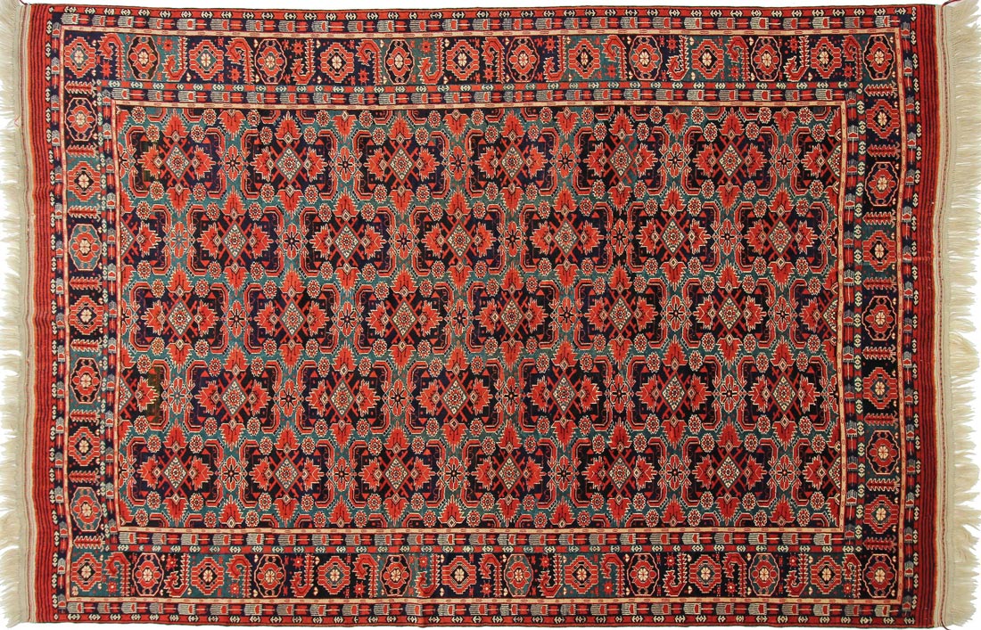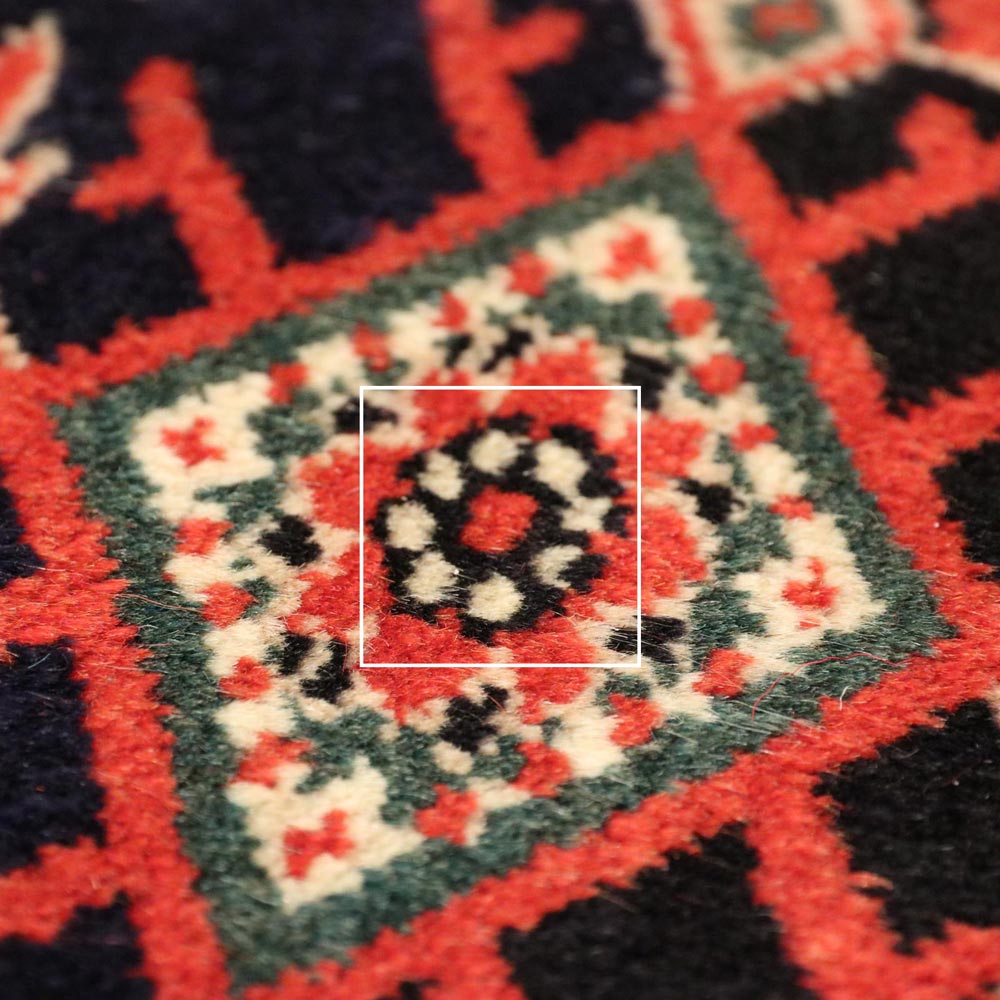 Since Afghan carpets mostly come from the regions around Kabul, Herat and Kandahar, this carpet has a special origin. The fine elaboration of the ornaments, which are mostly in floral form, are striking. As on other Afghan carpets, six-petalled blossoms can be found in the frame. As on the classic Kahl Mohammadi below, the flowers play an important role. The central part of the carpet is decorated with a recurring pattern consisting of two different ornaments. At the centre of each of the large ornaments is once again a flower, externally decorated in part with geometric designs. Terms such as love, flower and nightingale have always played an important role in the literary culture of Afghanistan. Elements from this culture can also be found on most carpets.