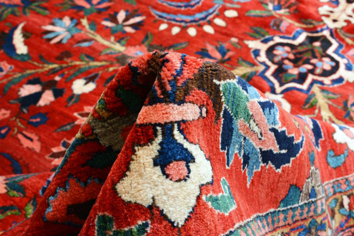 There is a variety of motifs and patterns on oriental carpets. Traditional patterns are such as ornaments or floral and geometric designs, knotted all-over and surrounded by beautiful borders. Classic midfield-medallions are popular, too. There is an endless abundance of patterns and colours, that are decorating oriental carpets. The knotters only have one limit: their imagination. Some of the most popular patterns are the Herati pattern - a diamond surrounding a rosette - and the Boteh pattern, which looks like a swung almond. The whole colour spectrum finds itself on oriental carpets. Red, blue and beige shades are the most traditional ones. Real carpets from the orient are costly coloured with natural dyes. Synthetic colours can be found on cheaper pieces, but they have a lower colour depth. Thus, original Persian carpets aren't just of high durability, but also have an amazing colour depth.