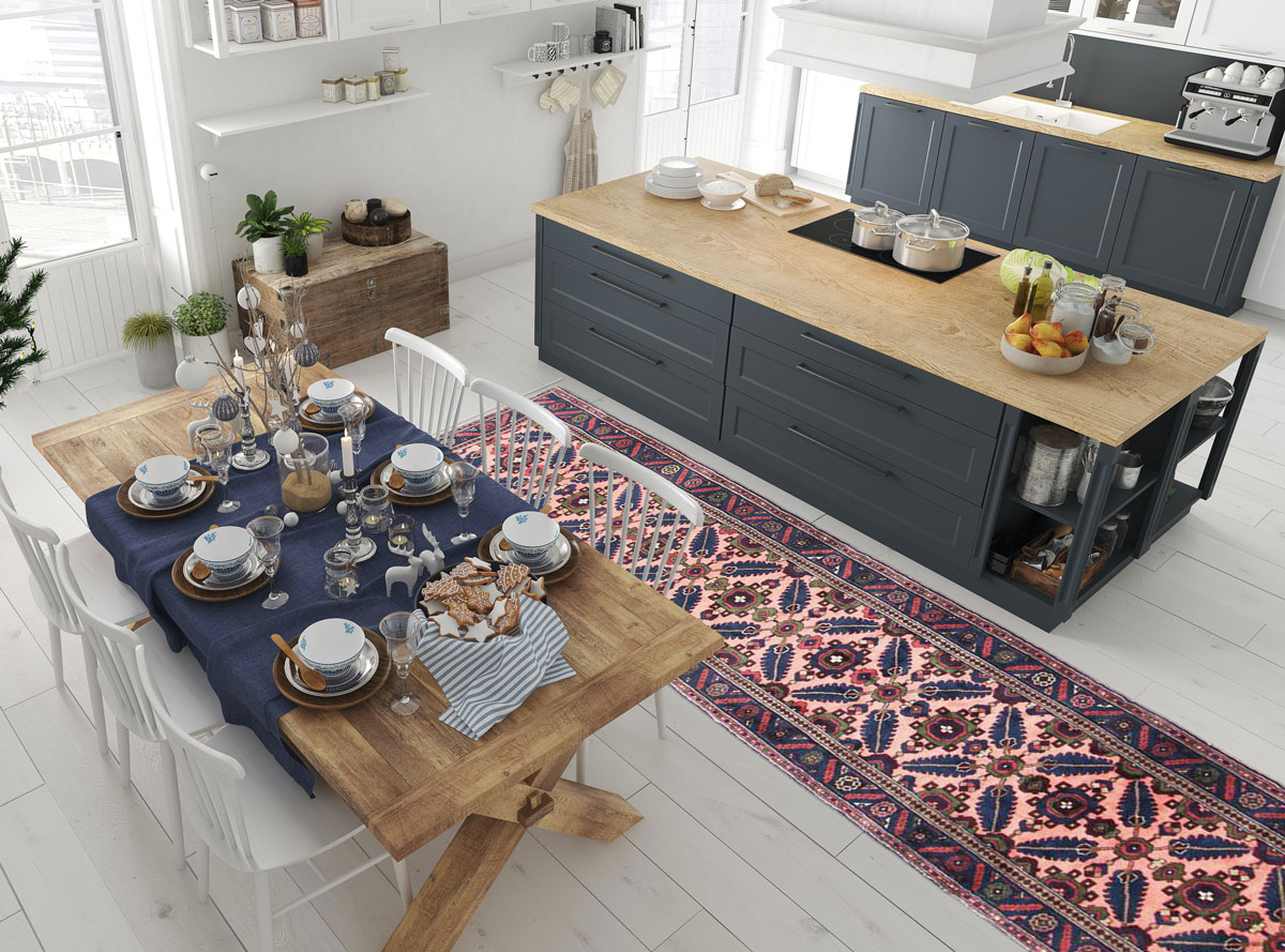The kitchen is much more than just a room for preparing food. Especially today the kitchen serves as a full living room. Open-plan living space concepts with integrated kitchens are the expression of our current understanding of living atmosphere. Therefore, kitchens - whether integrated or as single rooms - should not be cold rooms for preparing our daily meals. Much more they should invite you to linger and be a place of well-being. A kitchen runner carpet can work wonders in this context. Carpets give rooms warmth and ambience. However, choosing the right rug for your kitchen is not that easy. In the following we give you tips on how to find the perfect carpet for your kitchen.