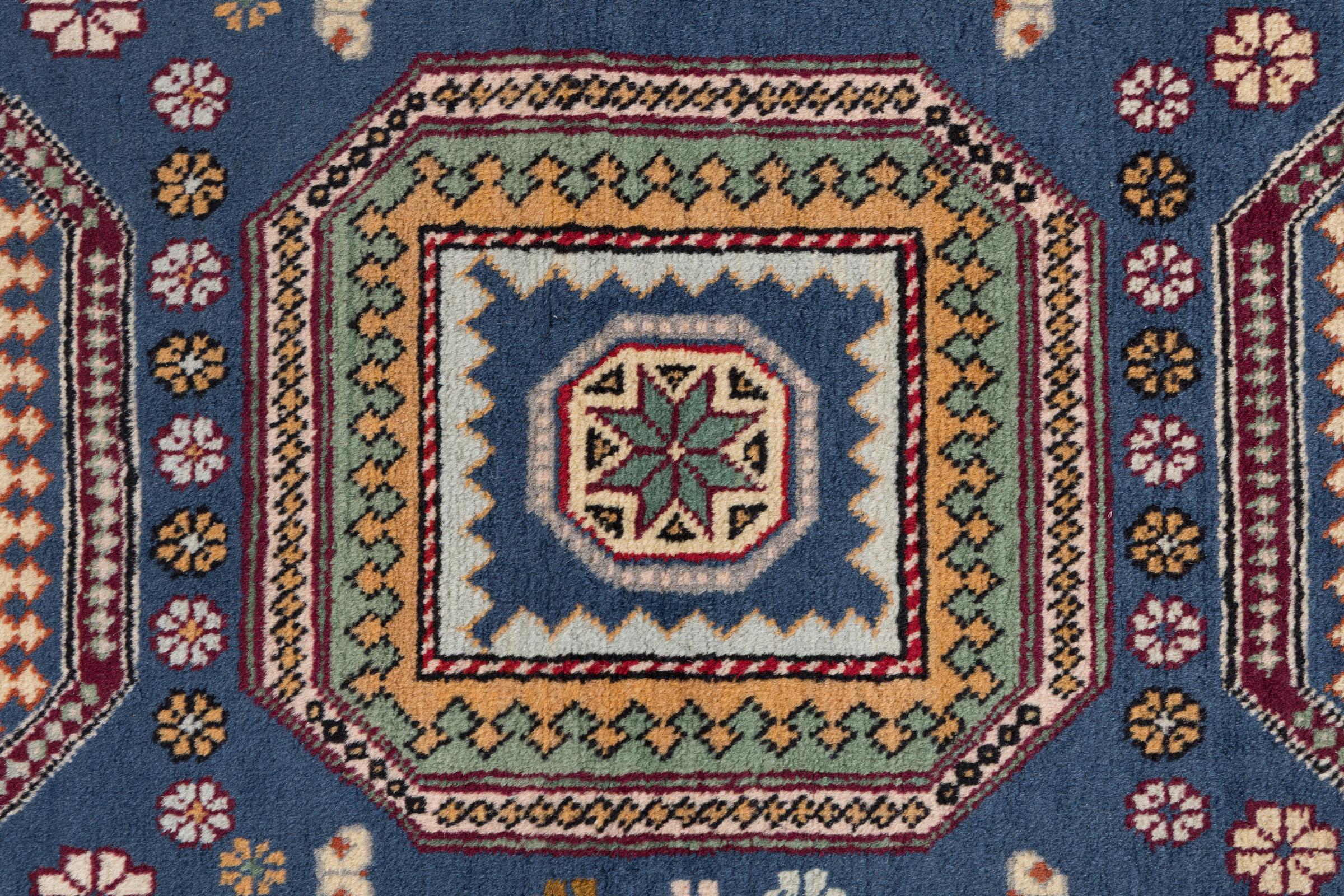 This handknotted Shirvan is a very robust carpet from eastern Caucasus, which catches one’s eye with its beautiful colouring and its beautiful decorating elements. Thanks to a very dense knotting it is also durable.
