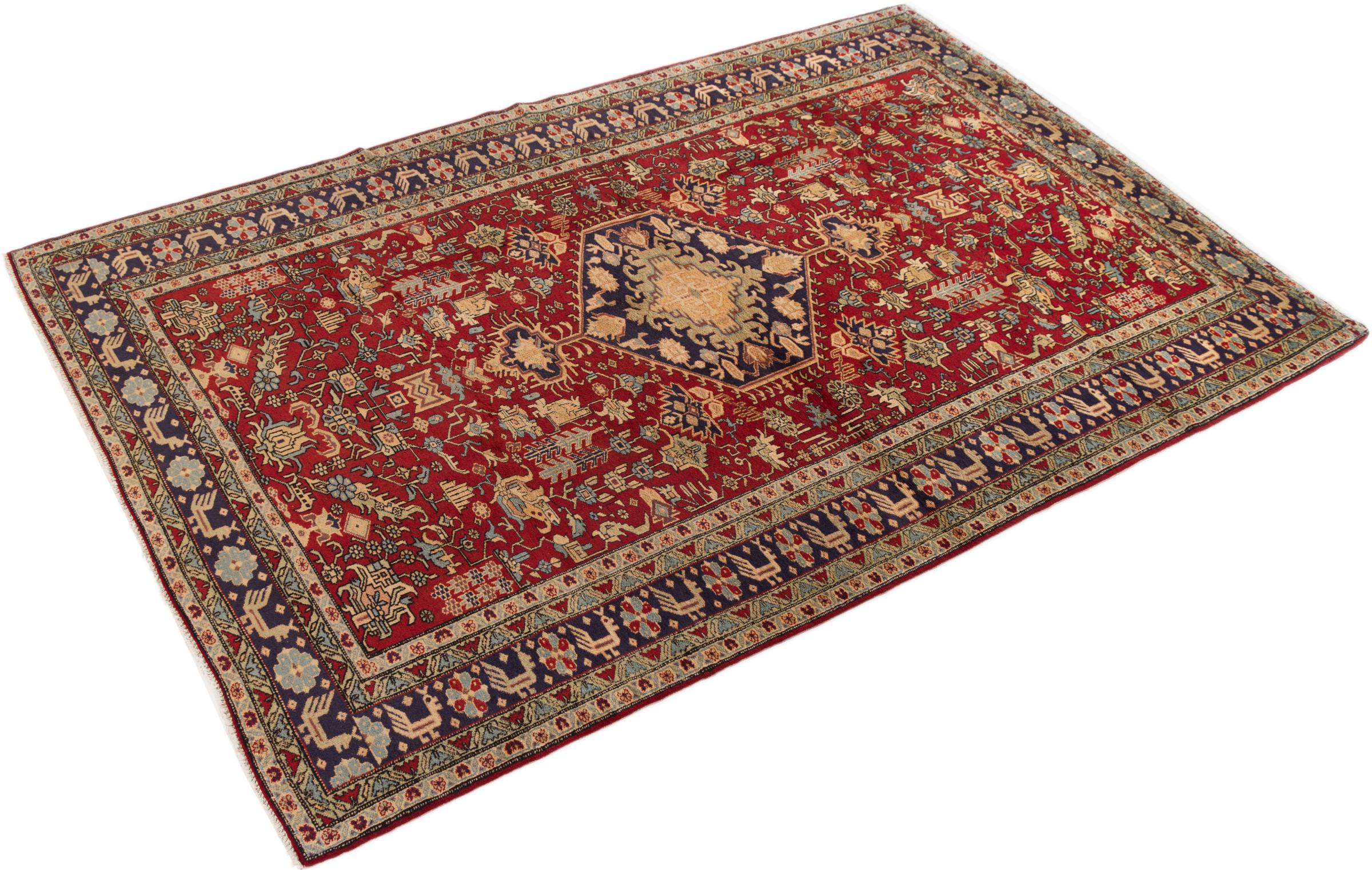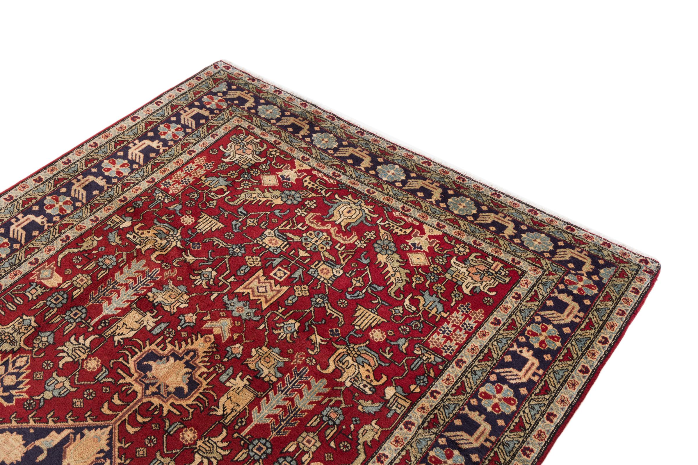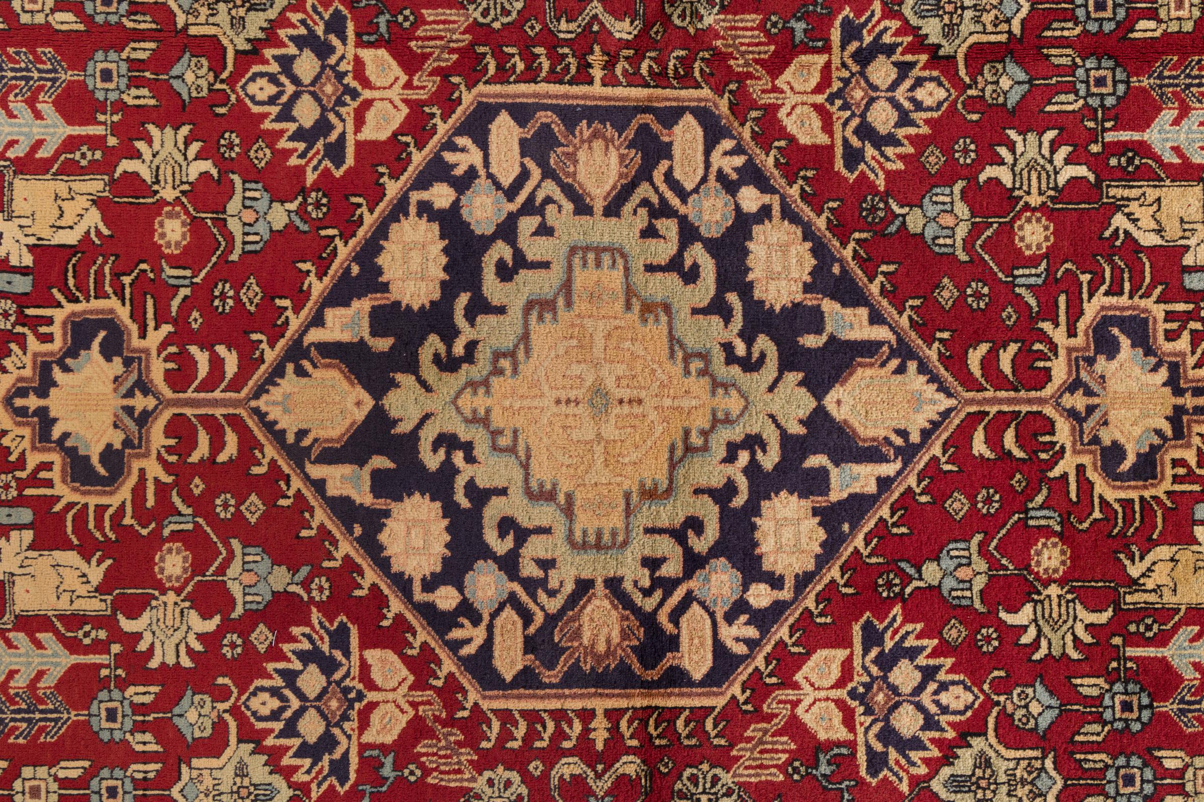 This Heriz carpet is a beautiful example of Persian carpet craftsmanship. Its rustic design is a testament to its durability. It was hand-knotted in the city of Heriz, which is located near Tabriz in north-west Iran. Anyone looking for a Persian rug that will give pleasure for a long time and is highly modern will love this Heriz. The ornaments of Heriz rugs are extremely popular today and are seen as very modern. You will never give up a rug like this again.