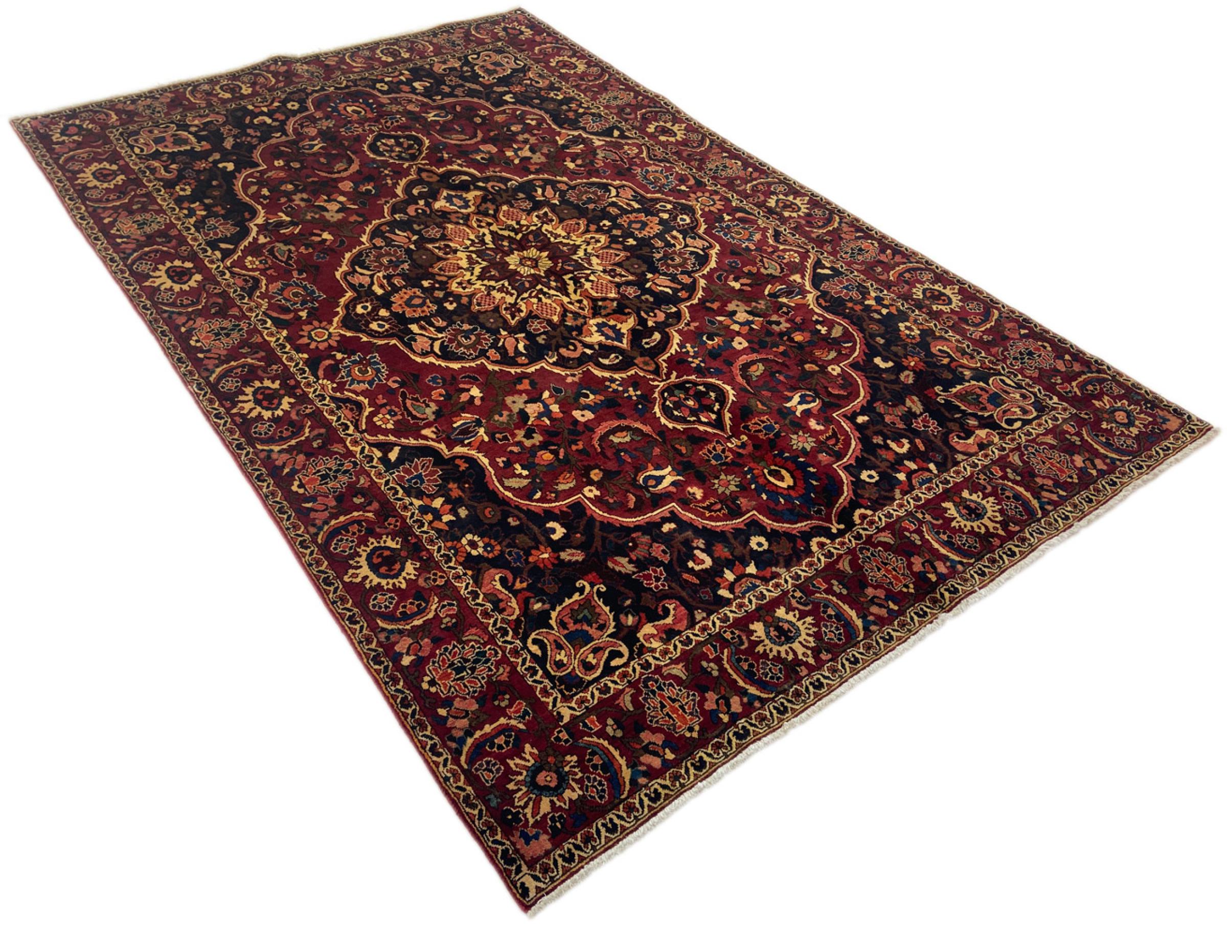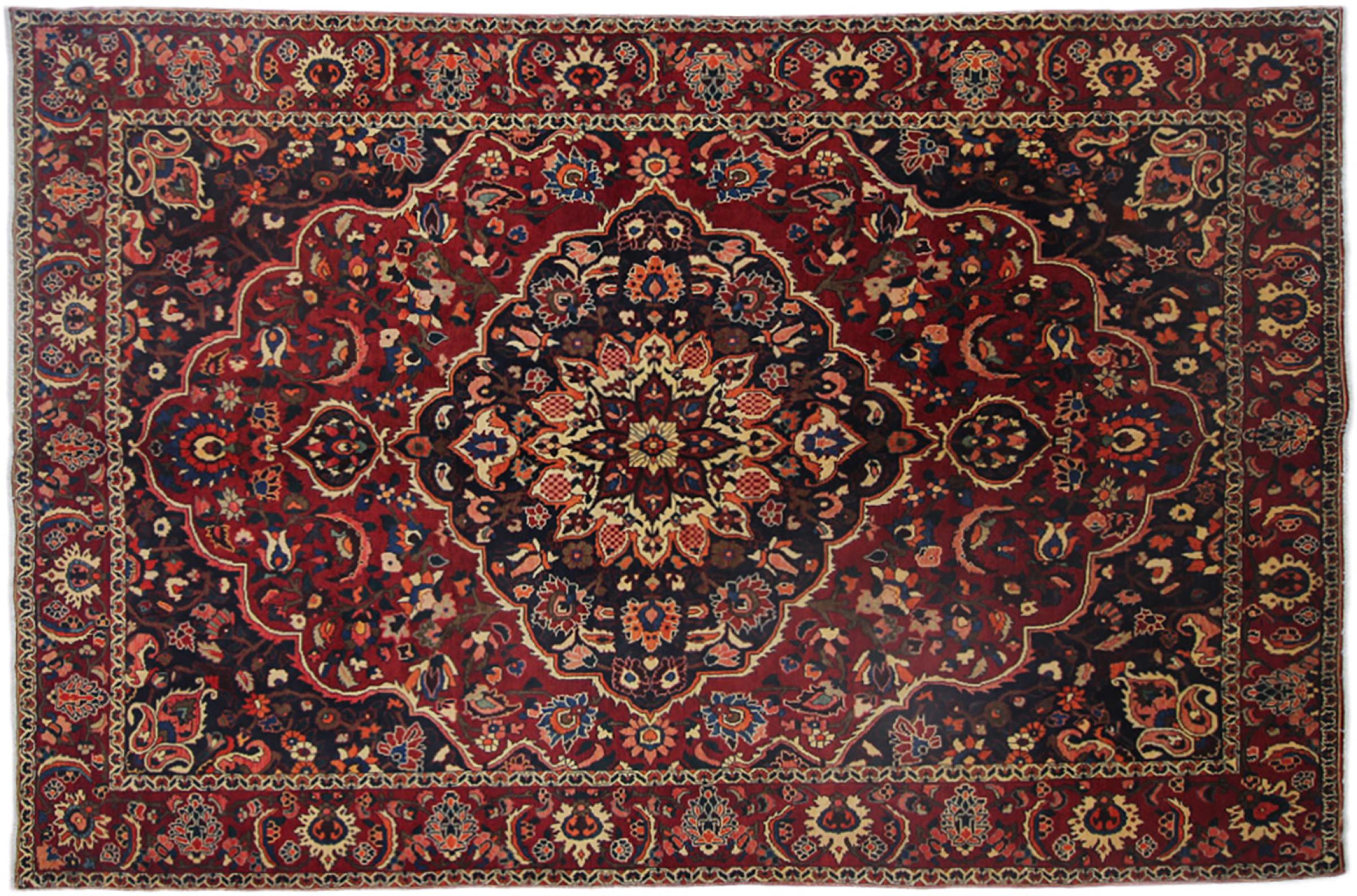 Carpet ID: 318031003339895 Size: 311x199 cm Thickness: ap. 12 mm Knot density: 128 000 - 160 000 / m² Manufacturing: Knotted by hand Pile: Handspun wool Warp: Cotton Origin: Persia Age: New Weight: ap. 25 kg Also know as Baktjar In stock: Unique - Only 1 in stock