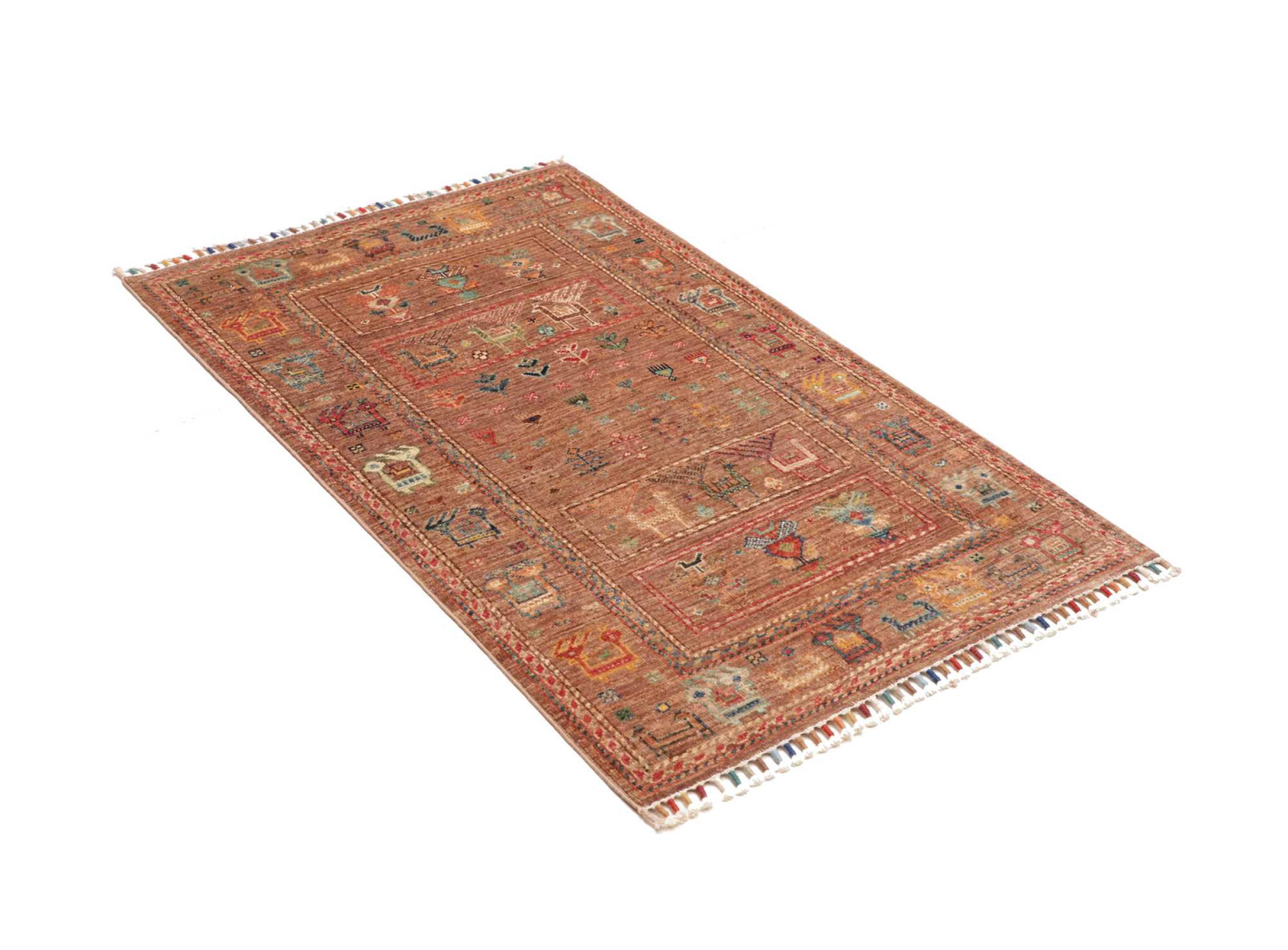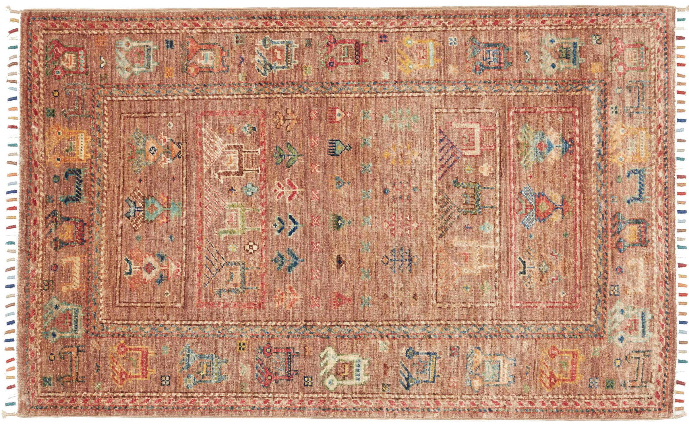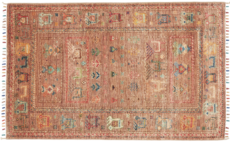 Carpet ID: 306899005068051 Size: 126x78 cm Thickness: ap. 5 mm Knot density: 128 000 - 160 000 / m² Manufacturing: Knotted by hand Pile: Handspun wool Warp: Cotton Origin: Pakistan Age: New Weight: ap. 3 kg In stock: Unique - Only 1 in stock