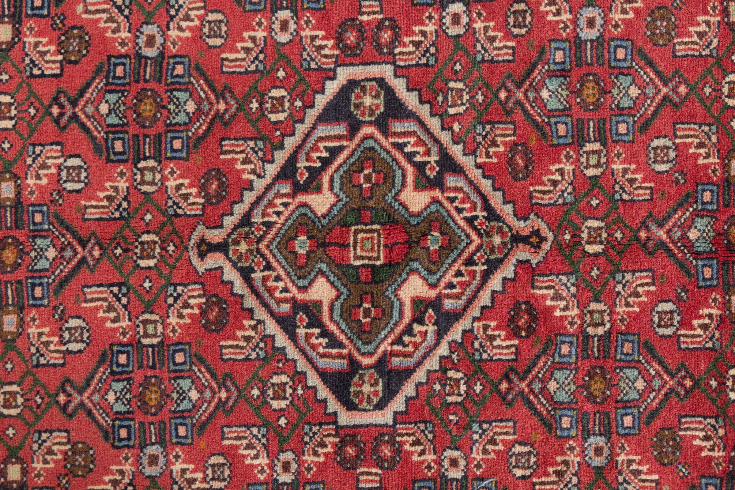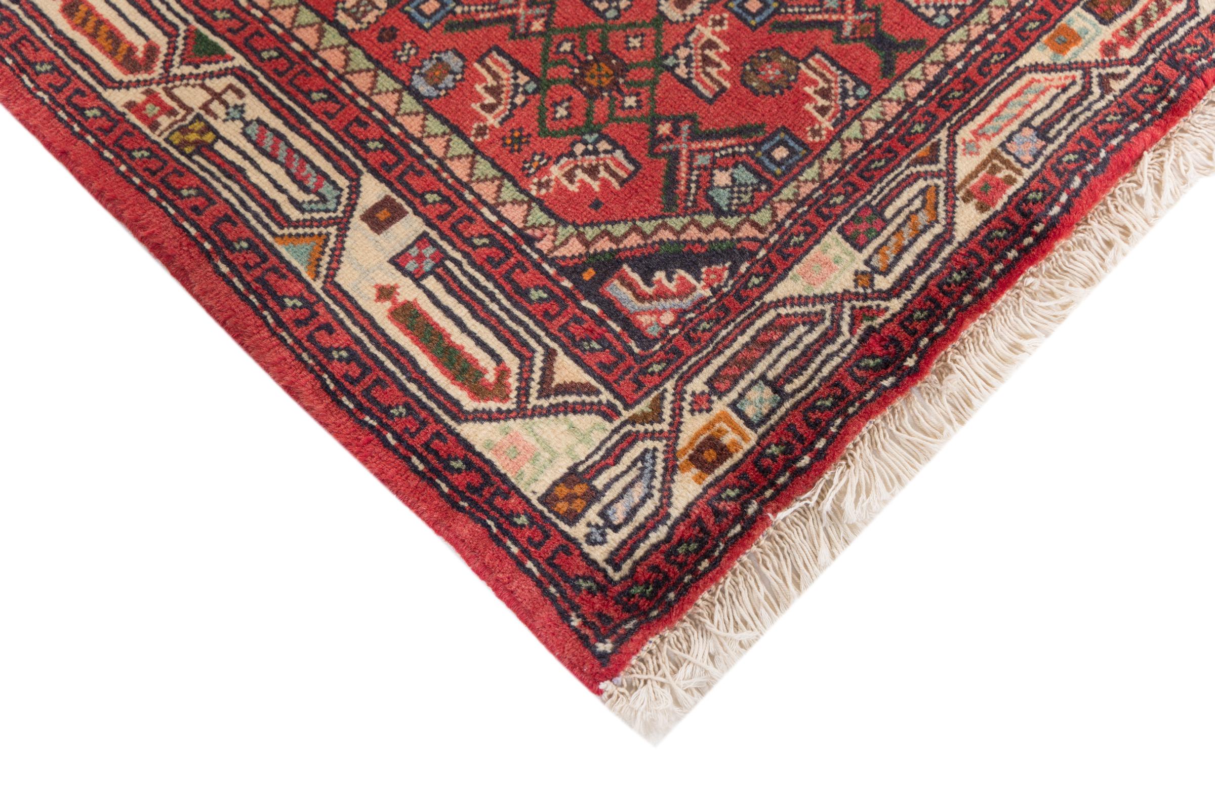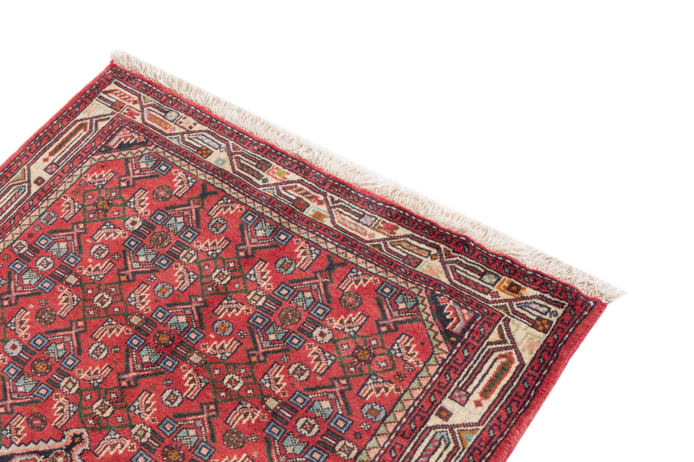This rug belongs to village and nomadic rugs from Iran, formerly Persia. This type of rug is knotted by hand in smaller towns and villages in old tradition. Even nomads still knot Persian rugs in the open air. The rugs are knotted without a draft and completely from the mind. They are characterized by classical ornaments, which are arranged in straight and geometrical patterns. Thanks to their cultural-traditional origin, these rugs have a unique character that embodies ancient Persia.