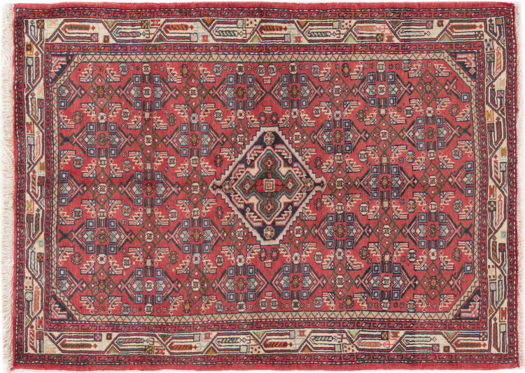Carpet ID: 296051005180 Size: 147x105 cm Thickness: ap. 8 mm Knot density: 200 000 - 250 000 / m² Manufacturing: Knotted by hand Pile: Handspun wool Warp: Cotton Origin: Persia Age: New Weight: ap. 5 kg Also know as Huseinabad In stock: Unique - Only 1 in stock