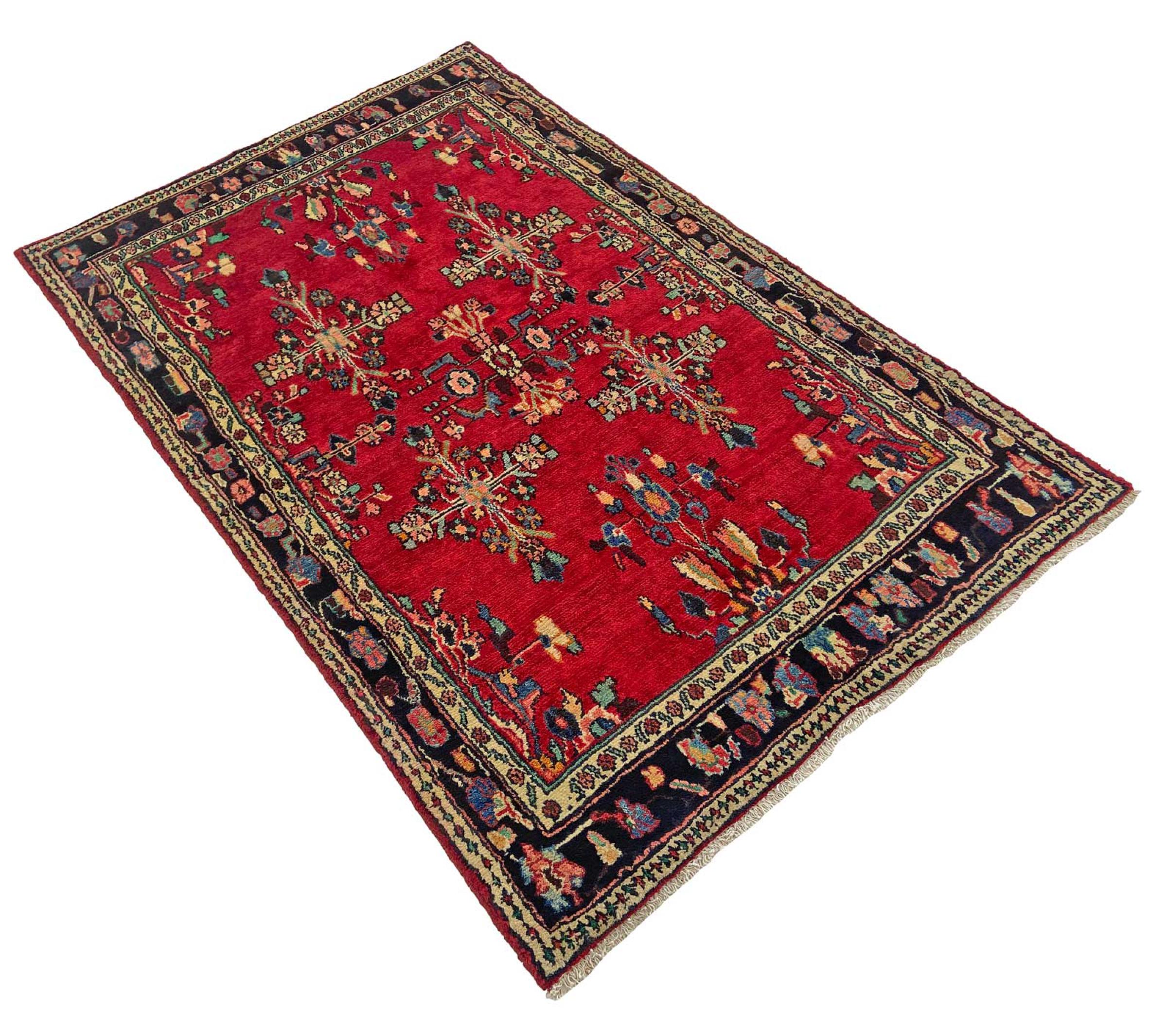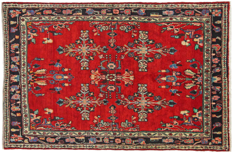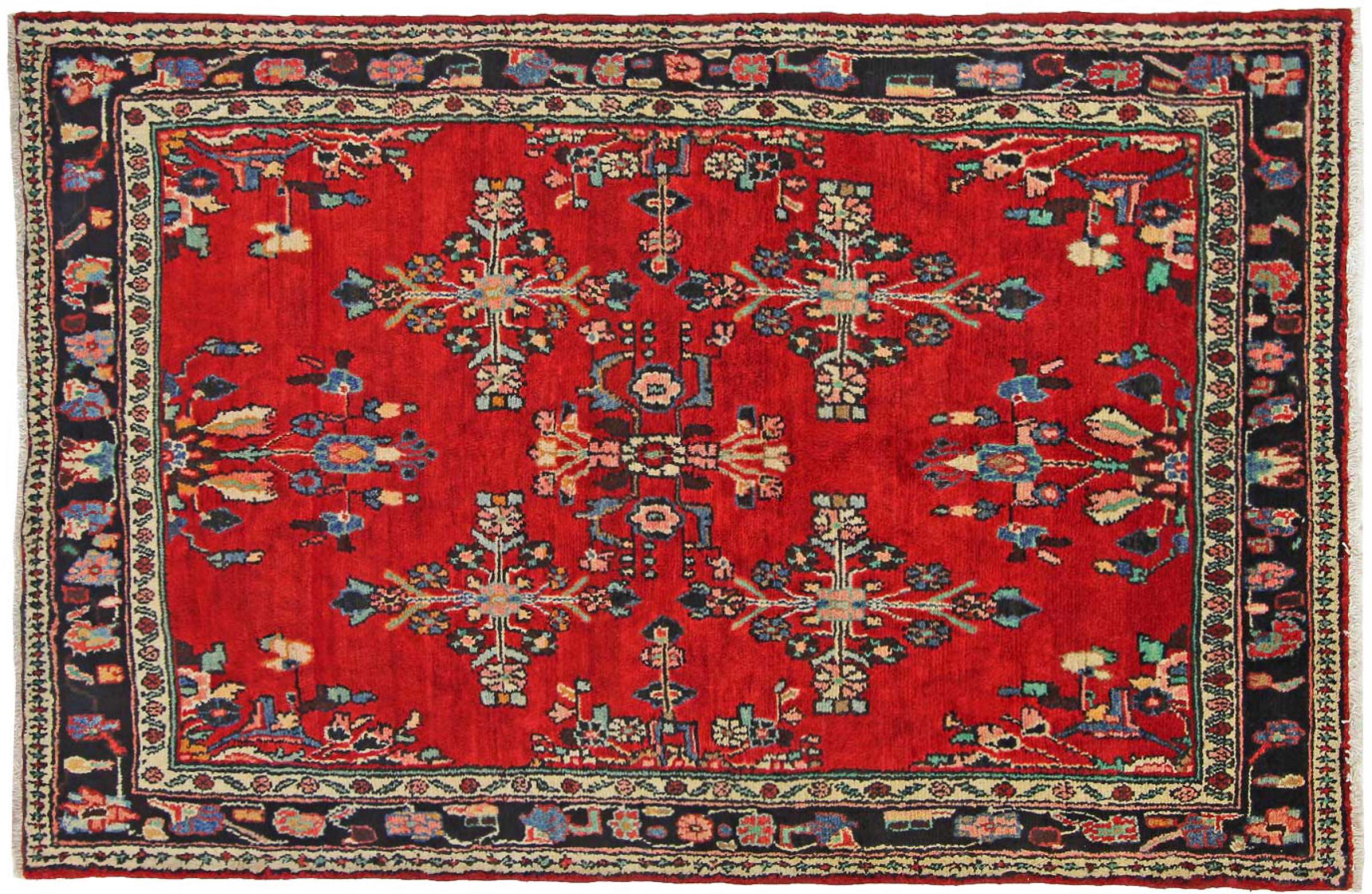 Carpet ID: 318737003365109 Size: 207x133 cm Thickness: ap. 12 mm Knot density: 128 000 - 160 000 / m² Manufacturing: Knotted by hand Pile: Handspun wool Warp: Cotton Origin: Persia Age: New Weight: ap. 11 kg Also know as Huseinabad In stock: Unique - Only 1 in stock