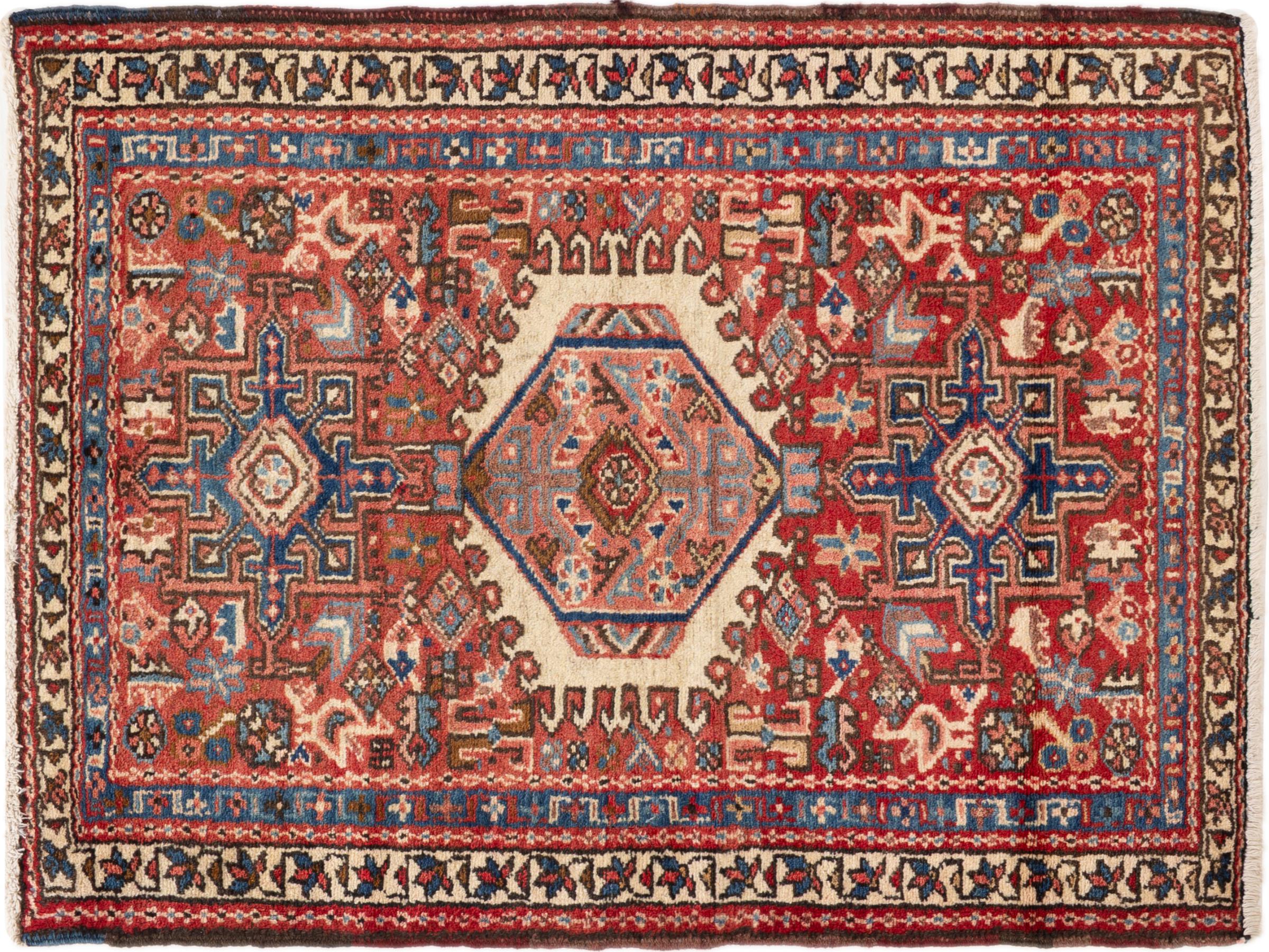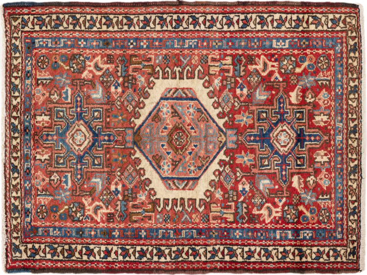 Carpet ID: 295724001699 Size: 97x70 cm Thickness: ap. 12 mm Knot density: 200 000 - 250 000 / m² Manufacturing: Knotted by hand Pile: Handspun wool Warp: Cotton Origin: Persia Age: Old/Semi antique, over 50 years Weight: ap. 2 kg In stock: Unique - Only 1 in stock