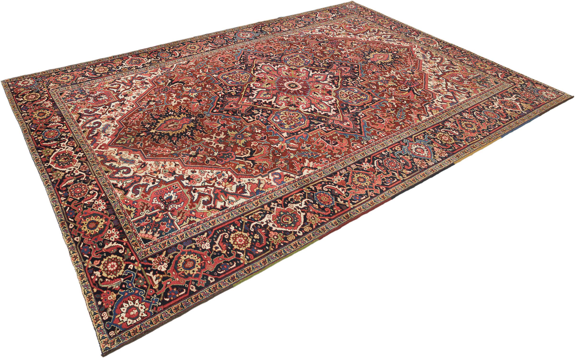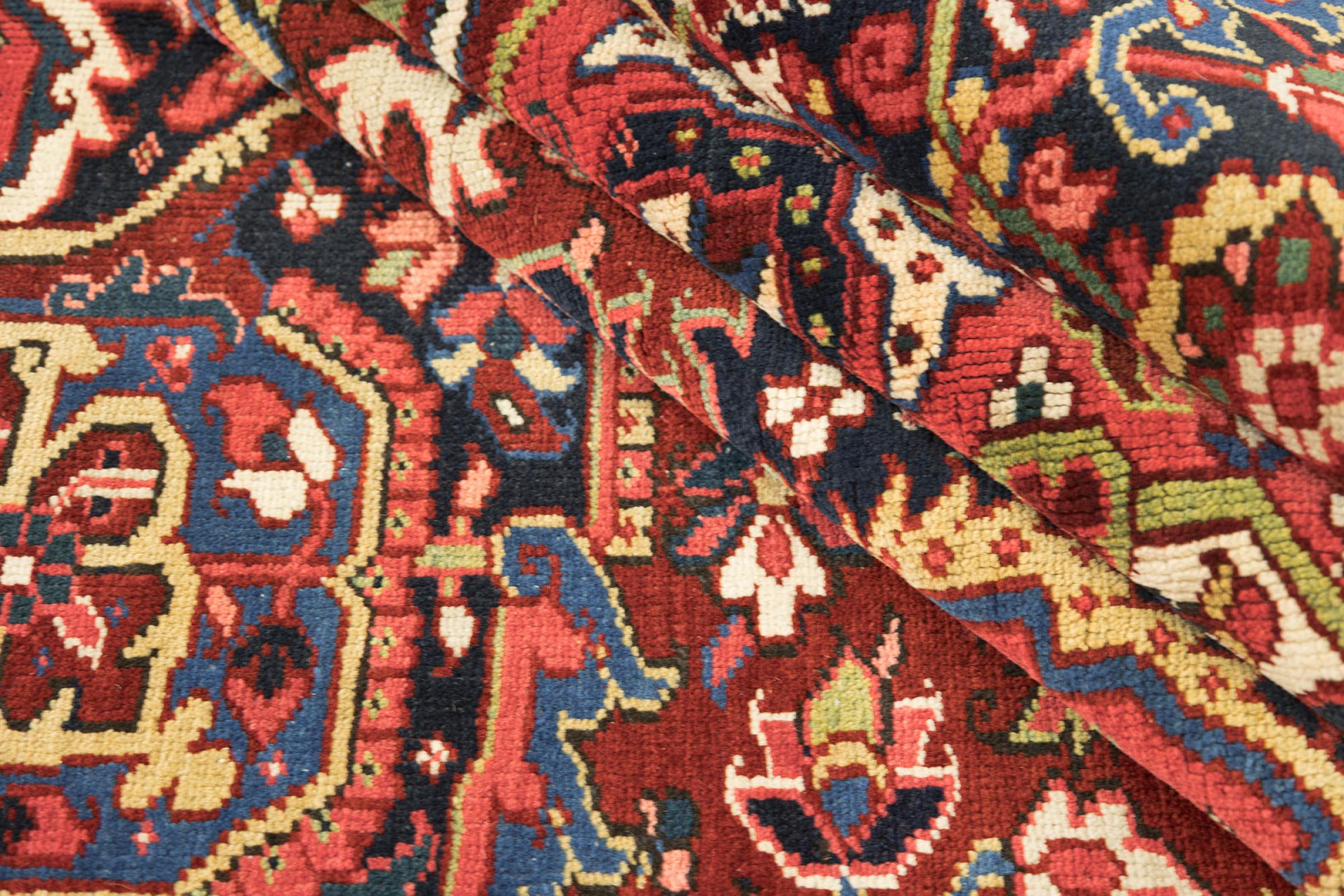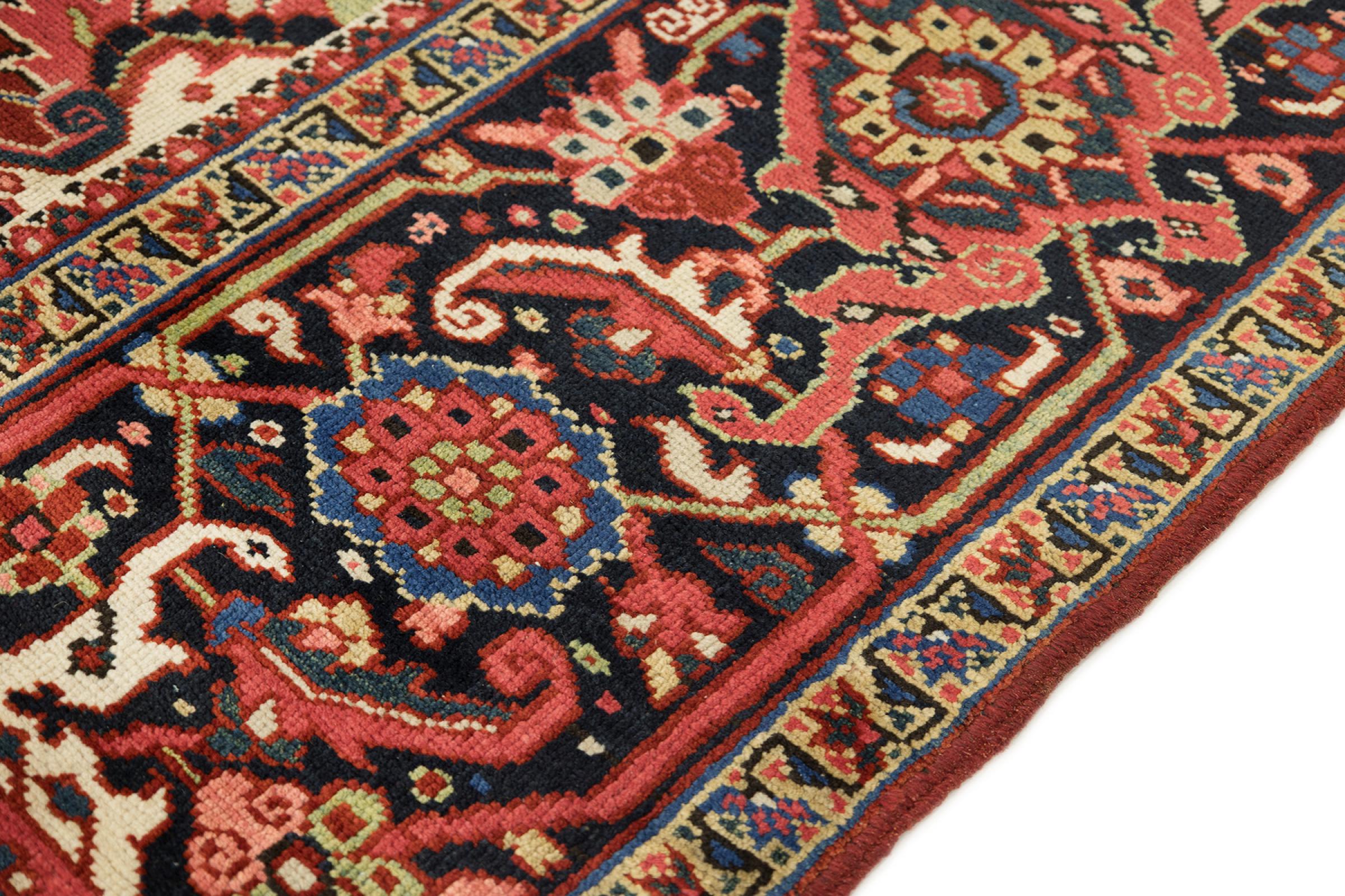 This Heriz carpet is a beautiful example of Persian carpet craftsmanship. Its rustic design is a testament to its durability. It was hand-knotted in the city of Heriz, which is located near Tabriz in north-west Iran. Anyone looking for a Persian rug that will give pleasure for a long time and is highly modern will love this Heriz. The ornaments of Heriz rugs are extremely popular today and are seen as very modern. You will never give up a rug like this again.