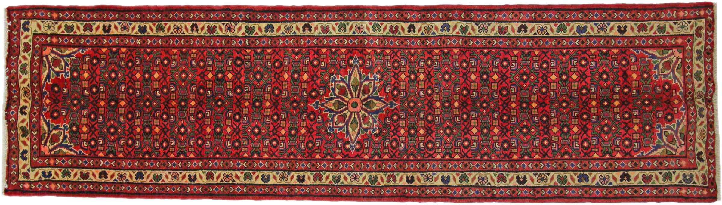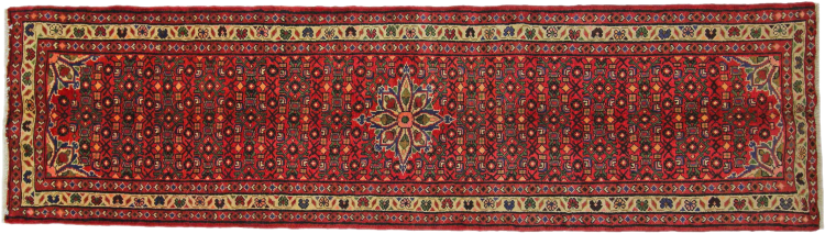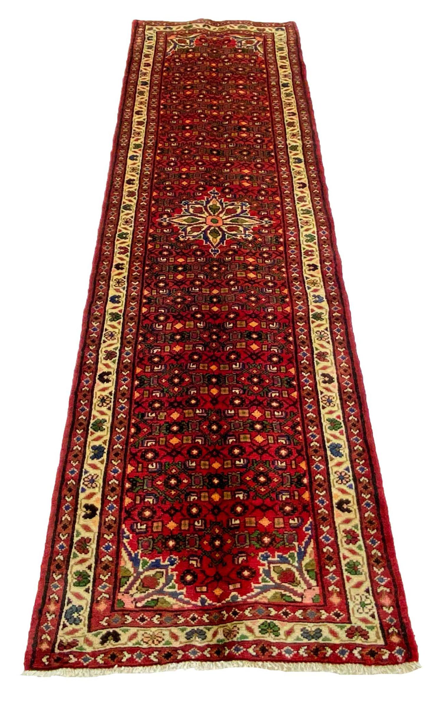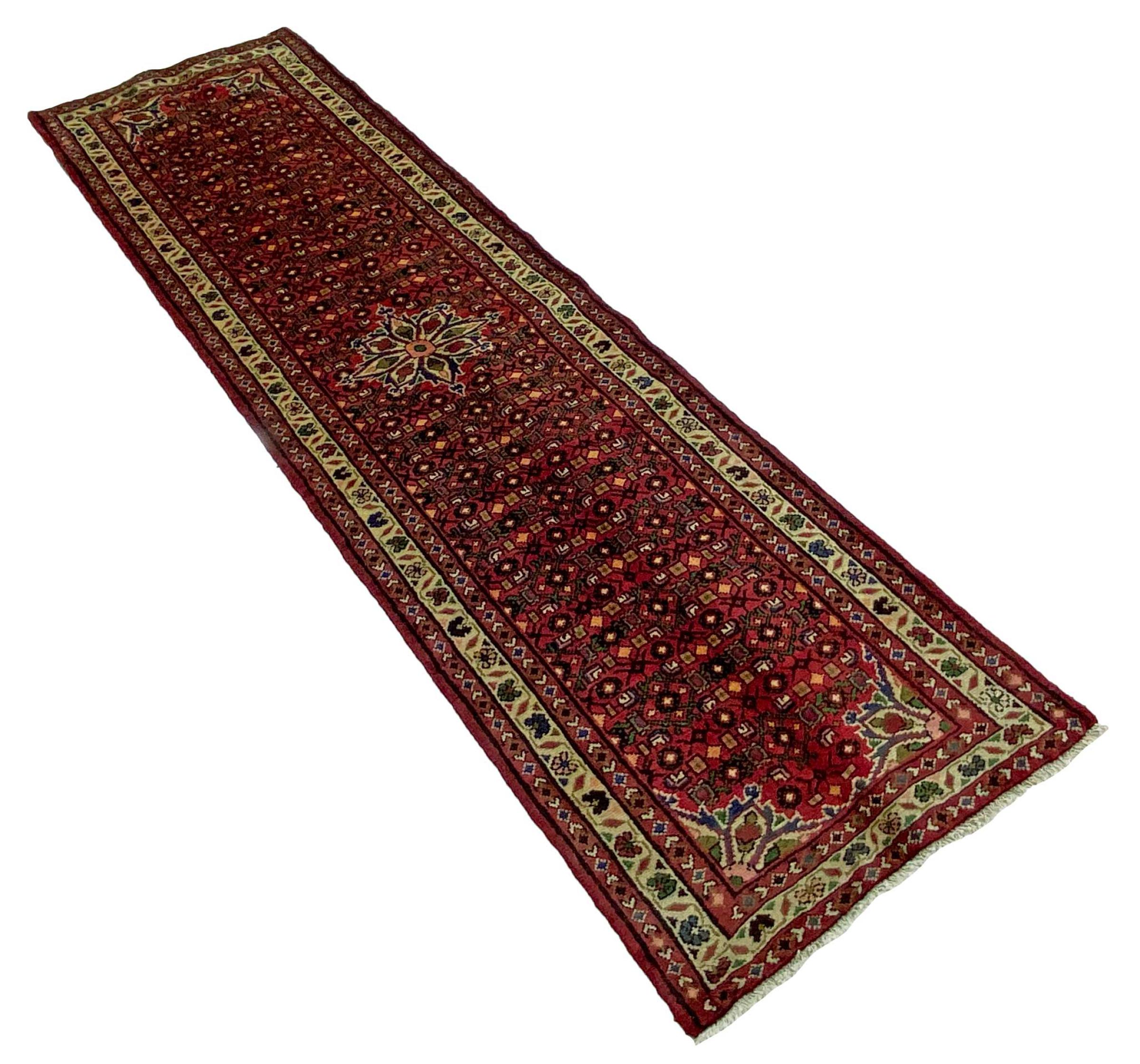 Carpet ID: 318709005605743 Size: 286x79 cm Thickness: ap. 12 mm Knot density: 128 000 - 160 000 / m² Manufacturing: Knotted by hand Pile: Handspun wool Warp: Cotton Origin: Persia Age: New Weight: ap. 8 kg Also know as Huseinabad In stock: Unique - Only 1 in stock