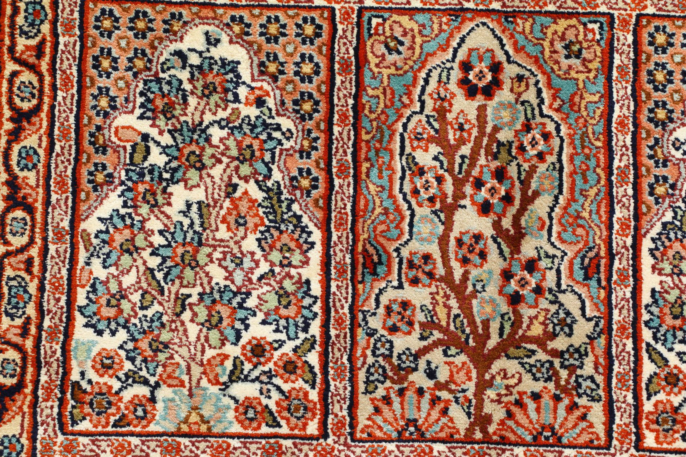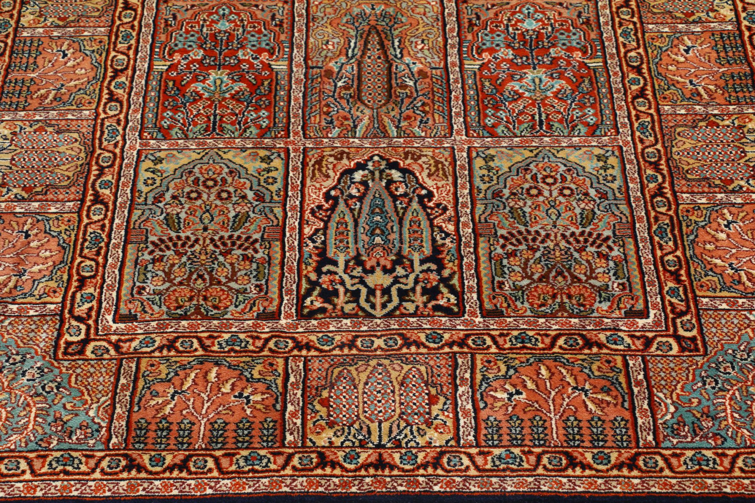 This hand-knotted silk carpet made of cashmere reflects the skills of Indian carpet weavers. The fine natural silk is a fascinating highlight. Not only does it feel particularly soft to the touch, it also lets its colours shine in a wide variety of facets. Depending on the incidence of light, completely new details and colours are visible. You can look at a carpet like this for hours and forget about time - an experience you can't capture in a photo.