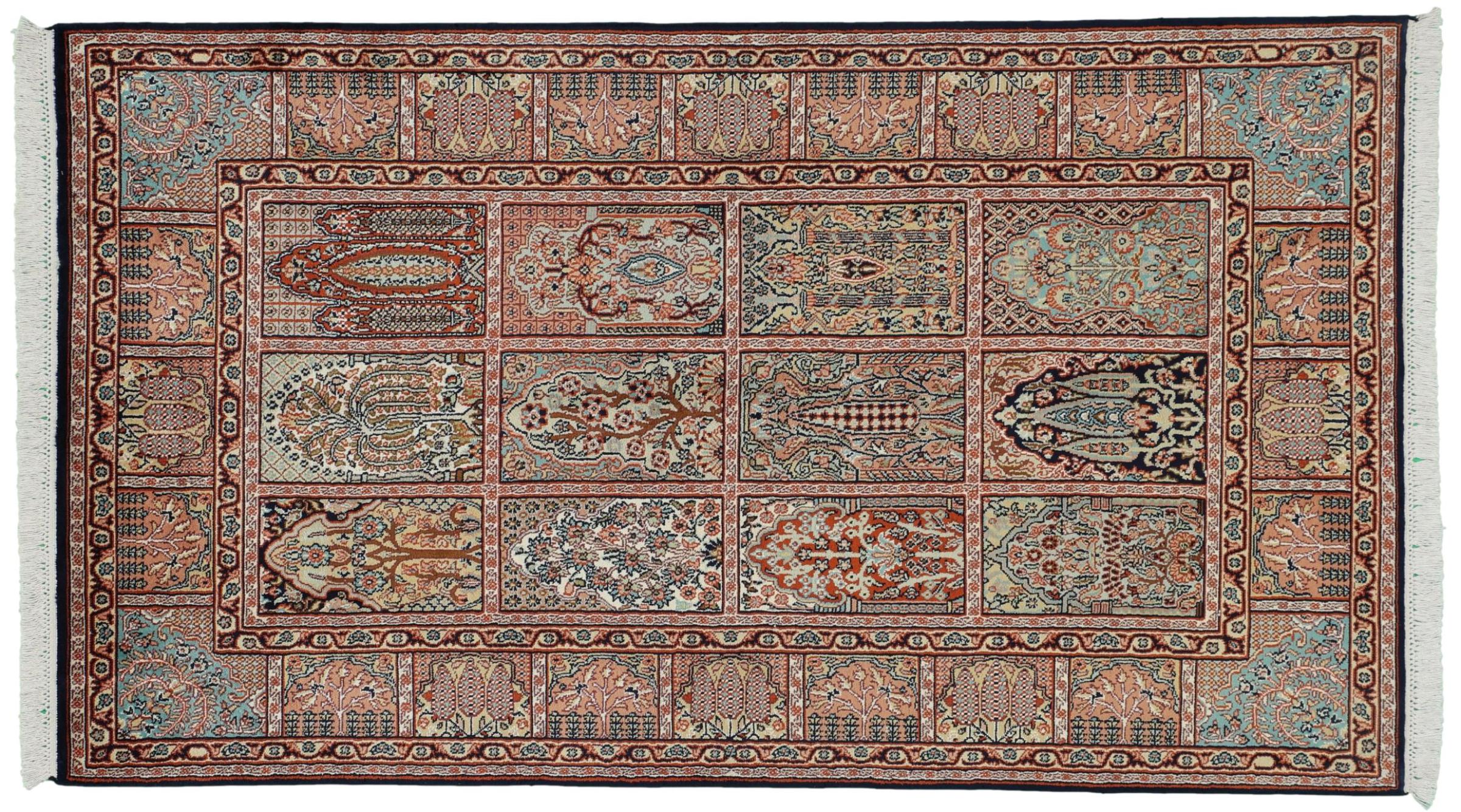 This hand-knotted silk carpet made of cashmere reflects the skills of Indian carpet weavers. The fine natural silk is a fascinating highlight. Not only does it feel particularly soft to the touch, it also lets its colours shine in a wide variety of facets. Depending on the incidence of light, completely new details and colours are visible. You can look at a carpet like this for hours and forget about time - an experience you can't capture in a photo.