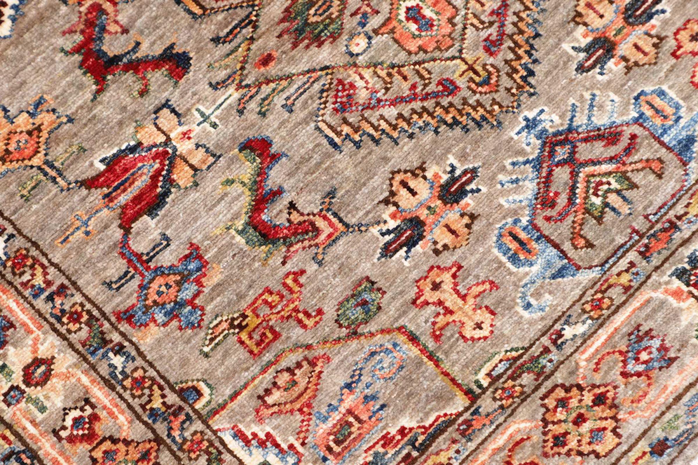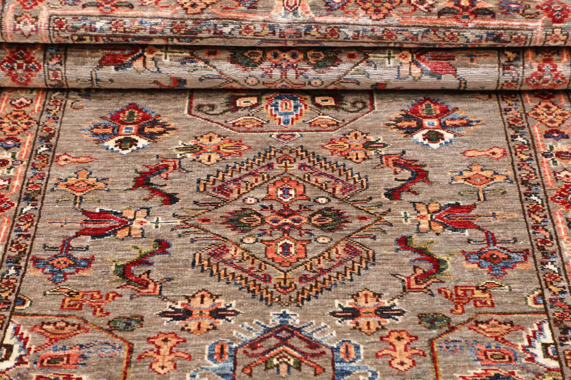 This rug is made of hand spun sheep wool of the highest quality. Especially in Iran (former Persia), Afghanistan and Pakistan wool is still spun by hand before the actual knotting of the rug begins. Wool has proven itself as a natural and extremely hard-wearing material over centuries. Among other things, it has dirt-repellent and heat-insulating properties. At the same time, wool is incomparably soft and has a natural shine.