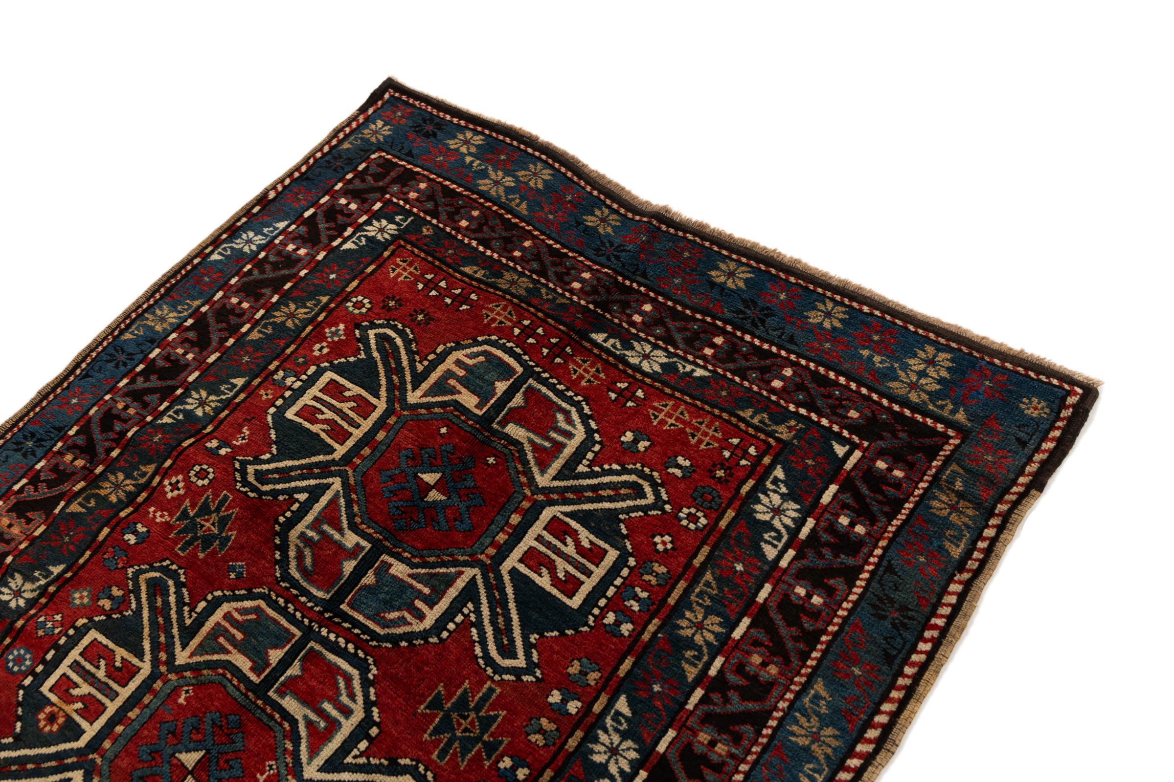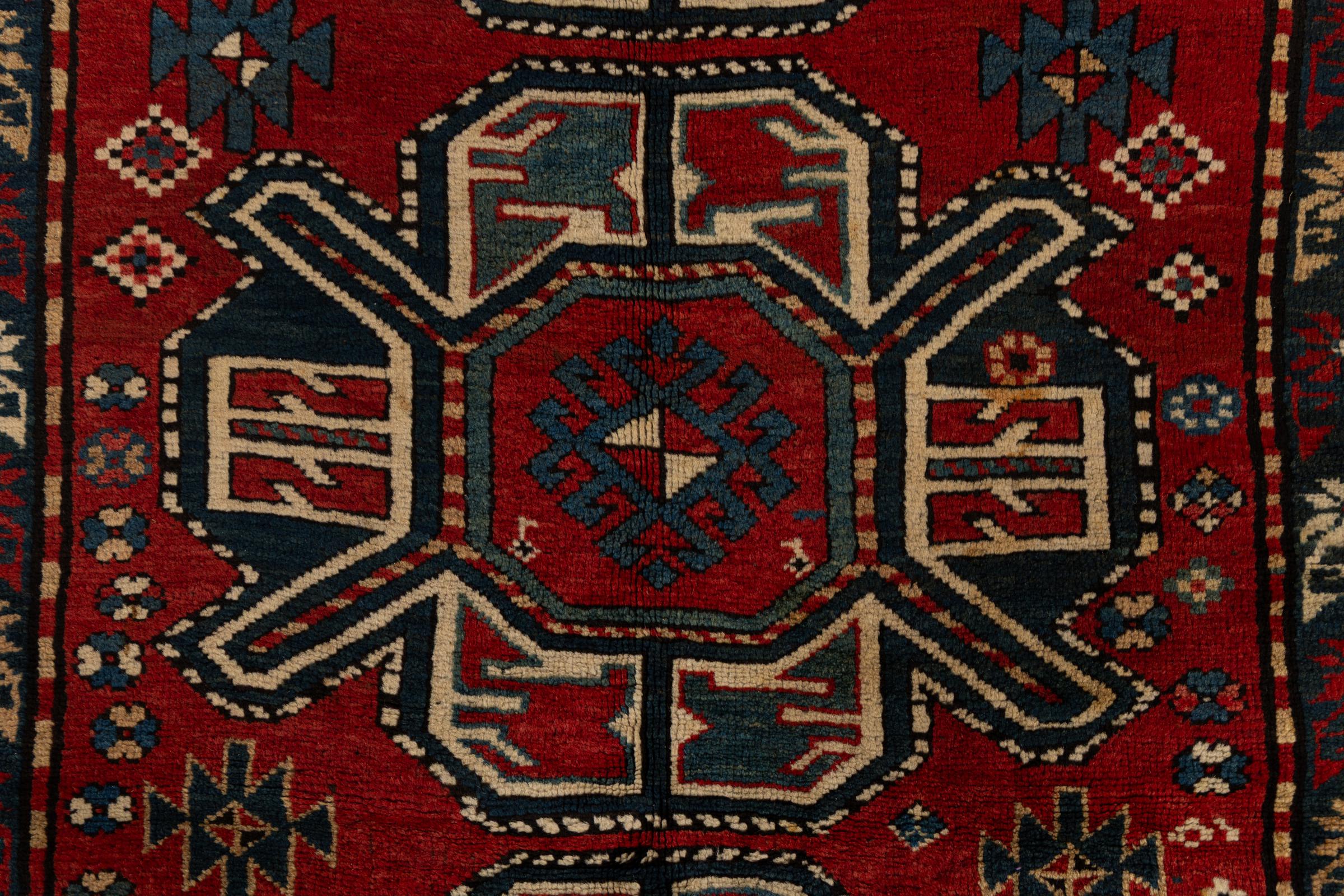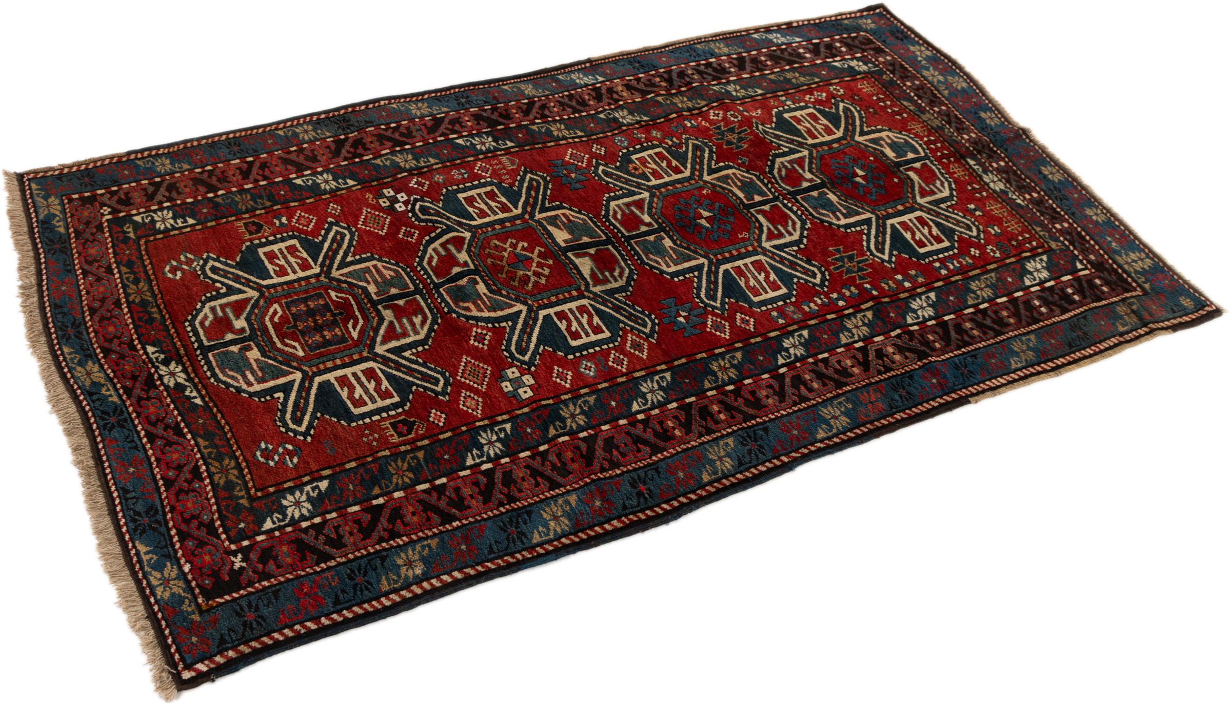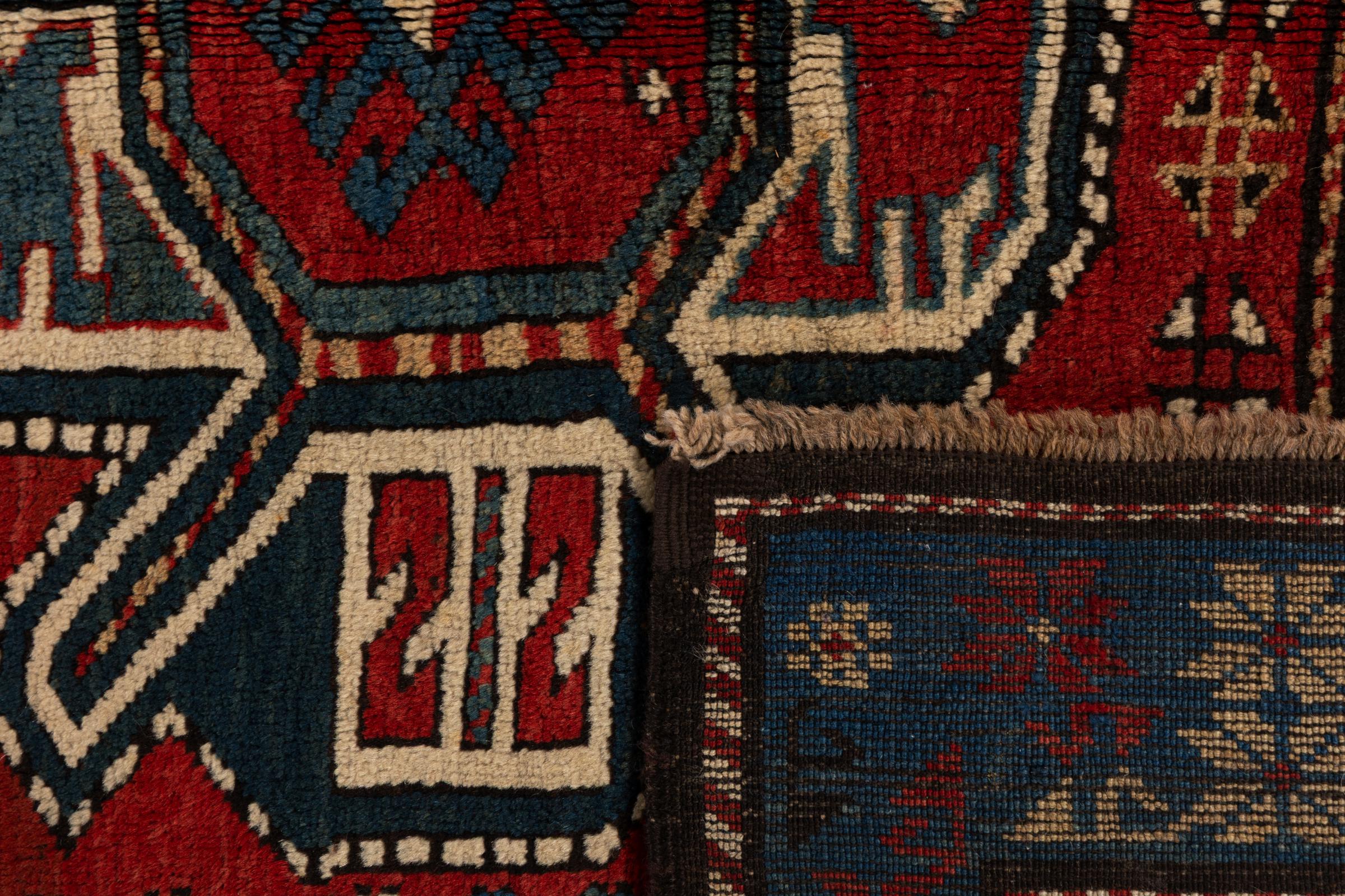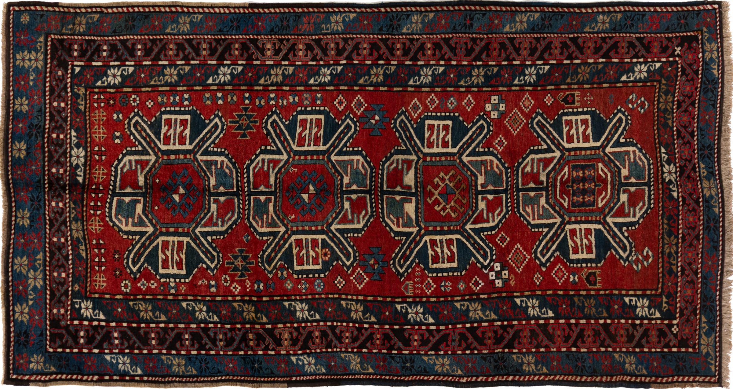 Carpet ID: 3070590023065 Size: 249x131 cm Thickness: ap. 5 mm Knot density: 200 000 - 250 000 / m² Manufacturing: Knotted by hand Pile: Sheep wool Warp: Sheep wool Condition / Conservation Perfect Origin: Azerbaijan / Russia Age: Antique, over 80 years Weight: ap. 8 kg In stock: Unique - Only 1 in stock