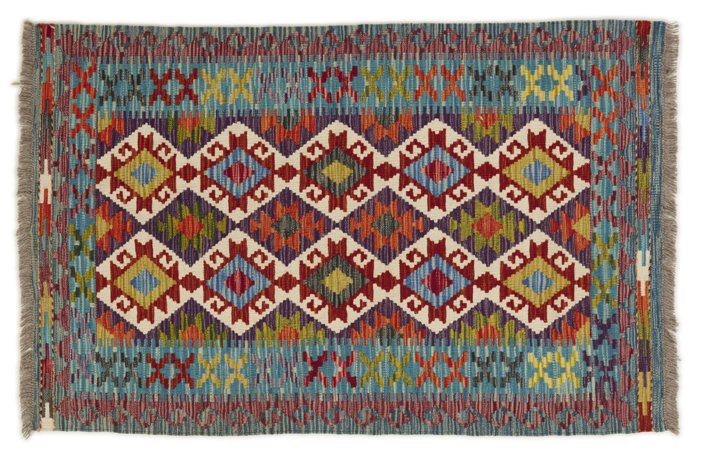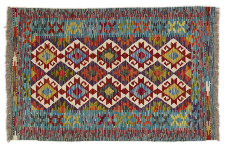 This handwoven Kilim Afghan is a wonderful and unique piece of art. Hard to believe that these modern colours and patterns have already been used centuries ago. This carpet has been woven by hand in old tradition in Afghanistan. It delivers a portion of contemporary history, which you won't find in this specific design a second time. It consists of high-grade natural wool and gives your home a personalised touch.