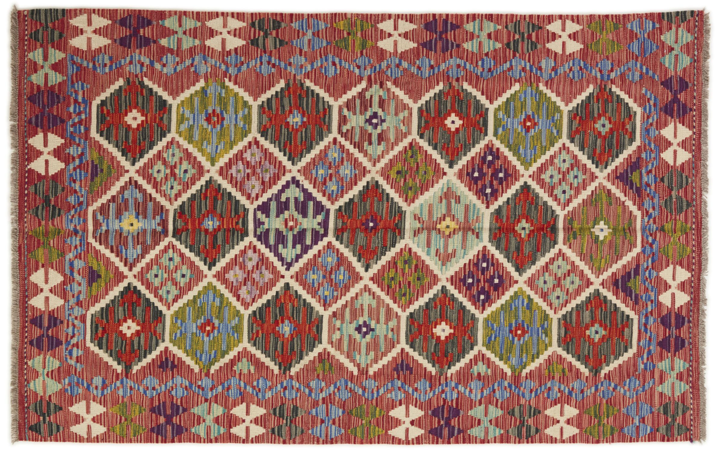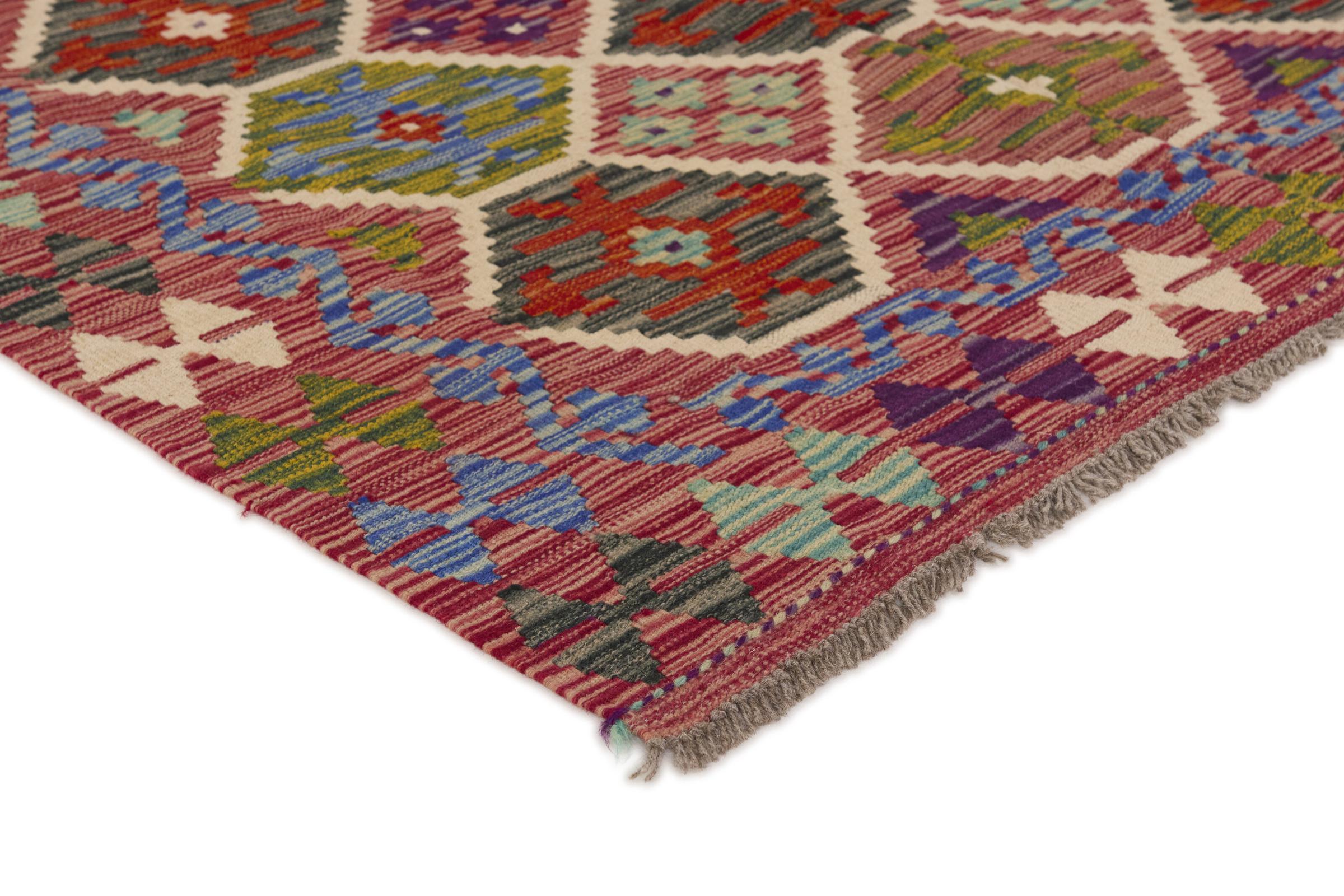 This handwoven Kilim Afghan is a wonderful and unique piece of art. Hard to believe that these modern colours and patterns have already been used centuries ago. This carpet has been woven by hand in old tradition in Afghanistan. It delivers a portion of contemporary history, which you won't find in this specific design a second time. It consists of high-grade natural wool and gives your home a personalised touch.