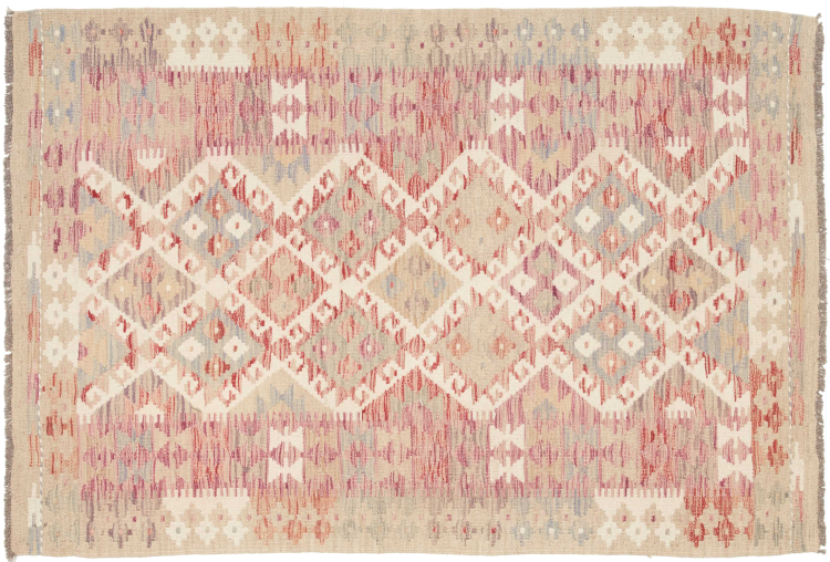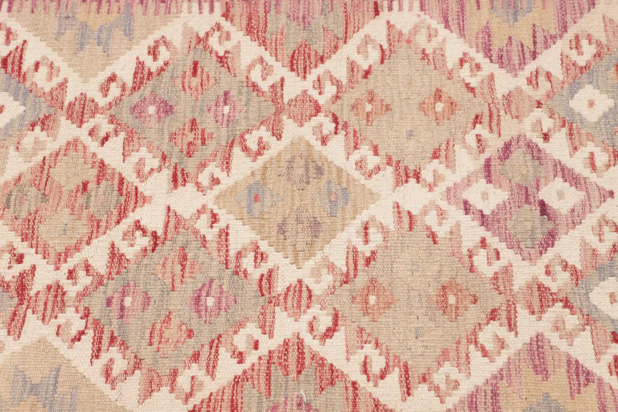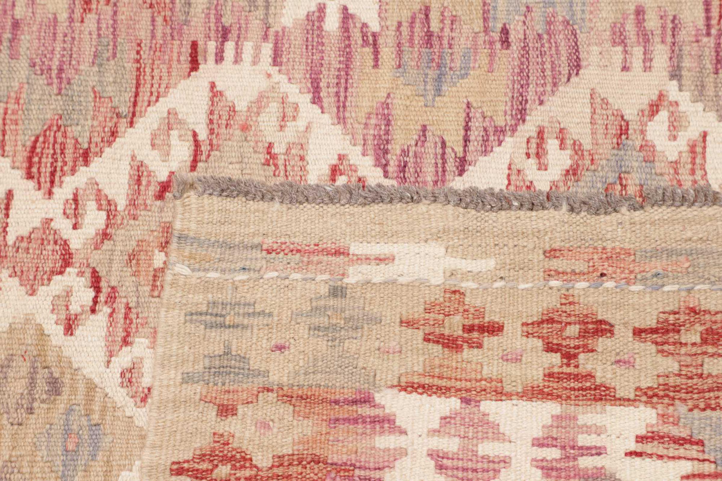 This handwoven Kilim Afghan is a wonderful and unique piece of art. Hard to believe that these modern colours and patterns have already been used centuries ago. This carpet has been woven by hand in old tradition in Afghanistan. It delivers a portion of contemporary history, which you won't find in this specific design a second time. It consists of high-grade natural wool and gives your home a personalised touch.