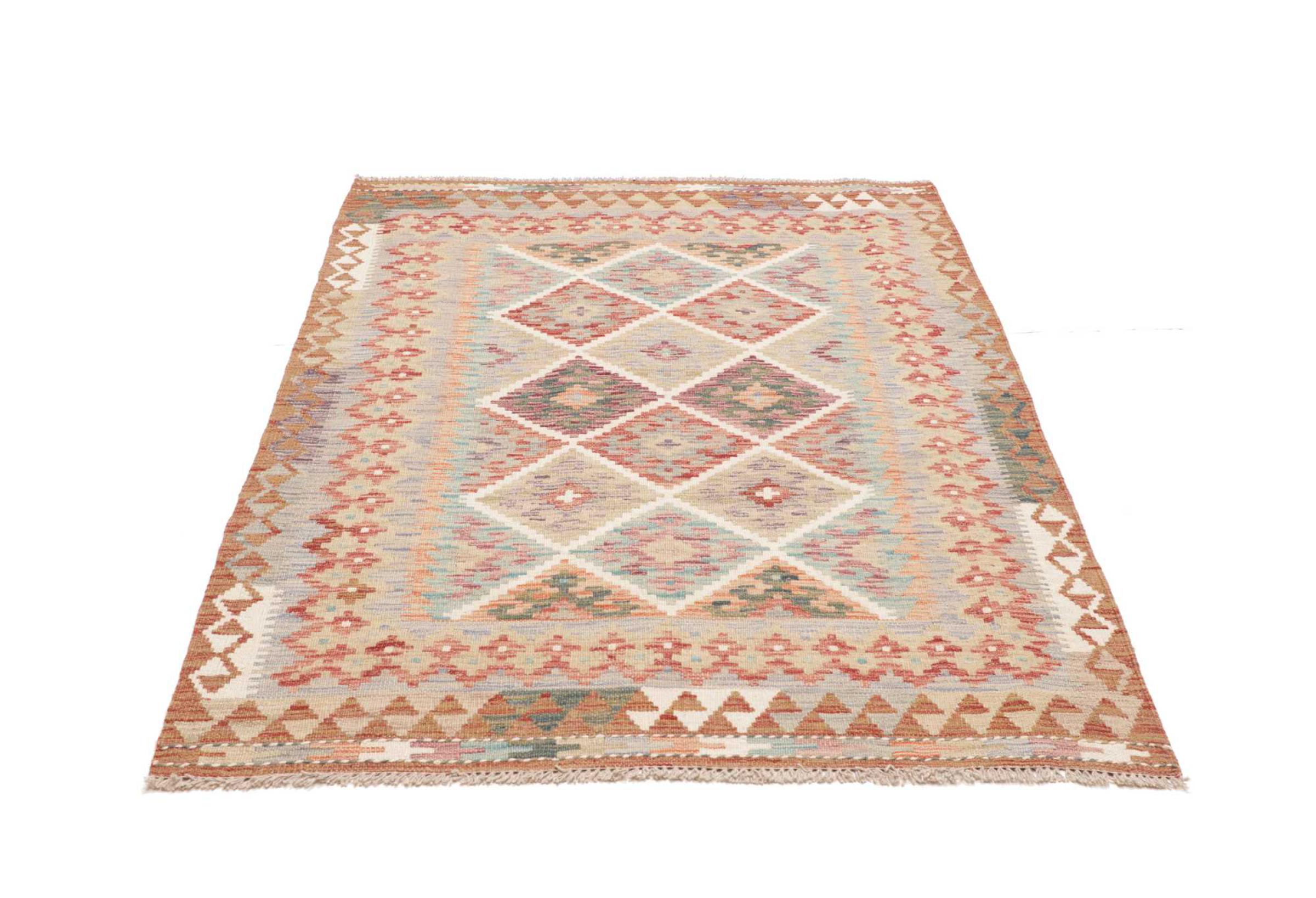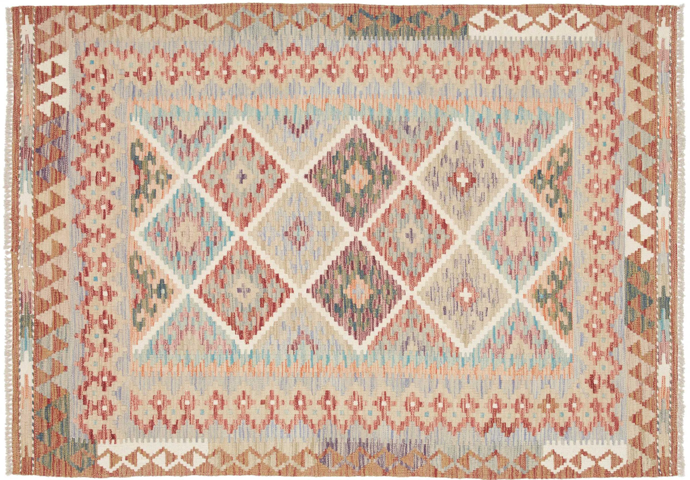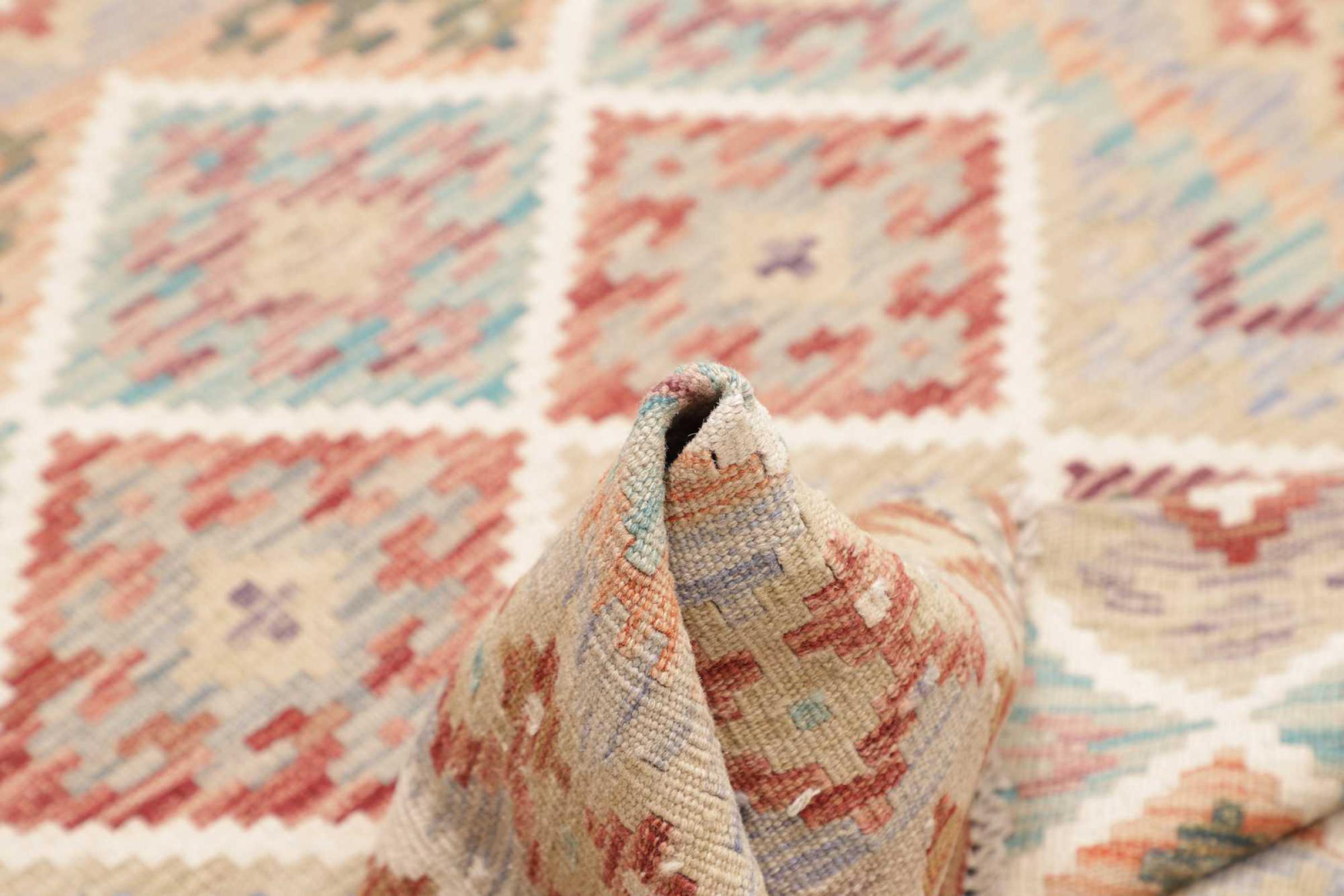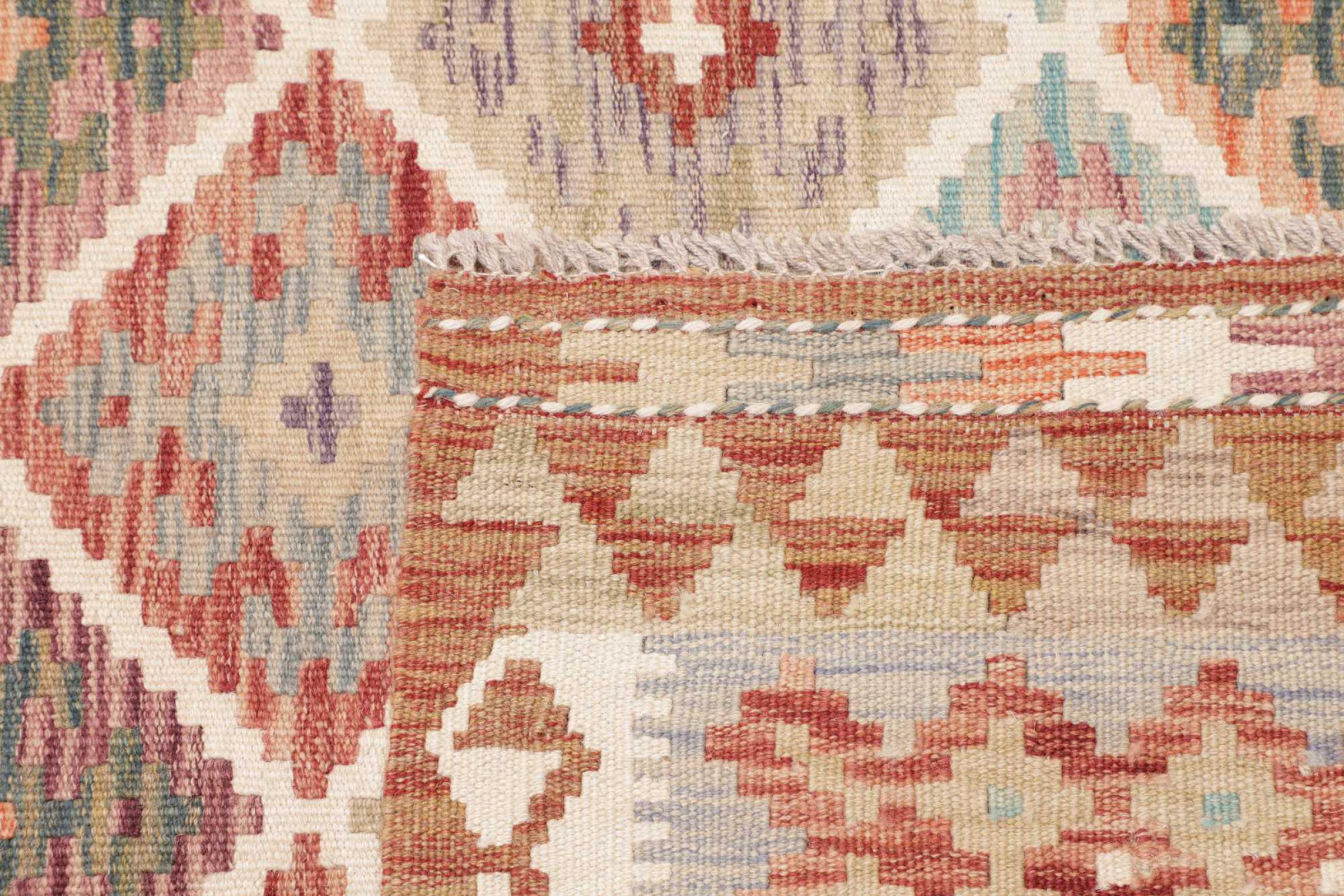 This handwoven Kilim Afghan is a wonderful and unique piece of art. Hard to believe that these modern colours and patterns have already been used centuries ago. This carpet has been woven by hand in old tradition in Afghanistan. It delivers a portion of contemporary history, which you won't find in this specific design a second time. It consists of high-grade natural wool and gives your home a personalised touch.