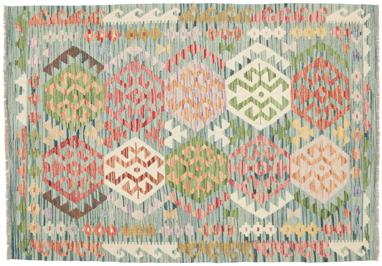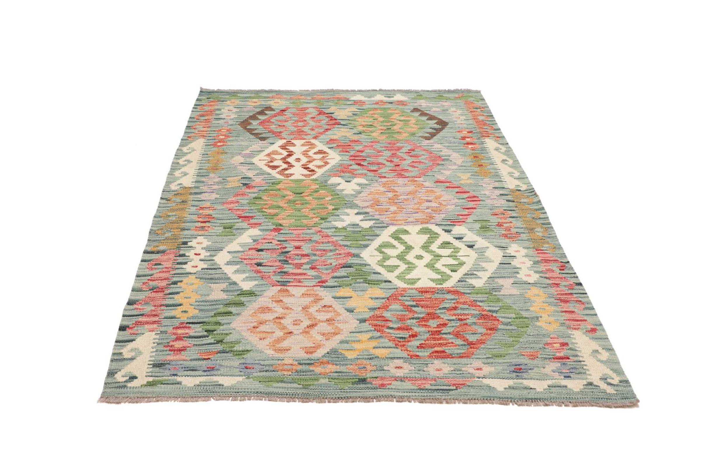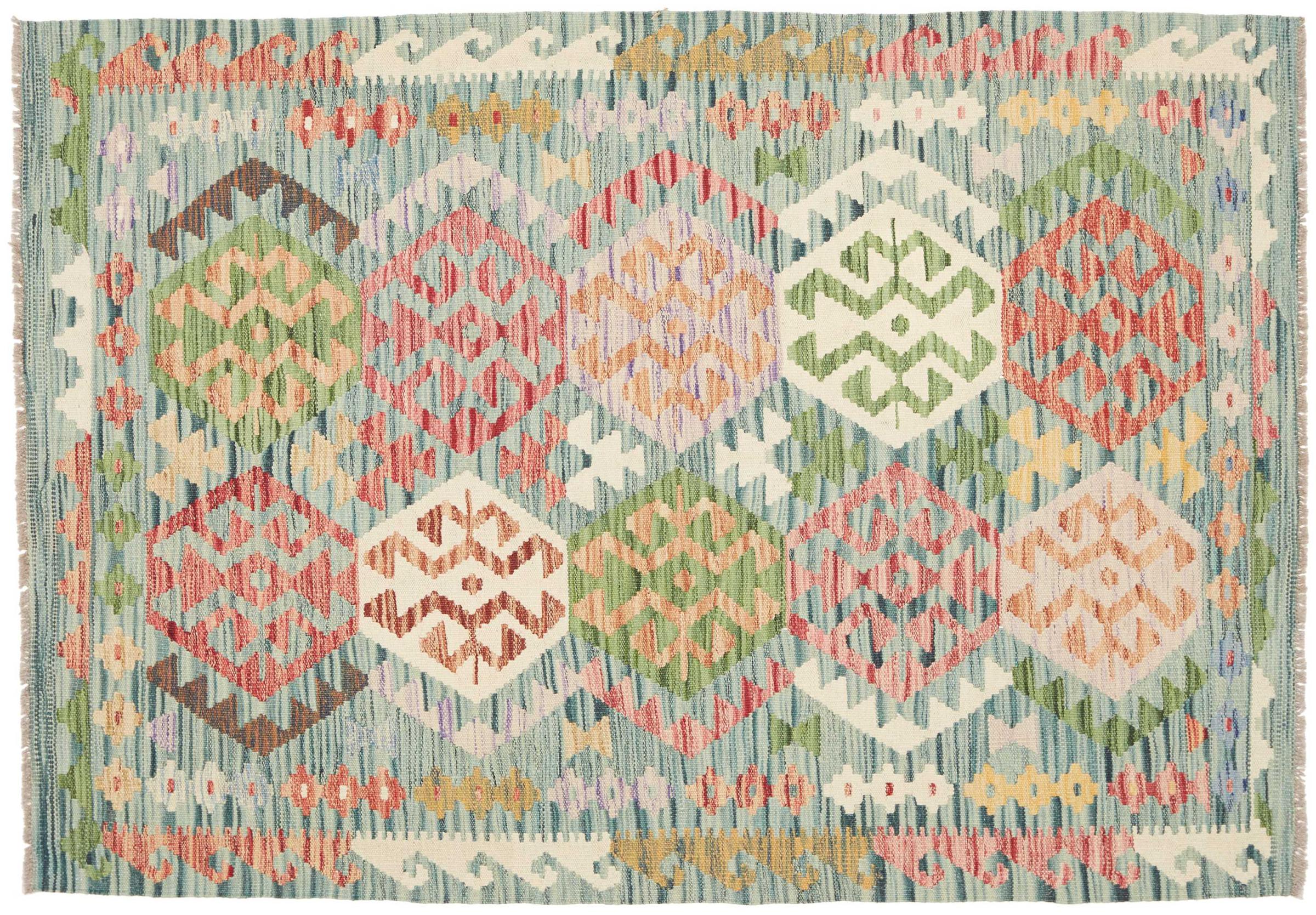 This handwoven Kilim Afghan is a wonderful and unique piece of art. Hard to believe that these modern colours and patterns have already been used centuries ago. This carpet has been woven by hand in old tradition in Afghanistan. It delivers a portion of contemporary history, which you won't find in this specific design a second time. It consists of high-grade natural wool and gives your home a personalised touch.