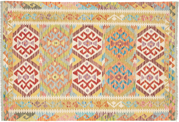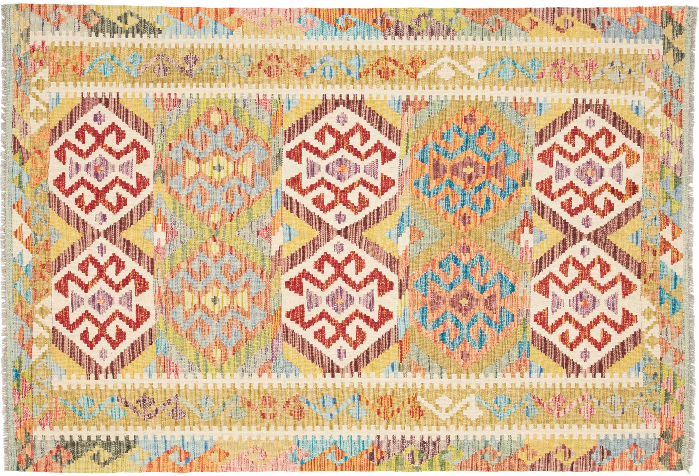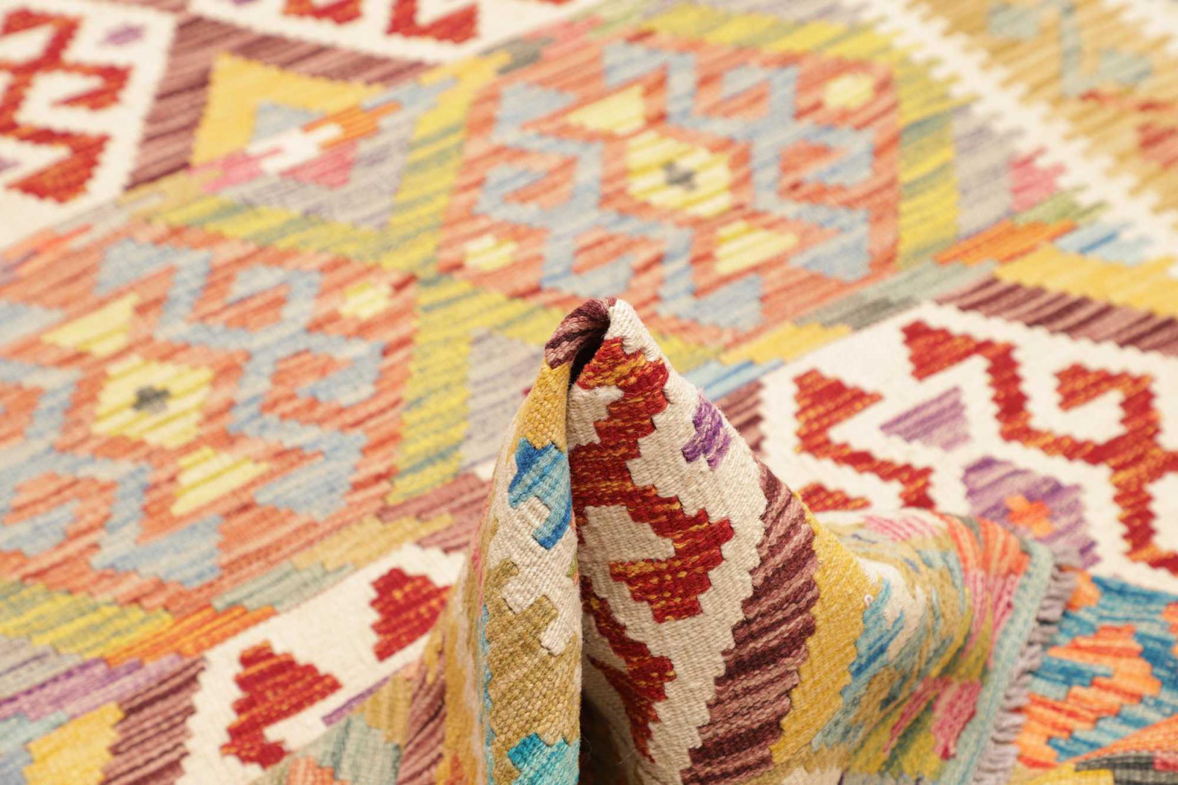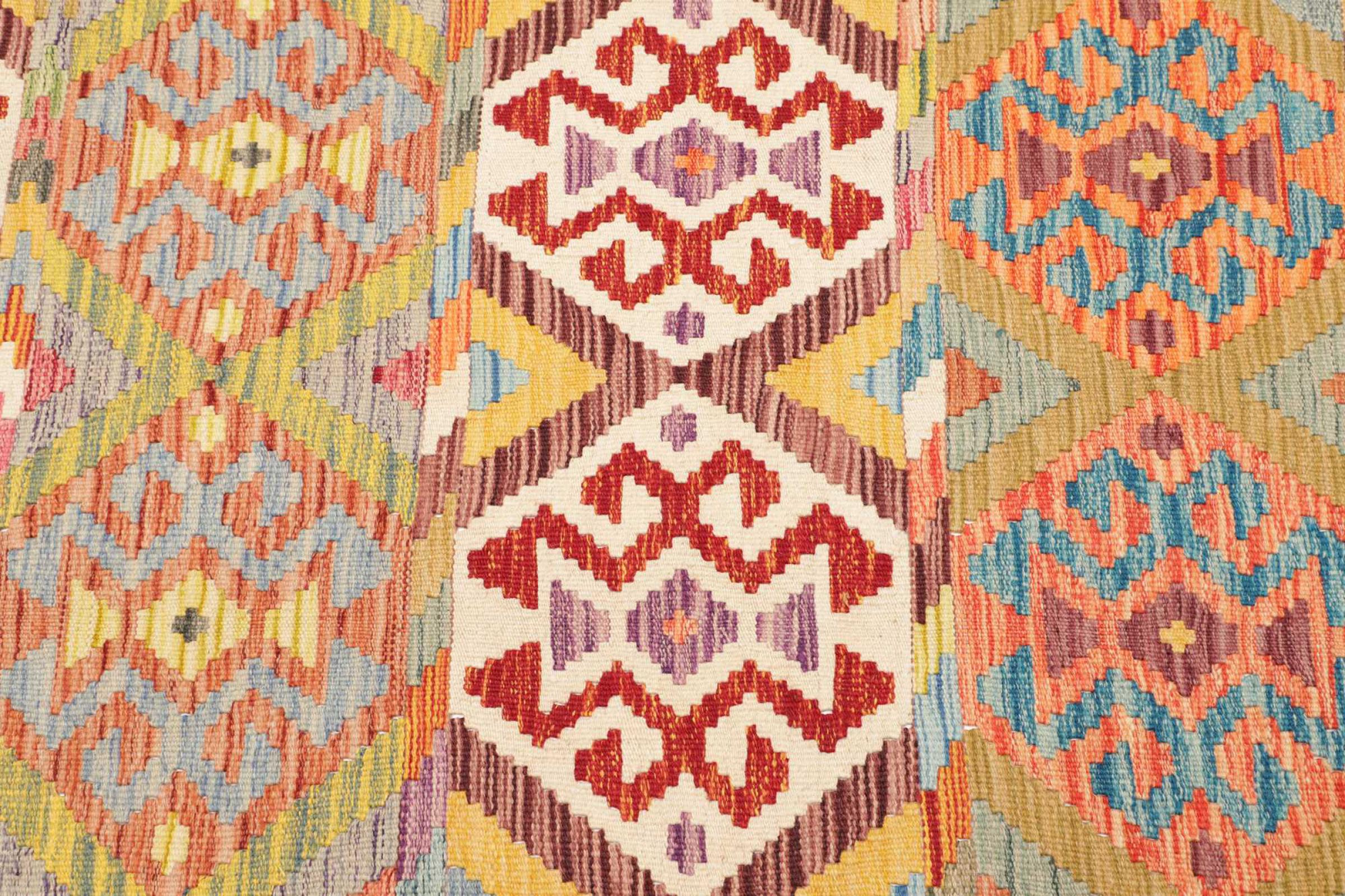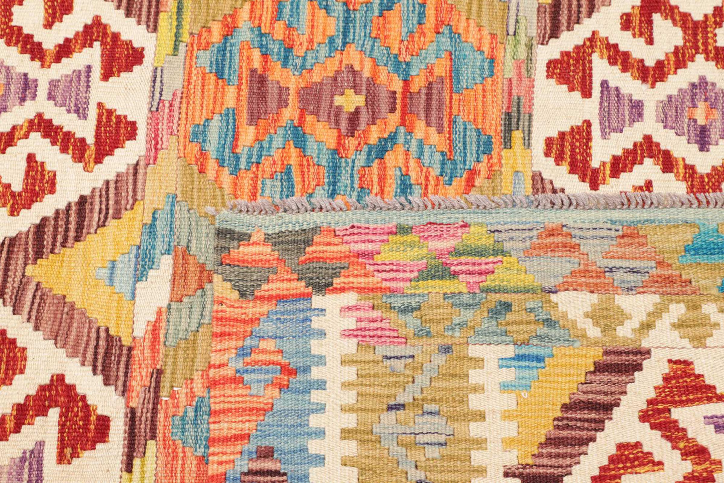 This handwoven Kilim Afghan is a wonderful and unique piece of art. Hard to believe that these modern colours and patterns have already been used centuries ago. This carpet has been woven by hand in old tradition in Afghanistan. It delivers a portion of contemporary history, which you won't find in this specific design a second time. It consists of high-grade natural wool and gives your home a personalised touch.