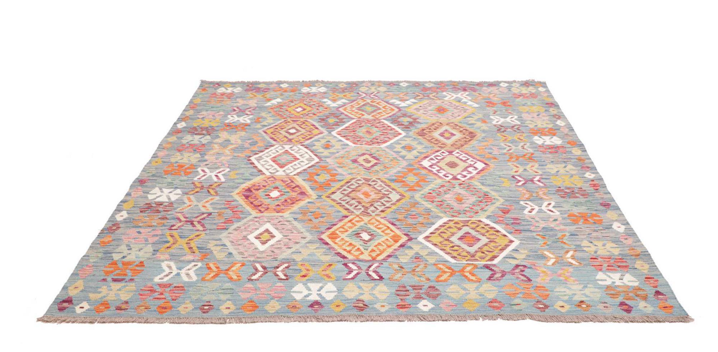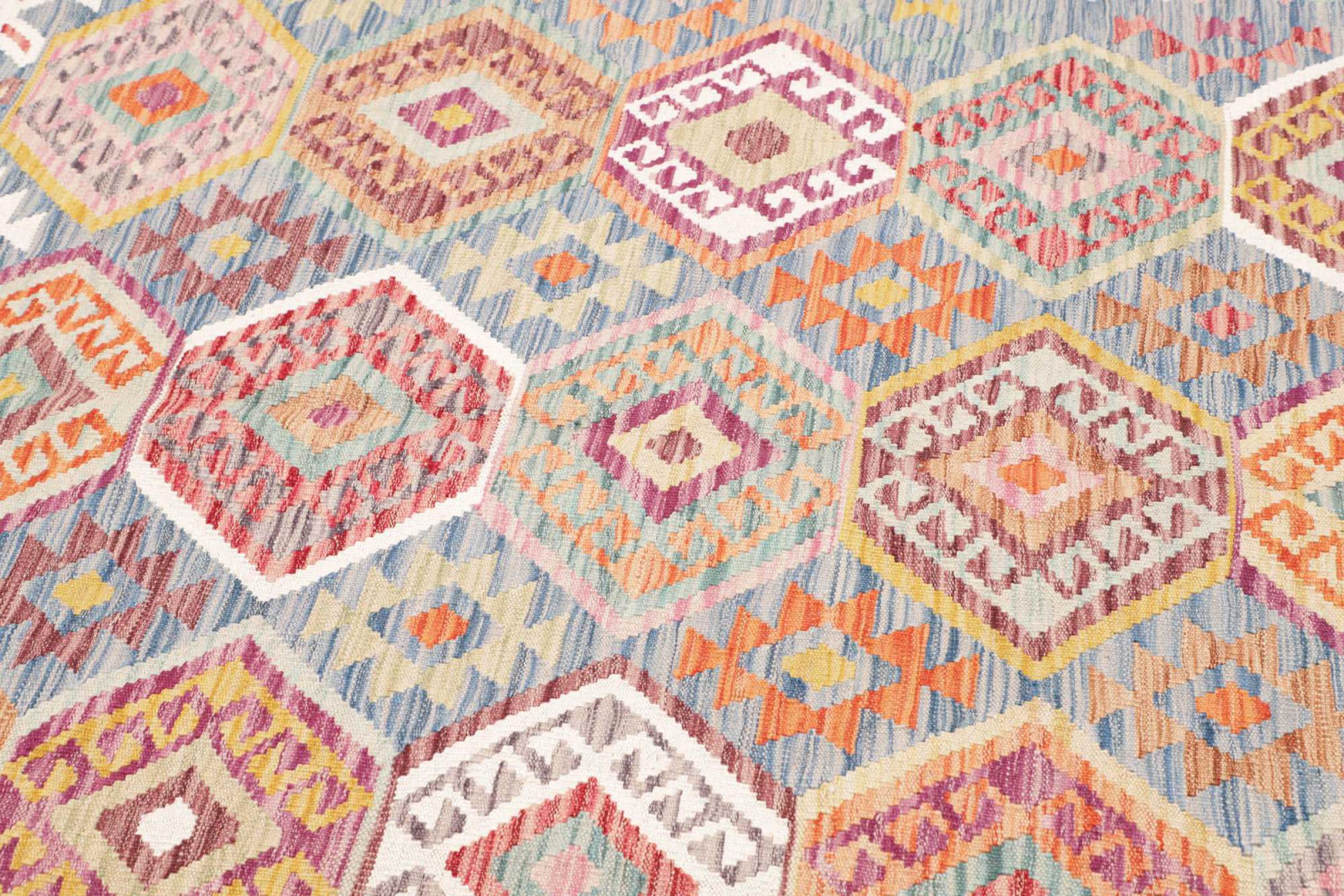 This handwoven Kilim Afghan is a wonderful and unique piece of art. Hard to believe that these modern colours and patterns have already been used centuries ago. This carpet has been woven by hand in old tradition in Afghanistan. It delivers a portion of contemporary history, which you won't find in this specific design a second time. It consists of high-grade natural wool and gives your home a personalised touch.