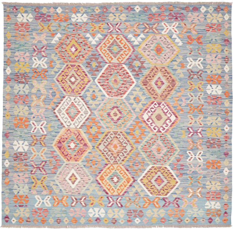 Carpet ID: 311101008579172 Size: 191x197 cm Thickness: ap. 3 mm Manufacturing: Woven by hand Pile: Handspun wool Warp: Sheep wool Origin: Afghanistan Age: New Weight: ap. 6 kg In stock: Unique - Only 1 in stock
