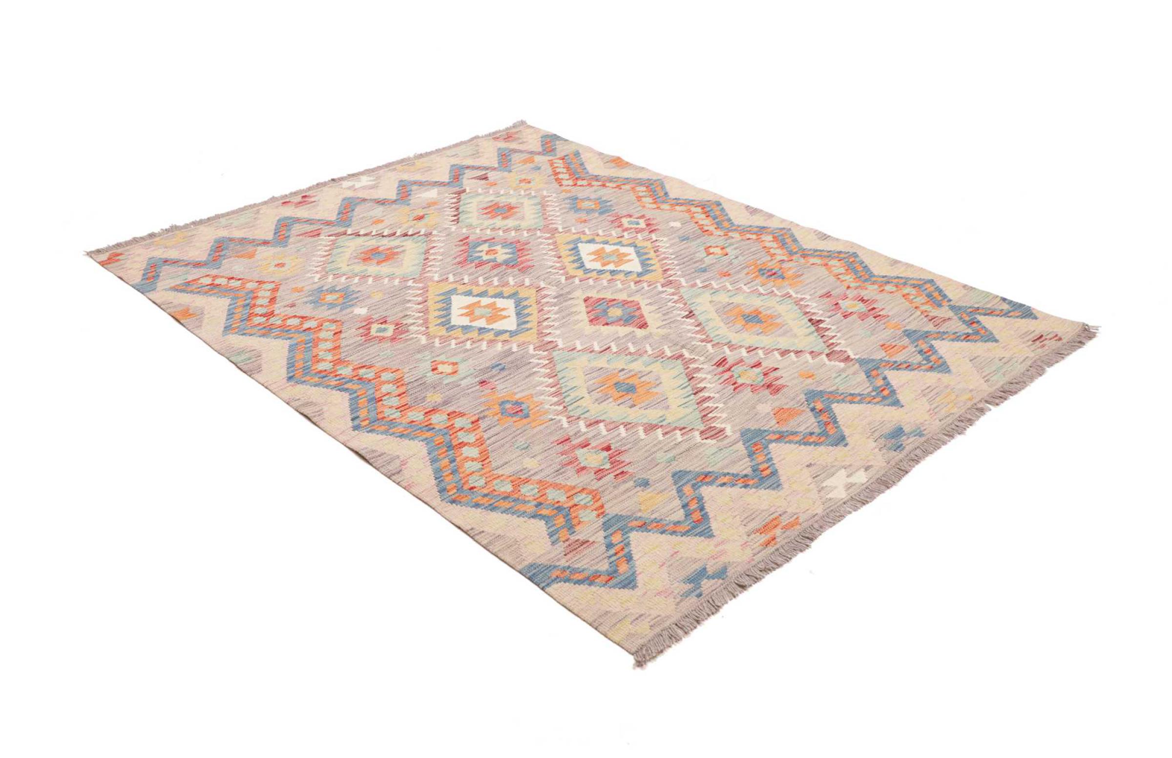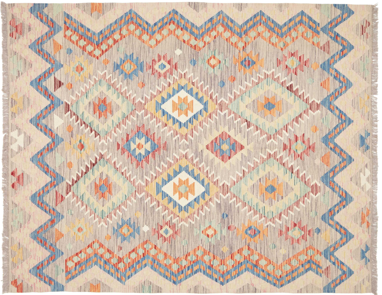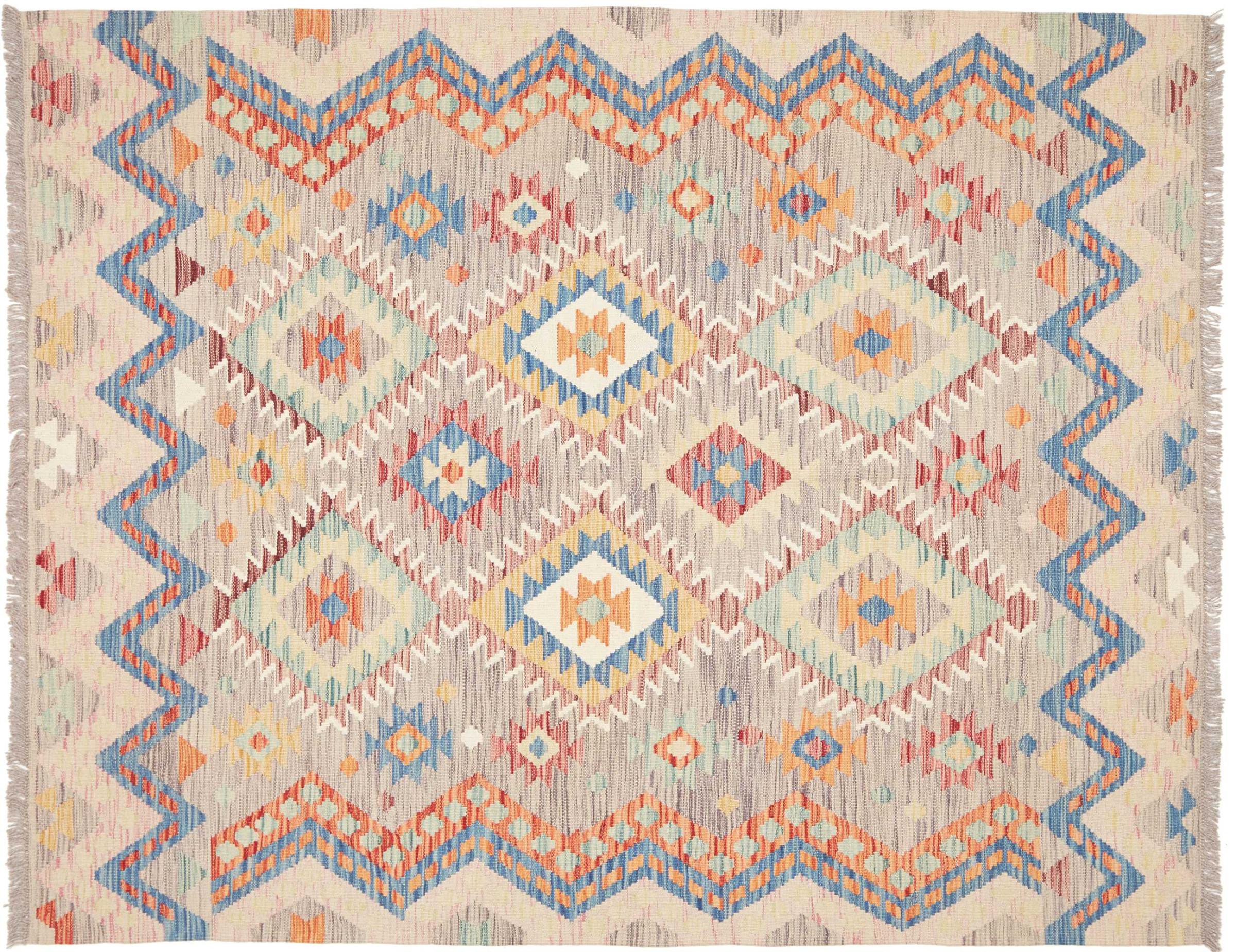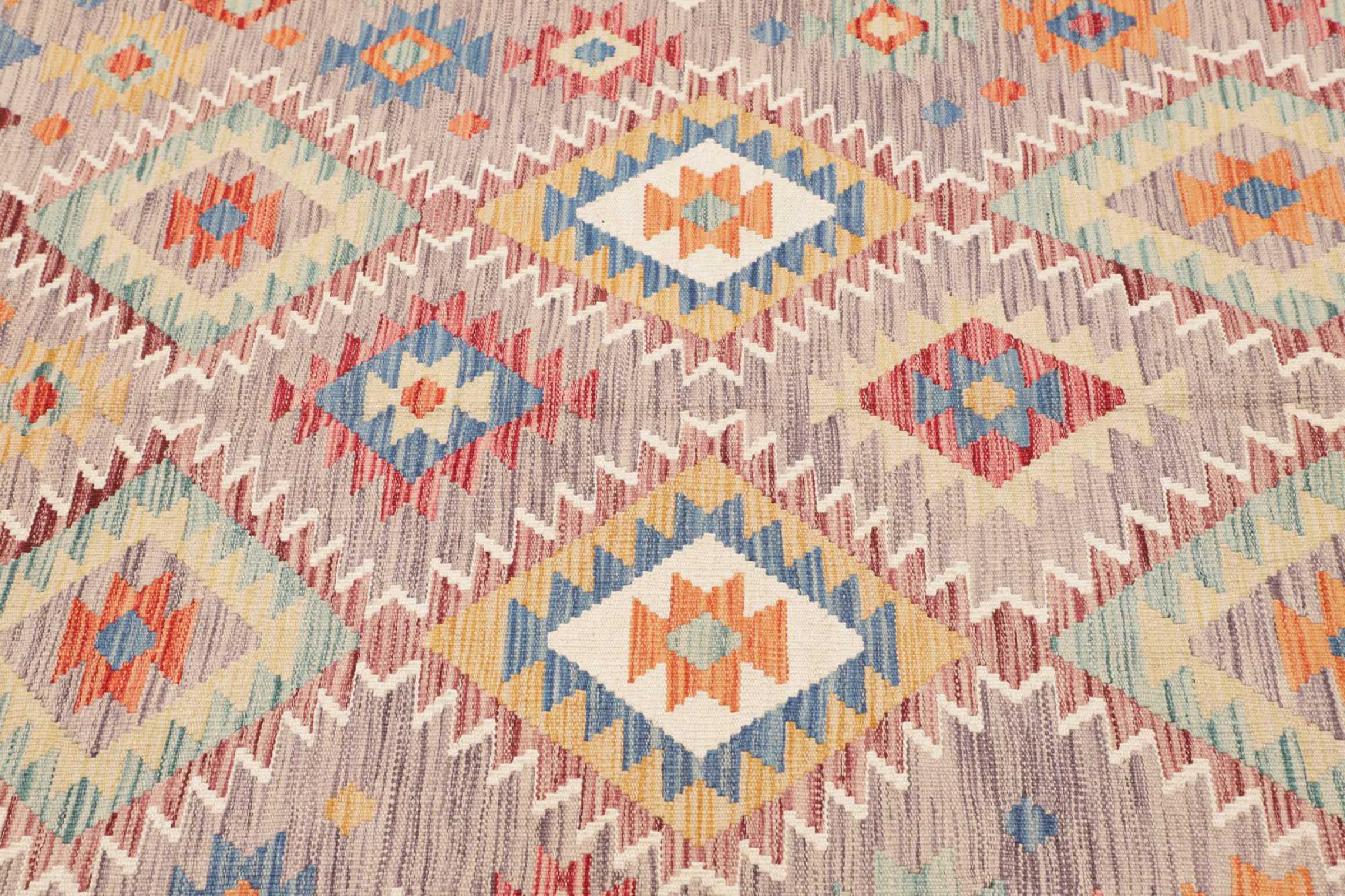 This handwoven Kilim Afghan is a wonderful and unique piece of art. Hard to believe that these modern colours and patterns have already been used centuries ago. This carpet has been woven by hand in old tradition in Afghanistan. It delivers a portion of contemporary history, which you won't find in this specific design a second time. It consists of high-grade natural wool and gives your home a personalised touch.