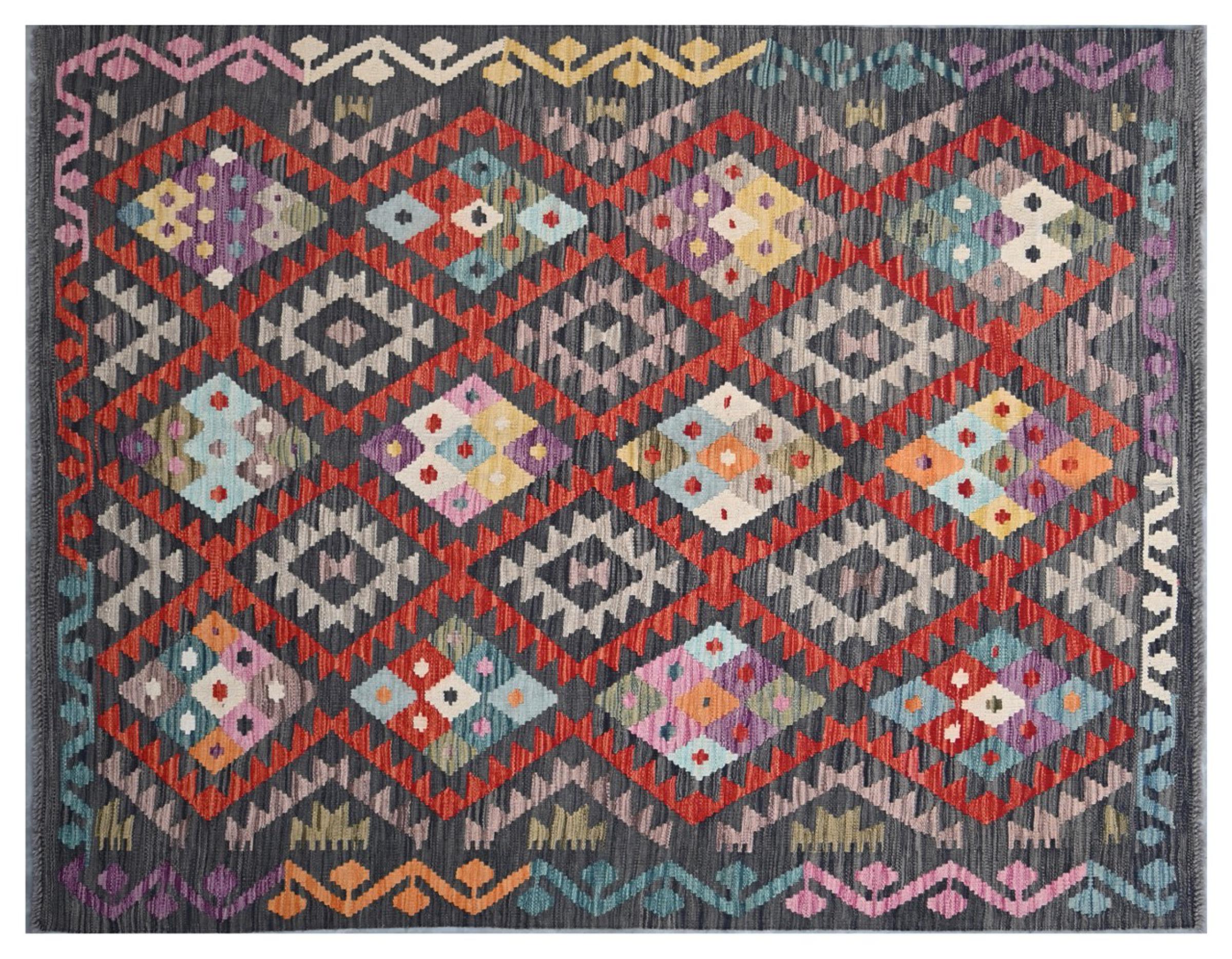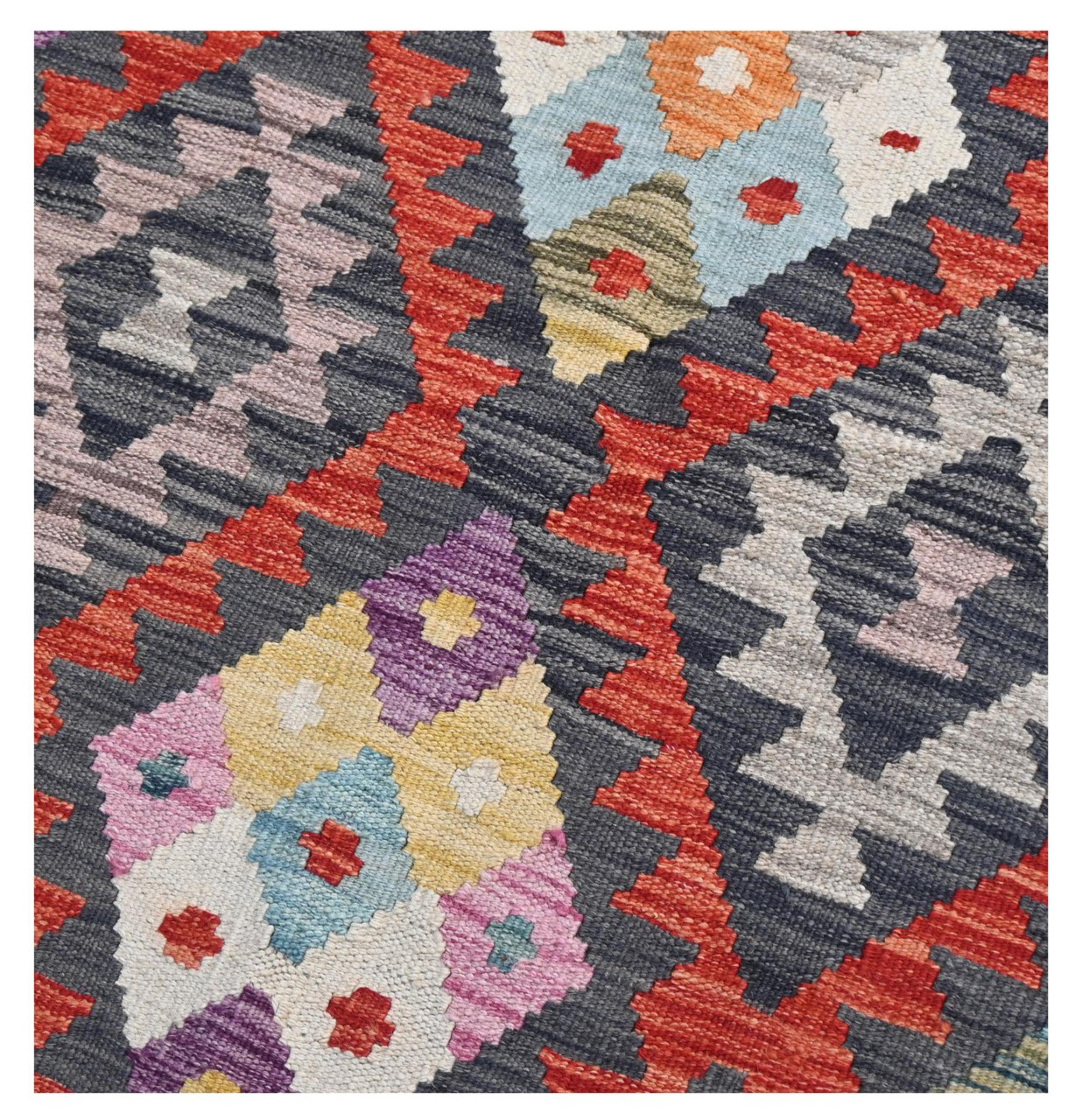This handwoven Kilim Afghan is a wonderful and unique piece of art. Hard to believe that these modern colours and patterns have already been used centuries ago. This carpet has been woven by hand in old tradition in Afghanistan. It delivers a portion of contemporary history, which you won't find in this specific design a second time. It consists of high-grade natural wool and gives your home a personalised touch.