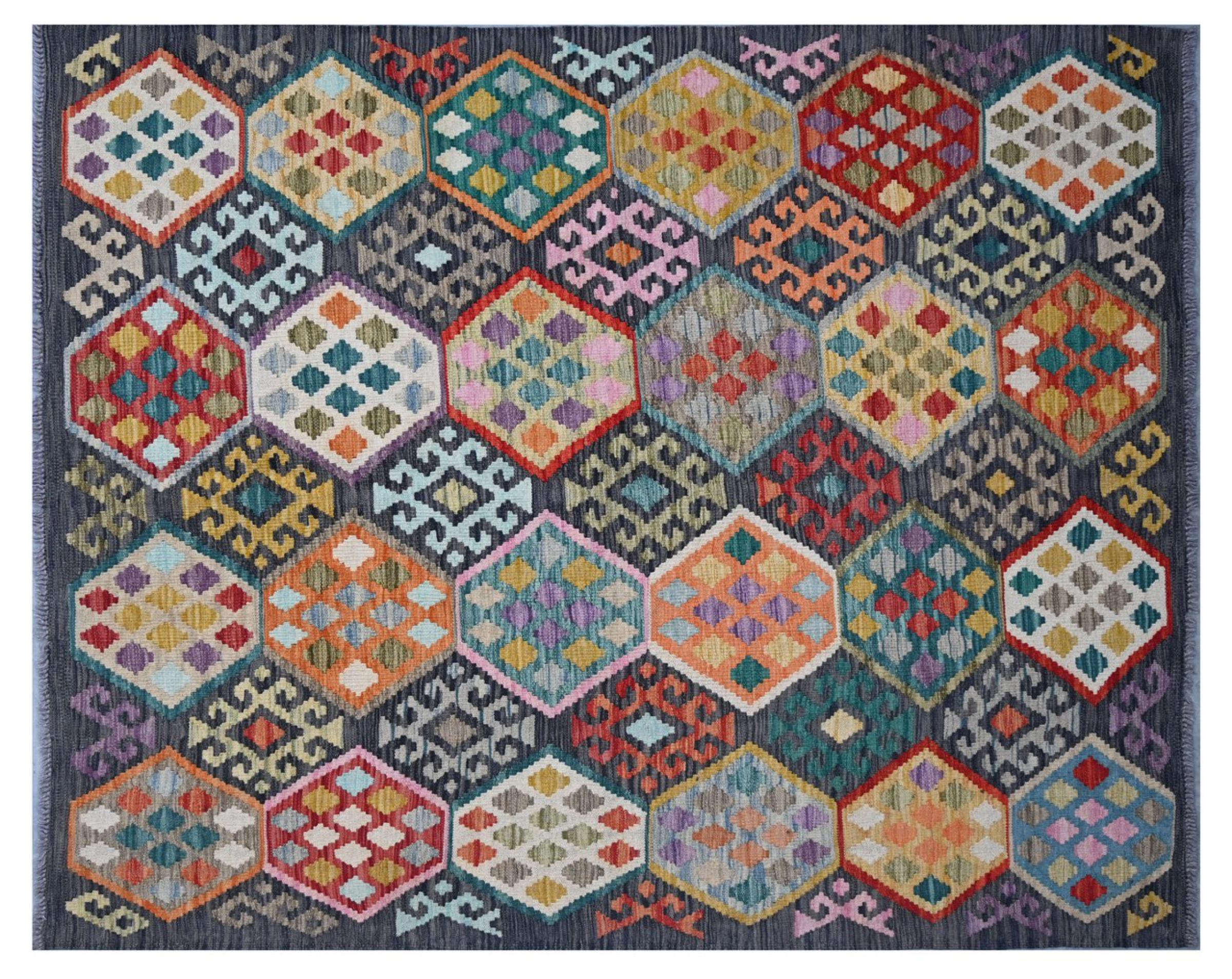 This handwoven Kilim Afghan is a wonderful and unique piece of art. Hard to believe that these modern colours and patterns have already been used centuries ago. This carpet has been woven by hand in old tradition in Afghanistan. It delivers a portion of contemporary history, which you won't find in this specific design a second time. It consists of high-grade natural wool and gives your home a personalised touch.