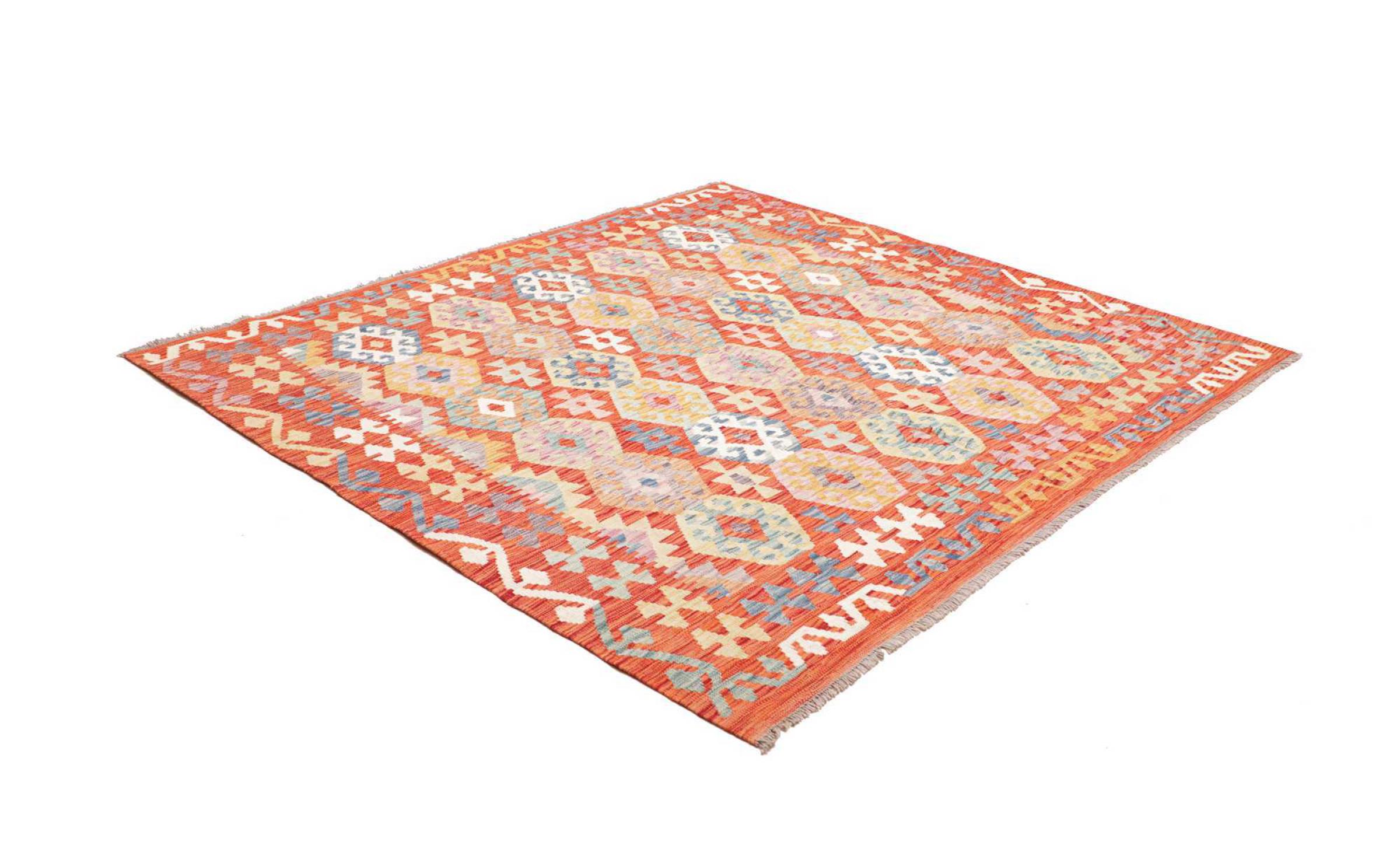 This handwoven Kilim Afghan is a wonderful and unique piece of art. Hard to believe that these modern colours and patterns have already been used centuries ago. This carpet has been woven by hand in old tradition in Afghanistan. It delivers a portion of contemporary history, which you won't find in this specific design a second time. It consists of high-grade natural wool and gives your home a personalised touch.
