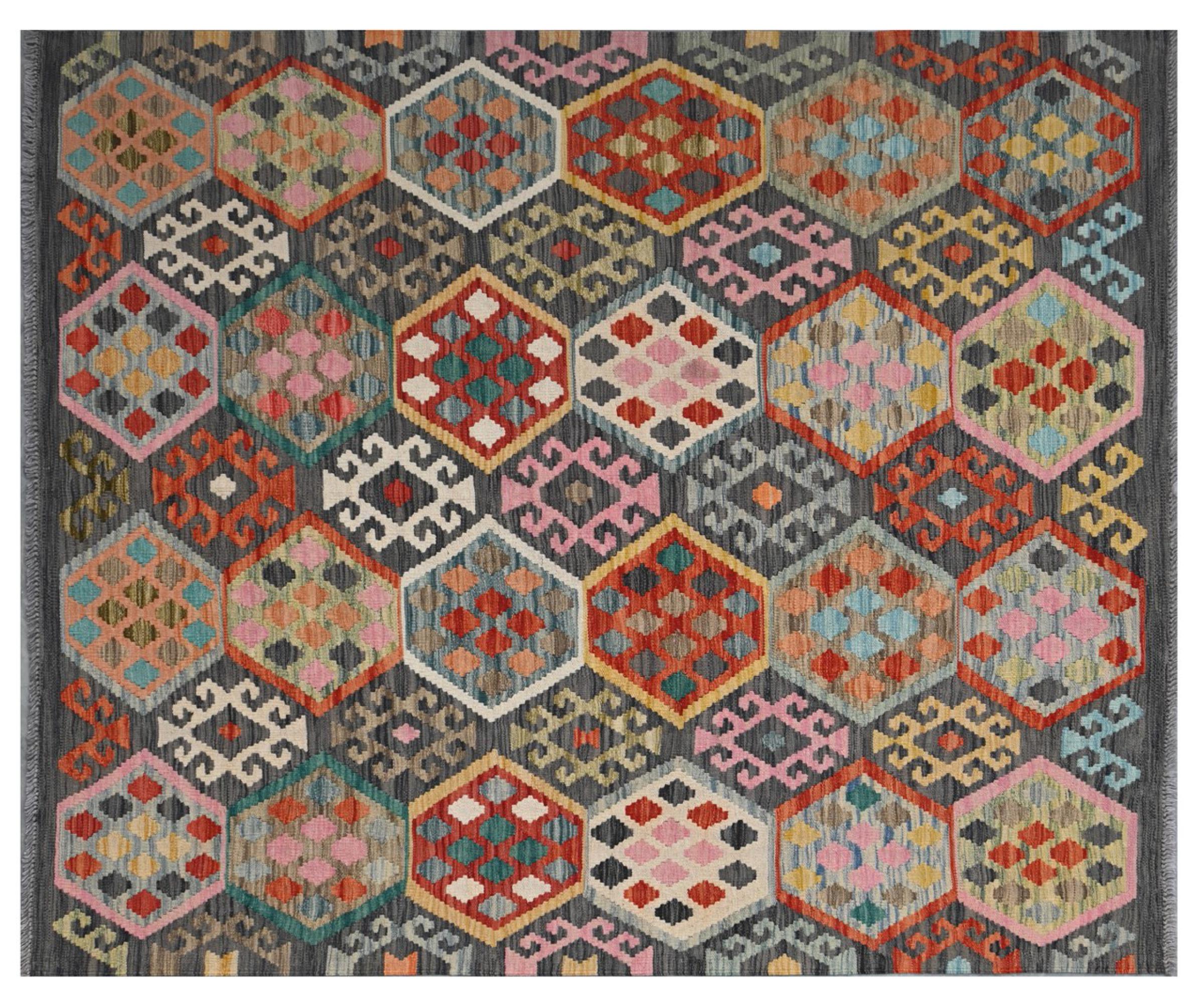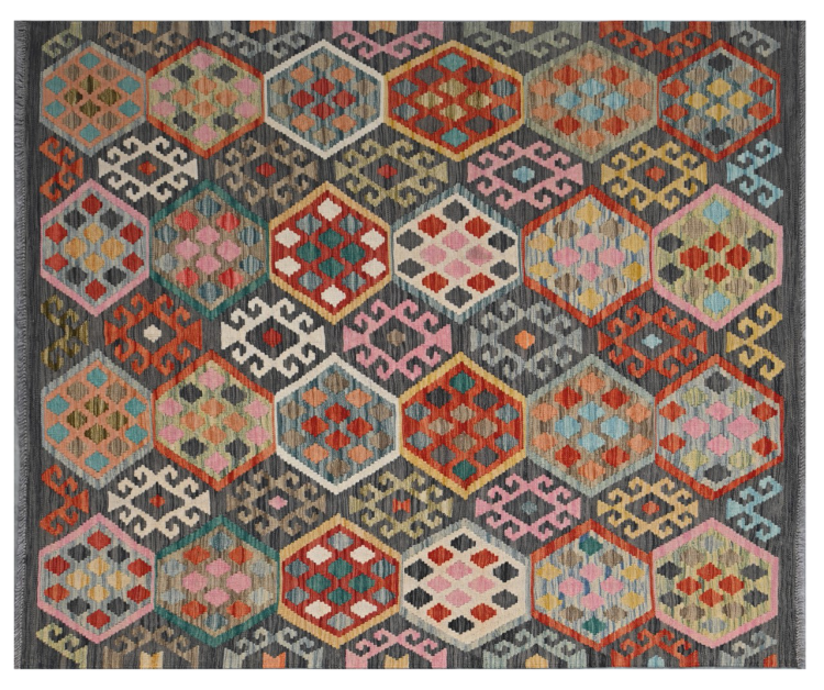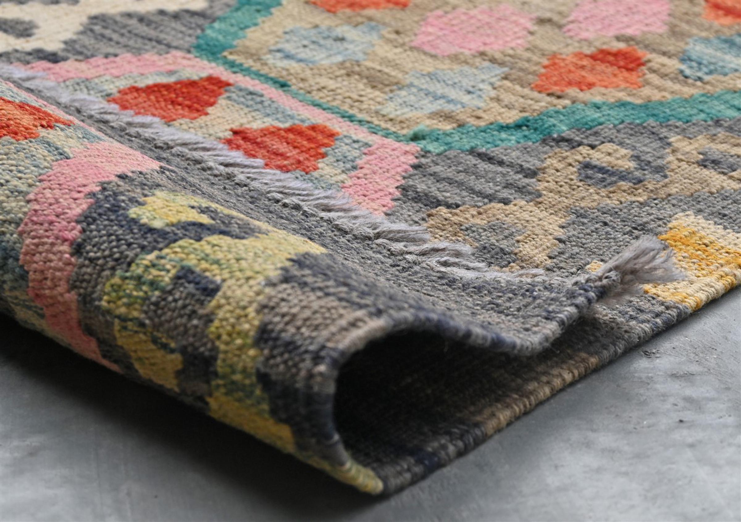 This handwoven Kilim Afghan is a wonderful and unique piece of art. Hard to believe that these modern colours and patterns have already been used centuries ago. This carpet has been woven by hand in old tradition in Afghanistan. It delivers a portion of contemporary history, which you won't find in this specific design a second time. It consists of high-grade natural wool and gives your home a personalised touch.
