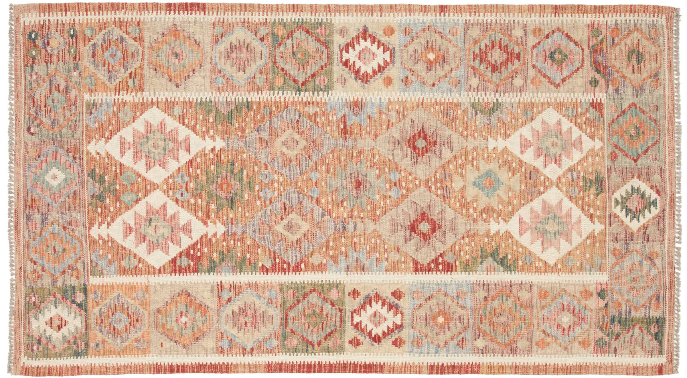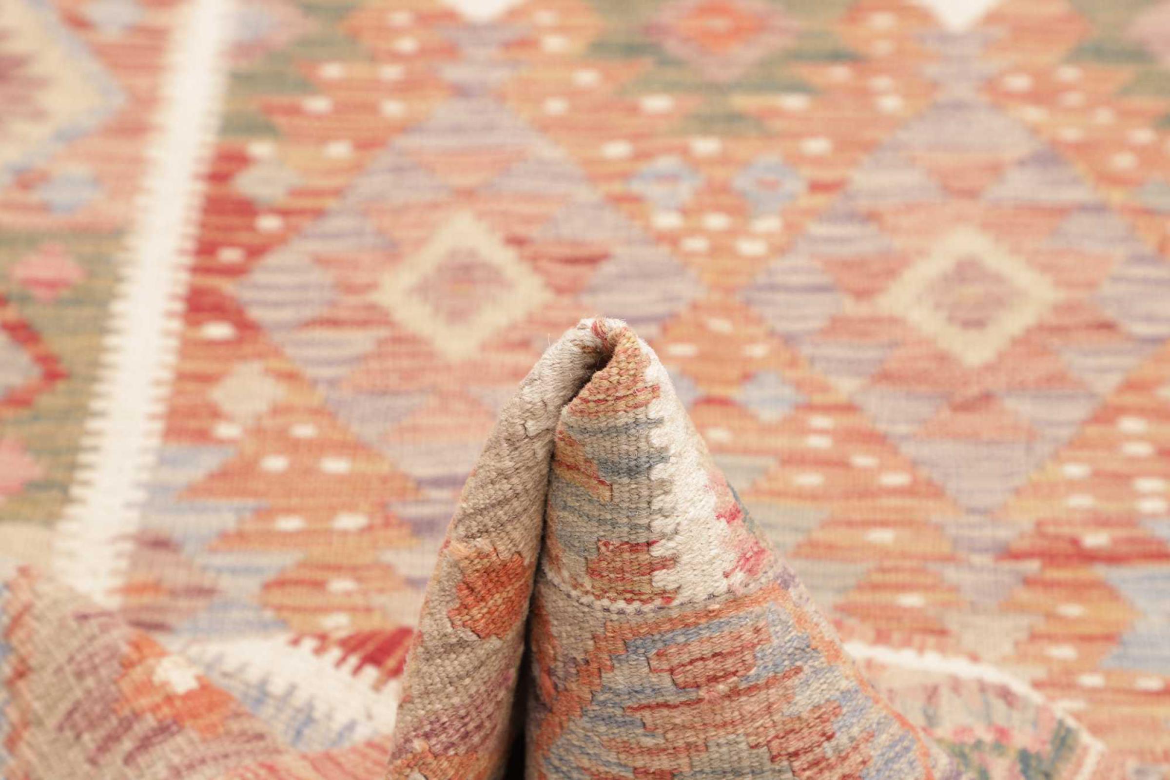 This handwoven Kilim Afghan is a wonderful and unique piece of art. Hard to believe that these modern colours and patterns have already been used centuries ago. This carpet has been woven by hand in old tradition in Afghanistan. It delivers a portion of contemporary history, which you won't find in this specific design a second time. It consists of high-grade natural wool and gives your home a personalised touch.