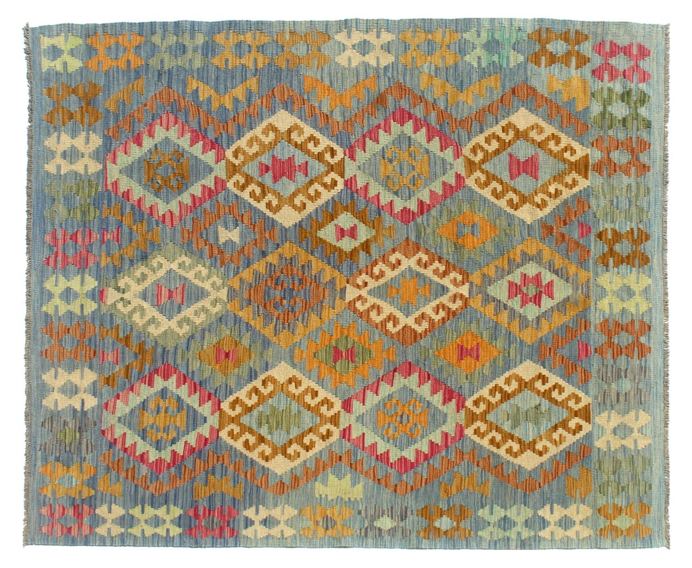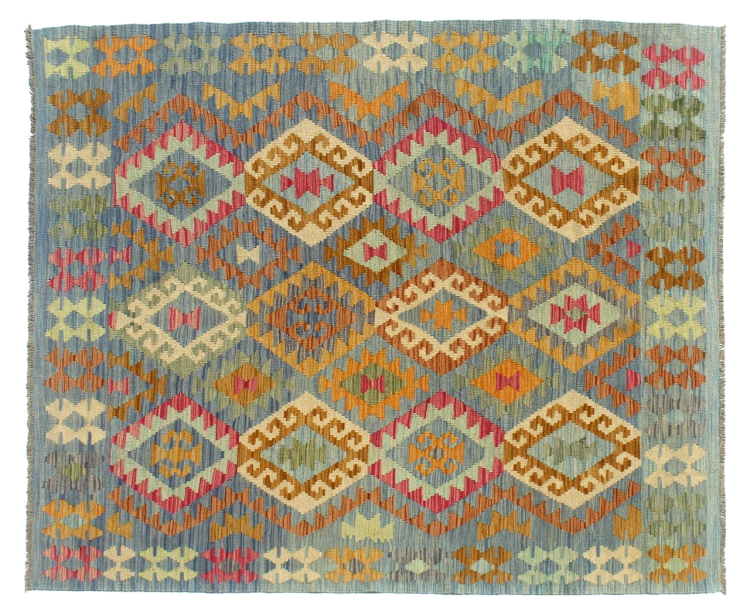 This handwoven Kilim Afghan is a wonderful and unique piece of art. Hard to believe that these modern colours and patterns have already been used centuries ago. This carpet has been woven by hand in old tradition in Afghanistan. It delivers a portion of contemporary history, which you won't find in this specific design a second time. It consists of high-grade natural wool and gives your home a personalised touch.
