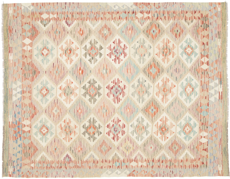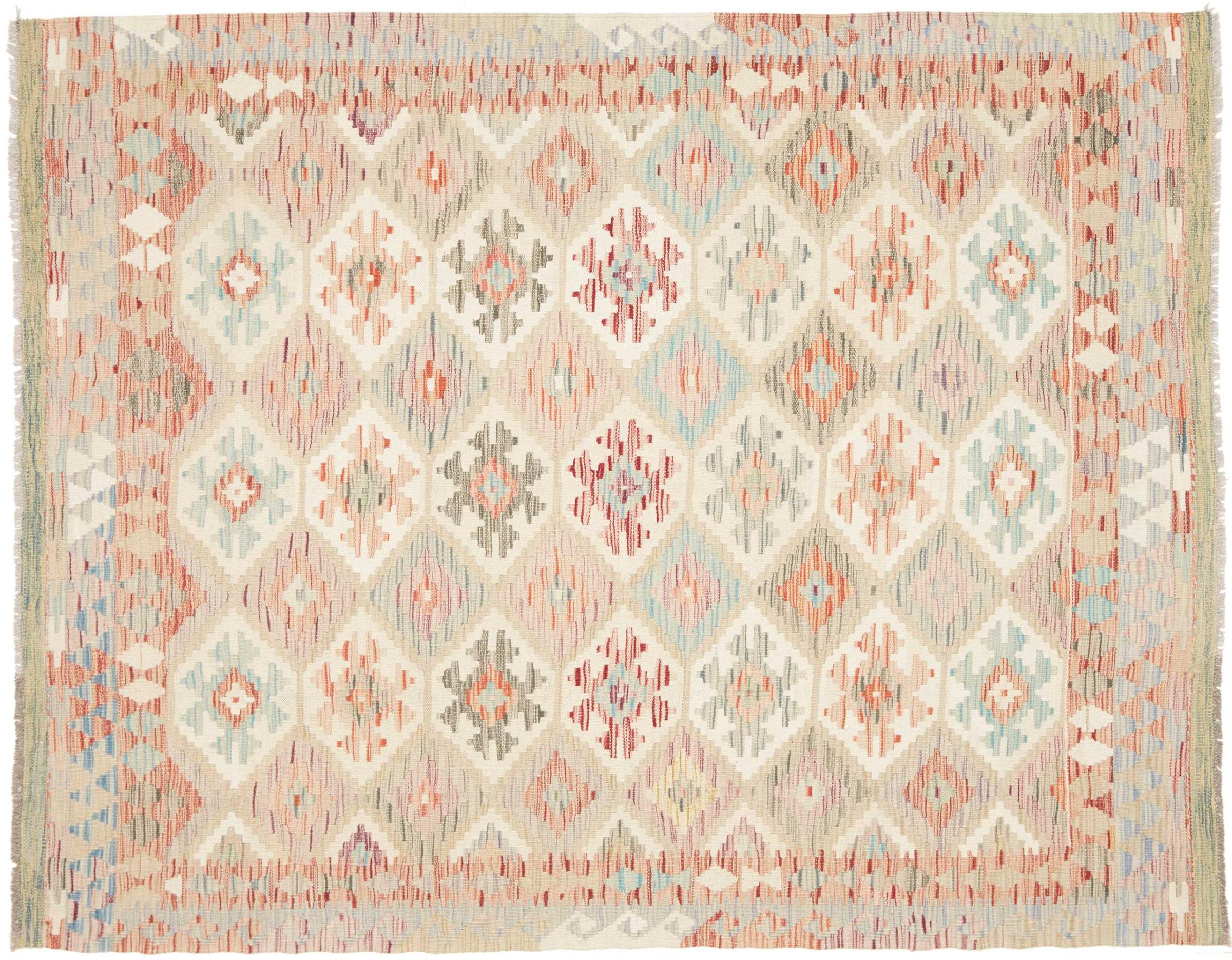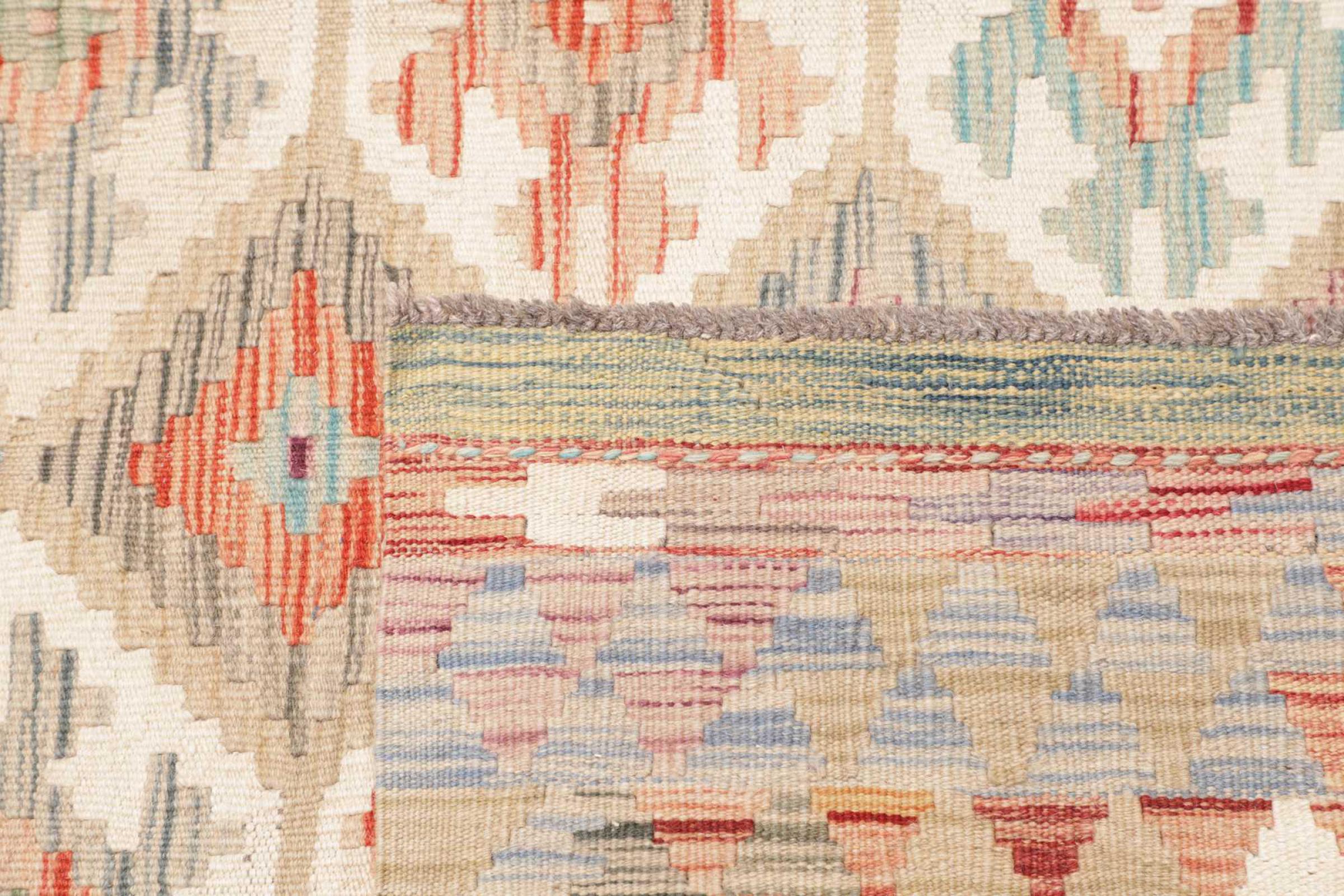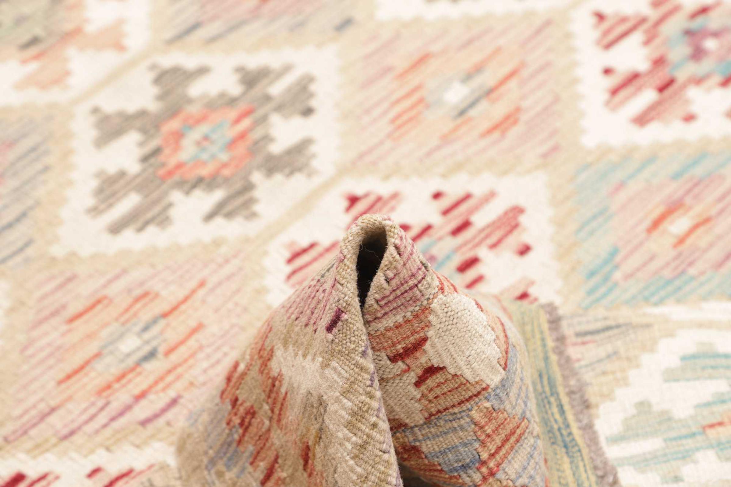 This handwoven Kilim Afghan is a wonderful and unique piece of art. Hard to believe that these modern colours and patterns have already been used centuries ago. This carpet has been woven by hand in old tradition in Afghanistan. It delivers a portion of contemporary history, which you won't find in this specific design a second time. It consists of high-grade natural wool and gives your home a personalised touch.