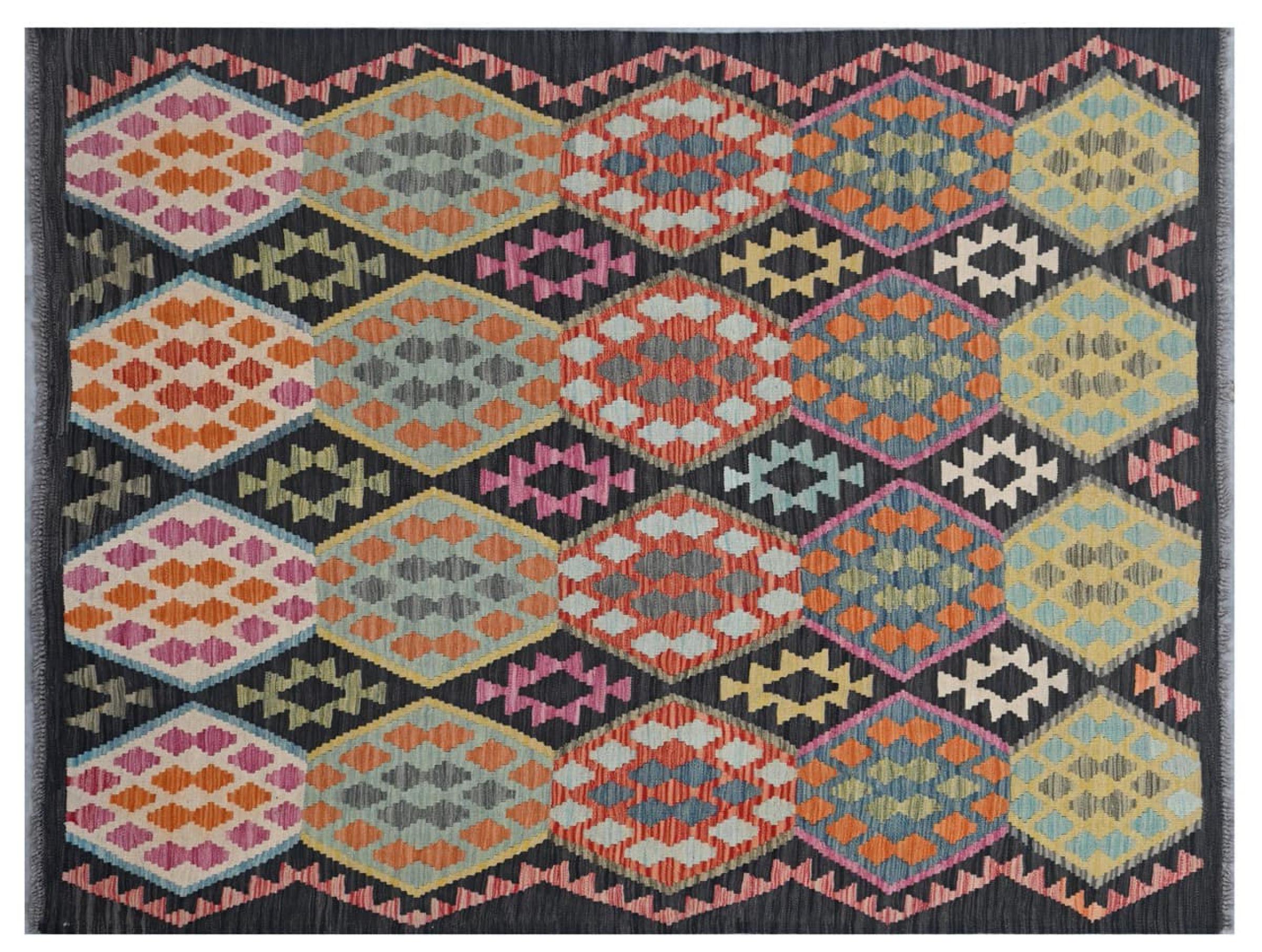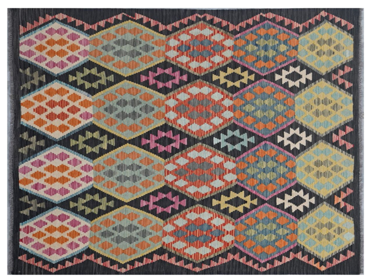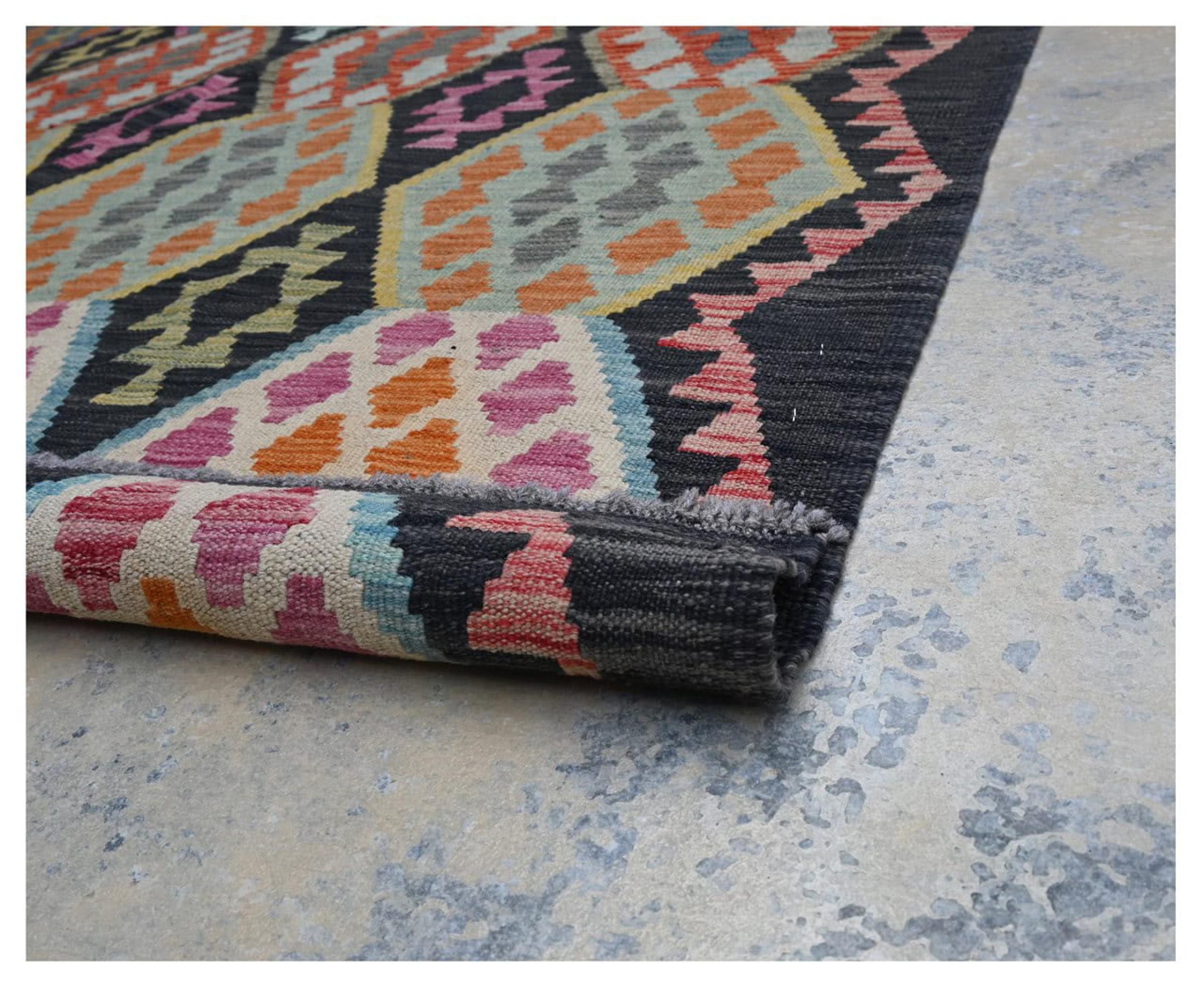 This handwoven Kilim Afghan is a wonderful and unique piece of art. Hard to believe that these modern colours and patterns have already been used centuries ago. This carpet has been woven by hand in old tradition in Afghanistan. It delivers a portion of contemporary history, which you won't find in this specific design a second time. It consists of high-grade natural wool and gives your home a personalised touch.