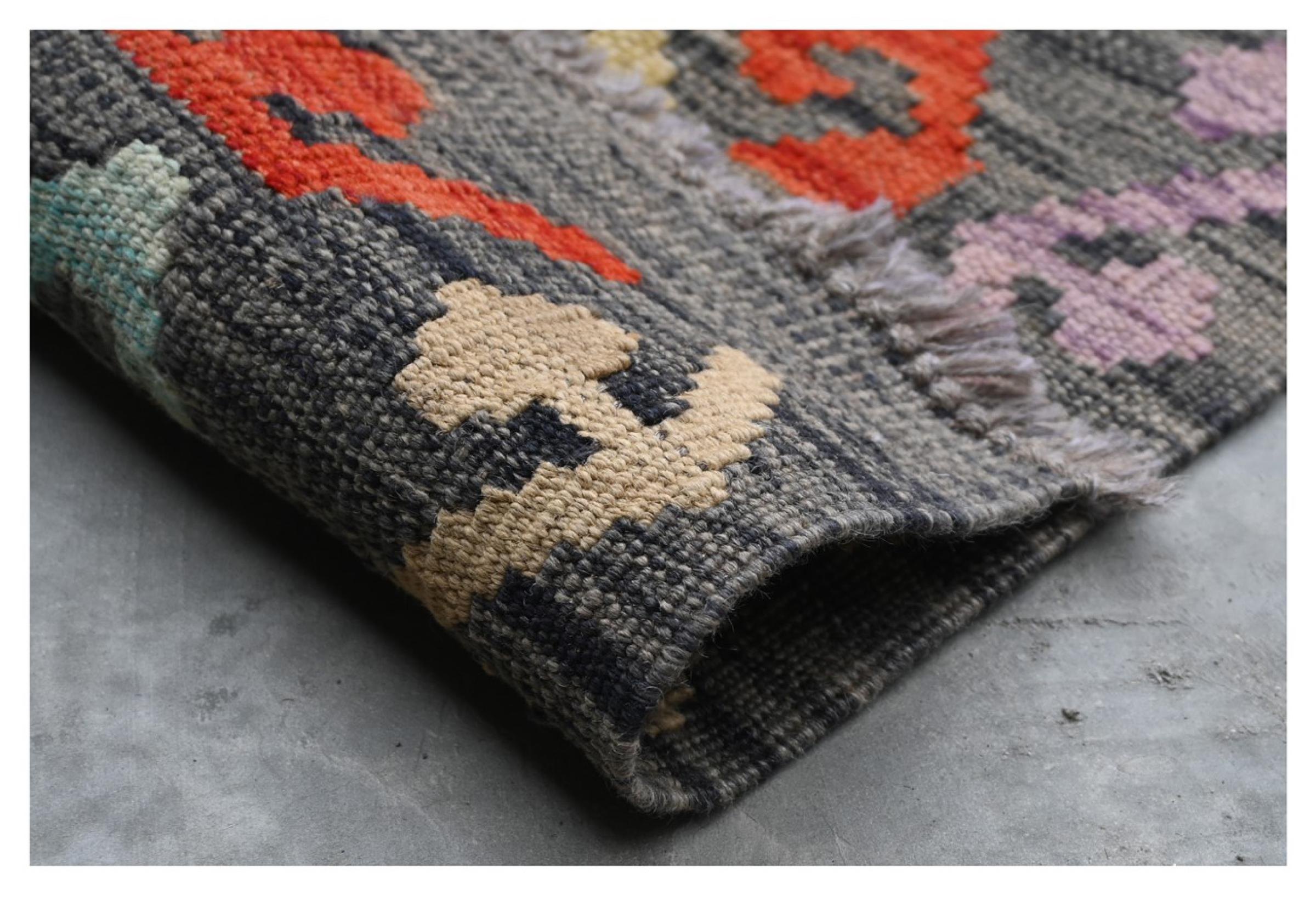 This rug was made as a flat weave by hand on a loom. Flatweave is the term used to describe rugs that have no pile. As the name promises, these rugs are woven and not knotted. This results in a flat rug with a structured surface. Flatweaves are not as soft and usually thinner than knotted rugs. At the same time they are much less complex to manufacture and can usually be laid out from both sides (front and back). Their patterns are usually geometric, which is determined by the fabric.