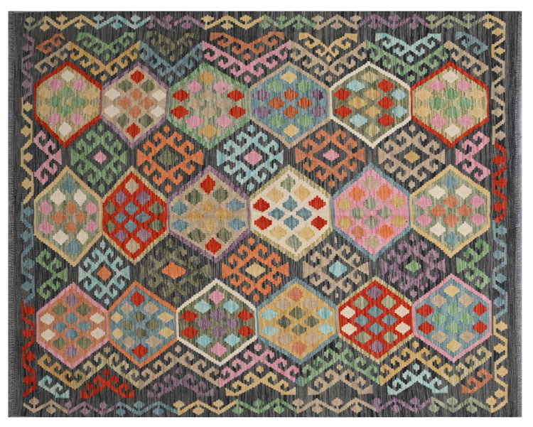 This handwoven Kilim Afghan is a wonderful and unique piece of art. Hard to believe that these modern colours and patterns have already been used centuries ago. This carpet has been woven by hand in old tradition in Afghanistan. It delivers a portion of contemporary history, which you won't find in this specific design a second time. It consists of high-grade natural wool and gives your home a personalised touch.
