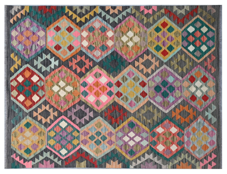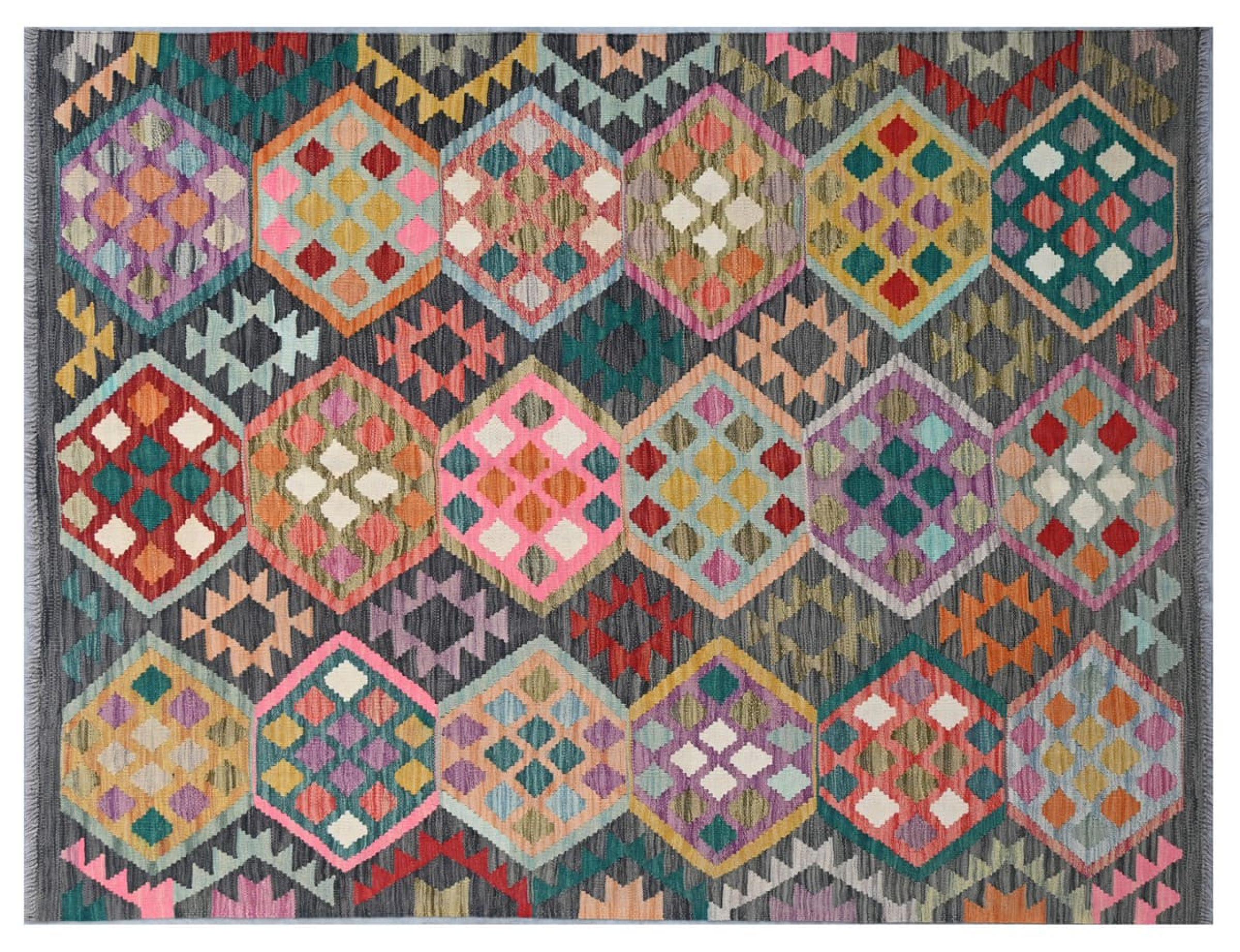 This handwoven Kilim Afghan is a wonderful and unique piece of art. Hard to believe that these modern colours and patterns have already been used centuries ago. This carpet has been woven by hand in old tradition in Afghanistan. It delivers a portion of contemporary history, which you won't find in this specific design a second time. It consists of high-grade natural wool and gives your home a personalised touch.