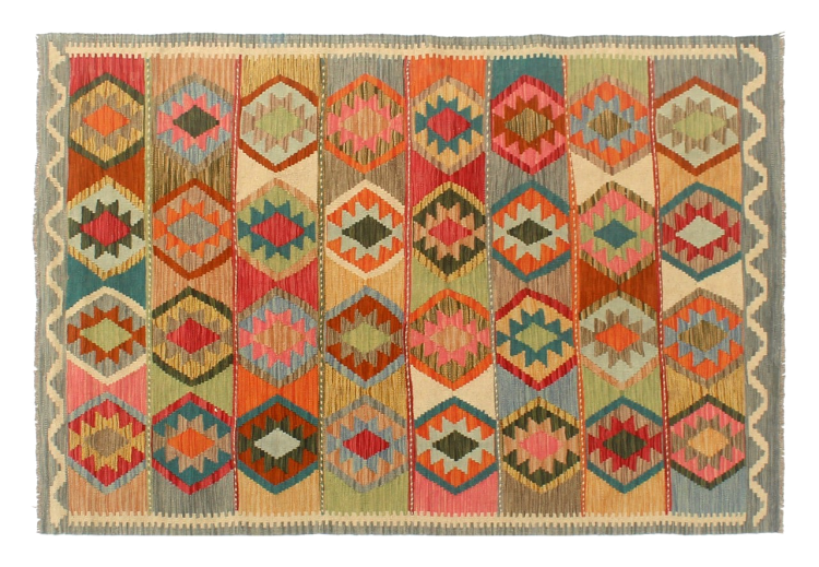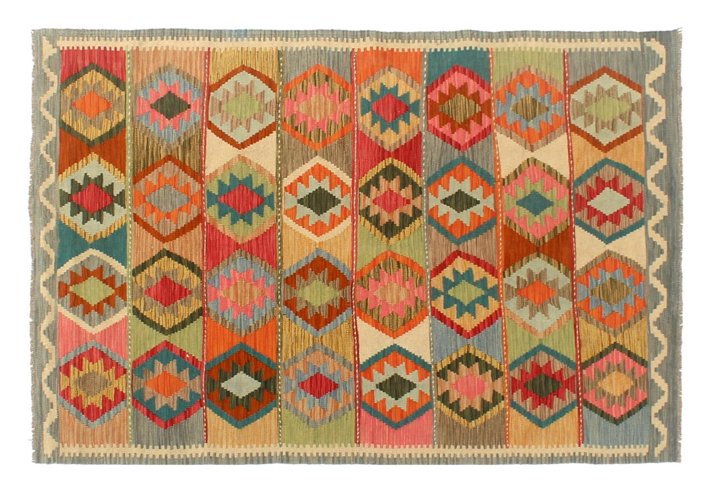 This handwoven Kilim Afghan is a wonderful and unique piece of art. Hard to believe that these modern colours and patterns have already been used centuries ago. This carpet has been woven by hand in old tradition in Afghanistan. It delivers a portion of contemporary history, which you won't find in this specific design a second time. It consists of high-grade natural wool and gives your home a personalised touch.