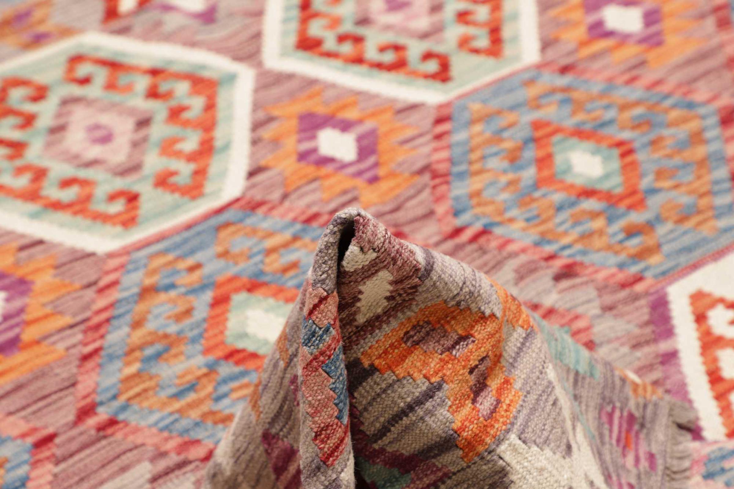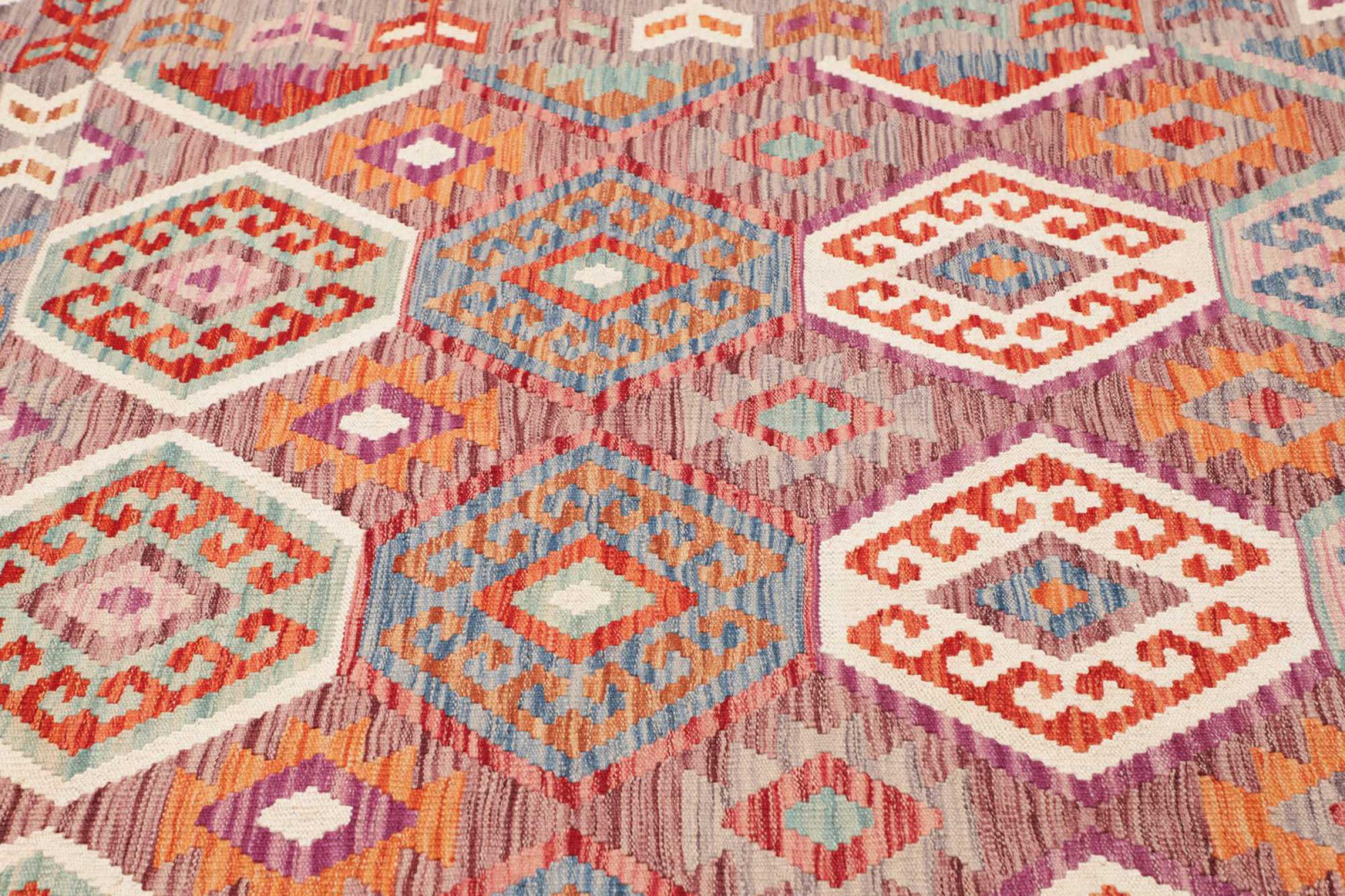 This handwoven Kilim Afghan is a wonderful and unique piece of art. Hard to believe that these modern colours and patterns have already been used centuries ago. This carpet has been woven by hand in old tradition in Afghanistan. It delivers a portion of contemporary history, which you won't find in this specific design a second time. It consists of high-grade natural wool and gives your home a personalised touch.