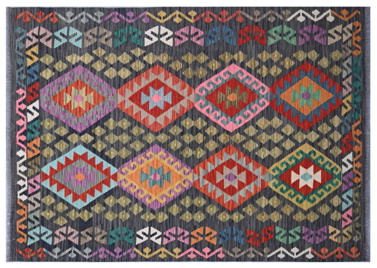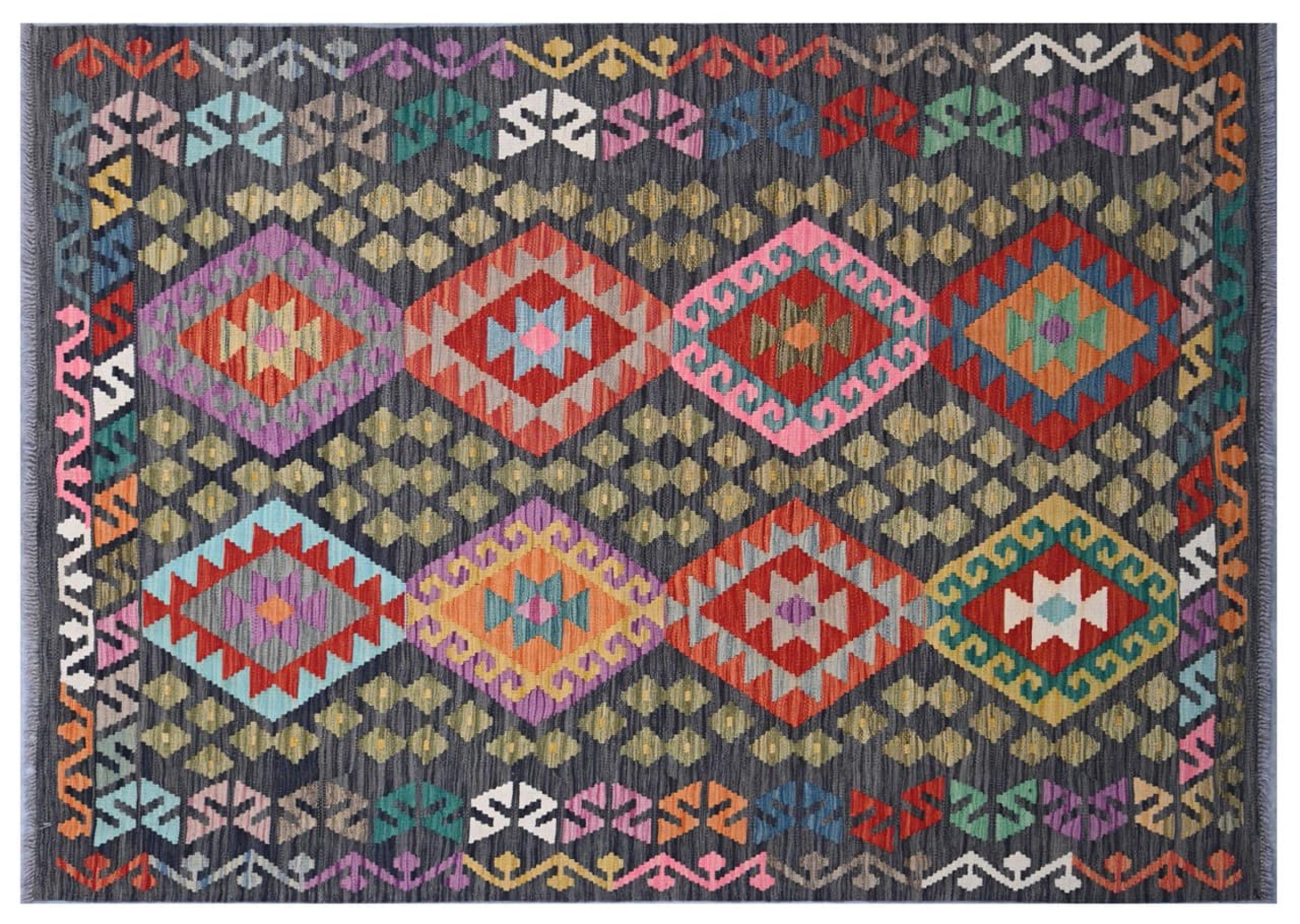 This handwoven Kilim Afghan is a wonderful and unique piece of art. Hard to believe that these modern colours and patterns have already been used centuries ago. This carpet has been woven by hand in old tradition in Afghanistan. It delivers a portion of contemporary history, which you won't find in this specific design a second time. It consists of high-grade natural wool and gives your home a personalised touch.