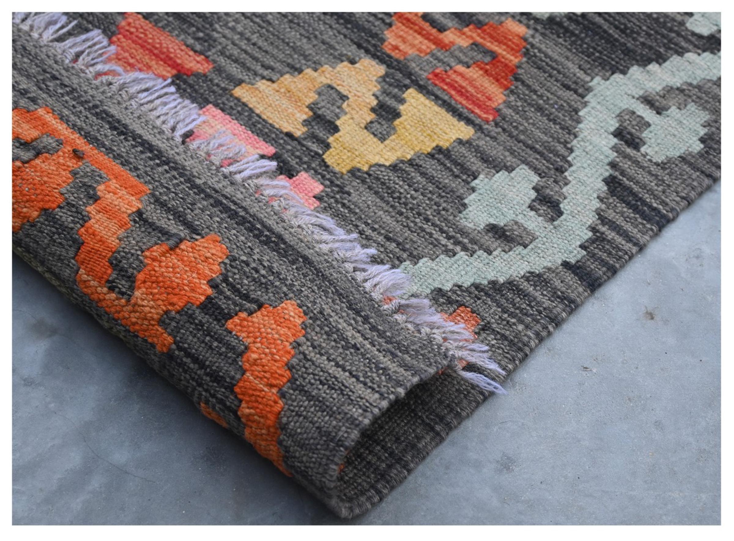 This rug was made as a flat weave by hand on a loom. Flatweave is the term used to describe rugs that have no pile. As the name promises, these rugs are woven and not knotted. This results in a flat rug with a structured surface. Flatweaves are not as soft and usually thinner than knotted rugs. At the same time they are much less complex to manufacture and can usually be laid out from both sides (front and back). Their patterns are usually geometric, which is determined by the fabric.