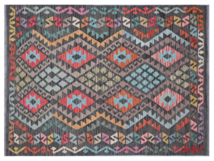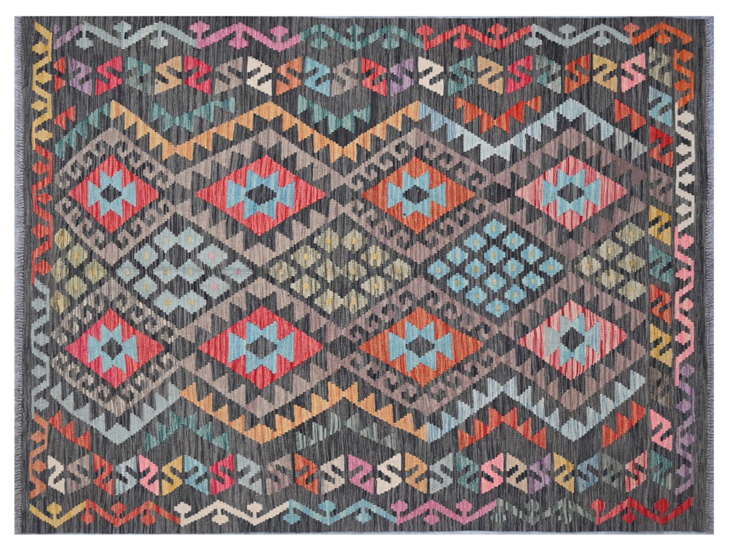 This handwoven Kilim Afghan is a wonderful and unique piece of art. Hard to believe that these modern colours and patterns have already been used centuries ago. This carpet has been woven by hand in old tradition in Afghanistan. It delivers a portion of contemporary history, which you won't find in this specific design a second time. It consists of high-grade natural wool and gives your home a personalised touch.