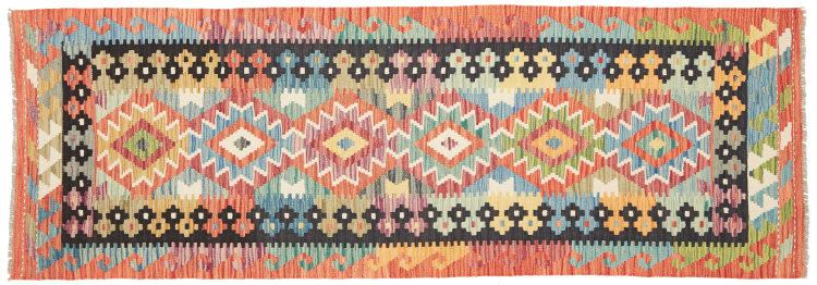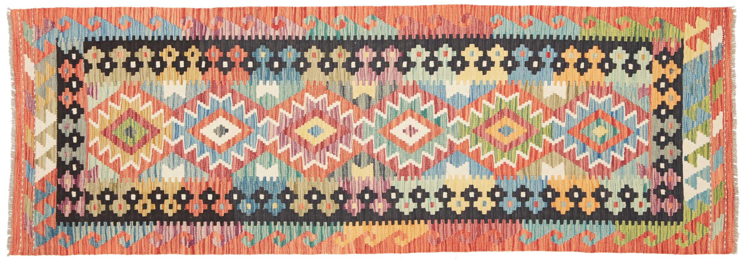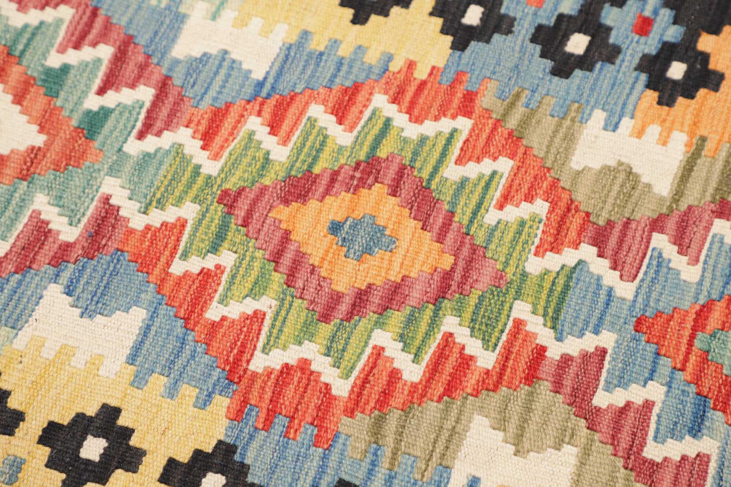 This handwoven Kilim Afghan is a wonderful and unique piece of art. Hard to believe that these modern colours and patterns have already been used centuries ago. This carpet has been woven by hand in old tradition in Afghanistan. It delivers a portion of contemporary history, which you won't find in this specific design a second time. It consists of high-grade natural wool and gives your home a personalised touch.