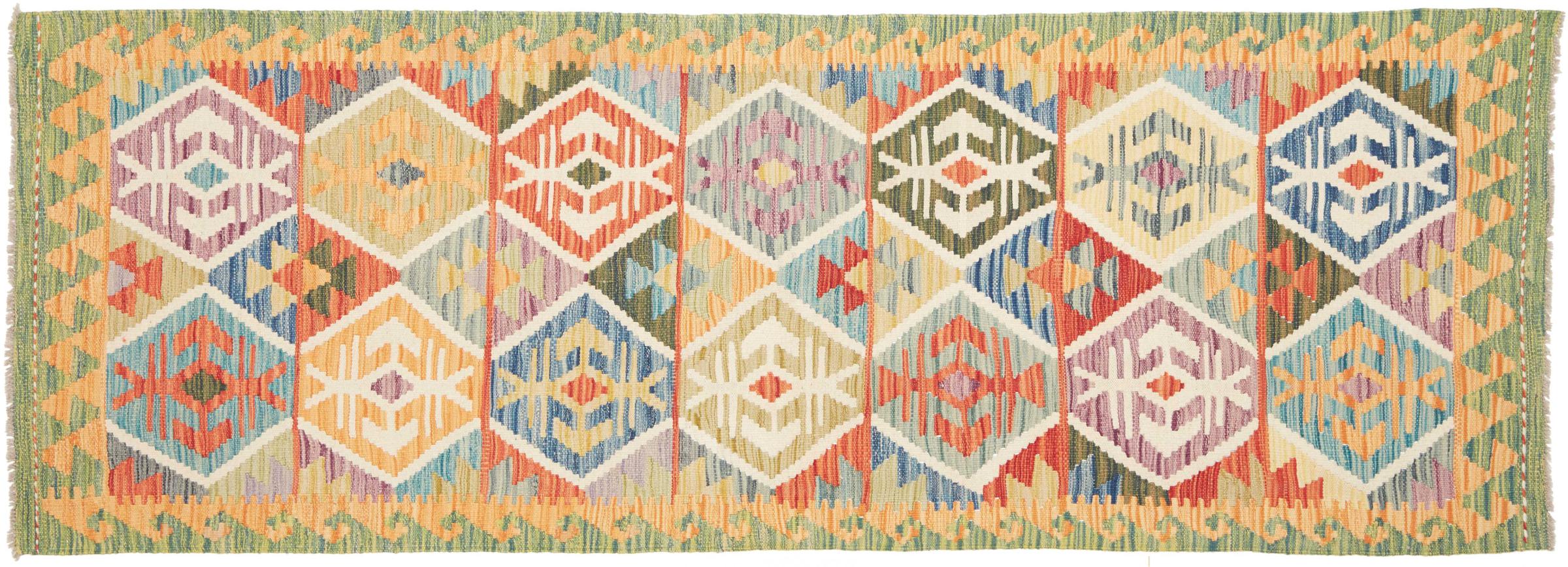 This handwoven Kilim Afghan is a wonderful and unique piece of art. Hard to believe that these modern colours and patterns have already been used centuries ago. This carpet has been woven by hand in old tradition in Afghanistan. It delivers a portion of contemporary history, which you won't find in this specific design a second time. It consists of high-grade natural wool and gives your home a personalised touch.