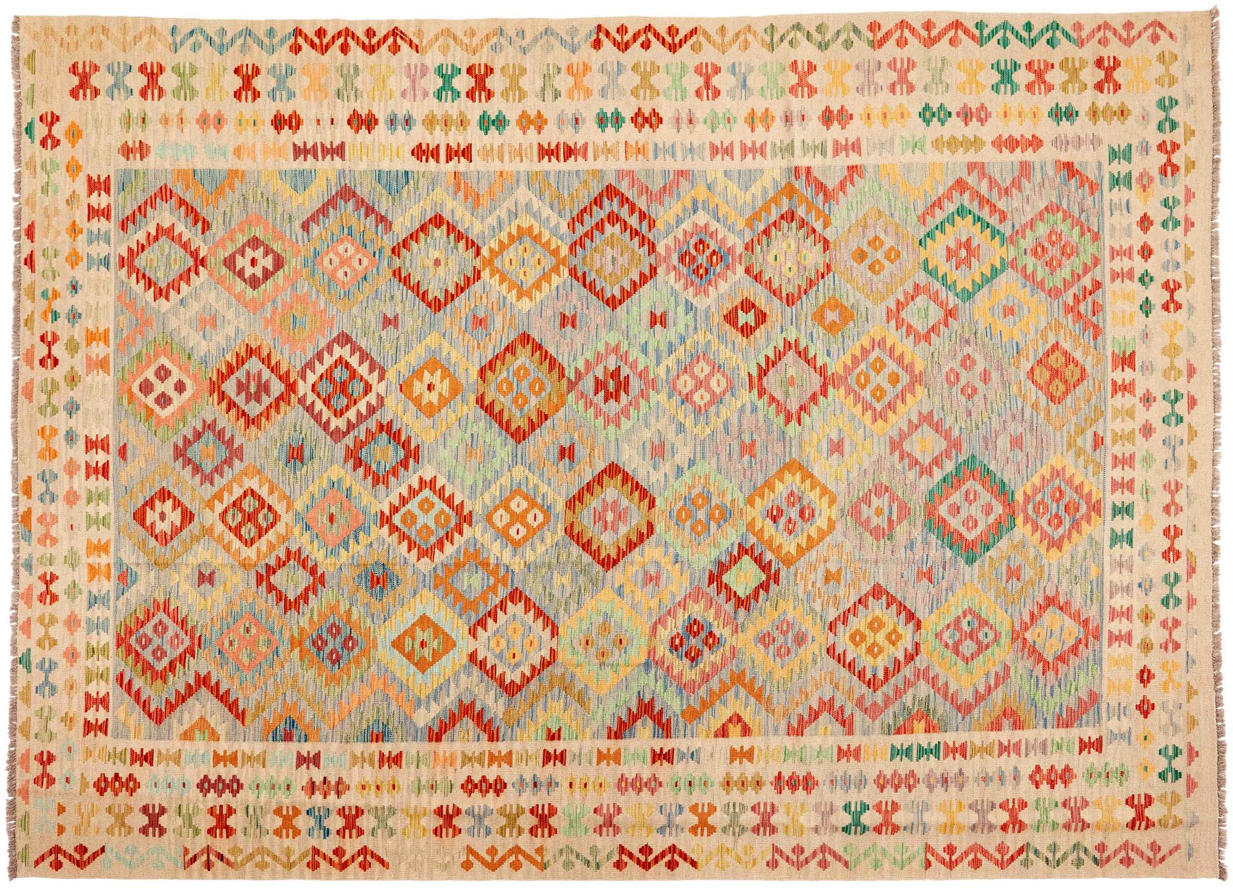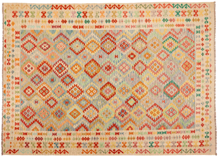 This handwoven Kilim Afghan is a wonderful and unique piece of art. Hard to believe that these modern colours and patterns have already been used centuries ago. This carpet has been woven by hand in old tradition in Afghanistan. It delivers a portion of contemporary history, which you won't find in this specific design a second time. It consists of high-grade natural wool and gives your home a personalised touch.