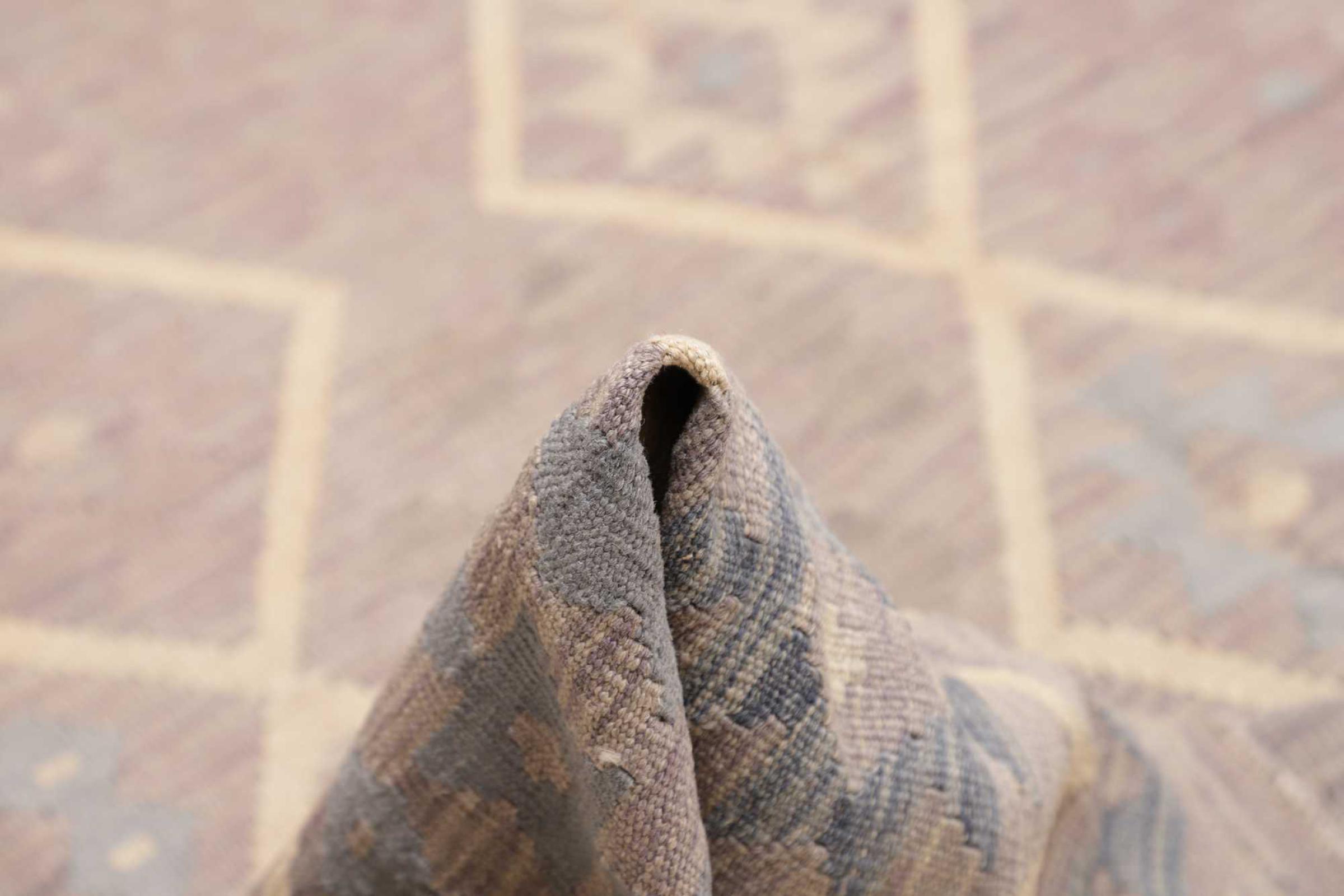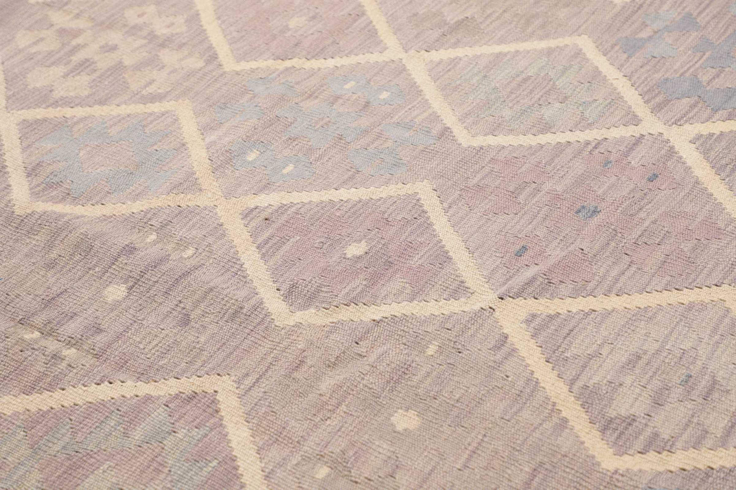 This rug was made as a flat weave by hand on a loom. Flatweave is the term used to describe rugs that have no pile. As the name promises, these rugs are woven and not knotted. This results in a flat rug with a structured surface. Flatweaves are not as soft and usually thinner than knotted rugs. At the same time they are much less complex to manufacture and can usually be laid out from both sides (front and back). Their patterns are usually geometric, which is determined by the fabric.