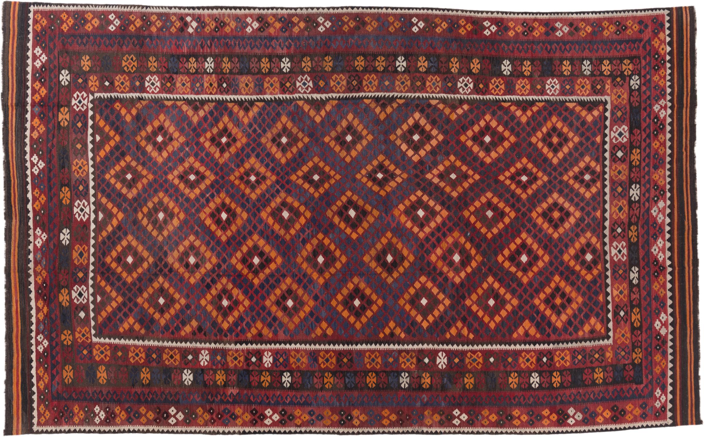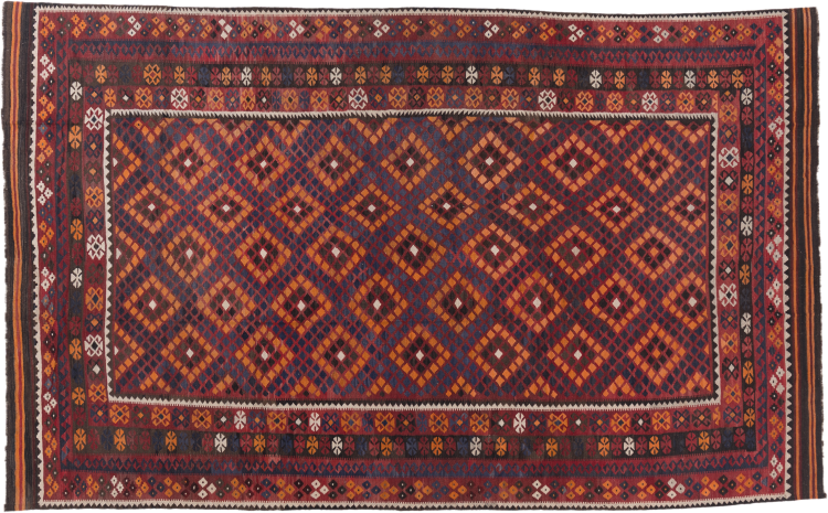 This rug was made as a flat weave by hand on a loom. Flatweave is the term used to describe rugs that have no pile. As the name promises, these rugs are woven and not knotted. This results in a flat rug with a structured surface. Flatweaves are not as soft and usually thinner than knotted rugs. At the same time they are much less complex to manufacture and can usually be laid out from both sides (front and back). Their patterns are usually geometric, which is determined by the fabric.