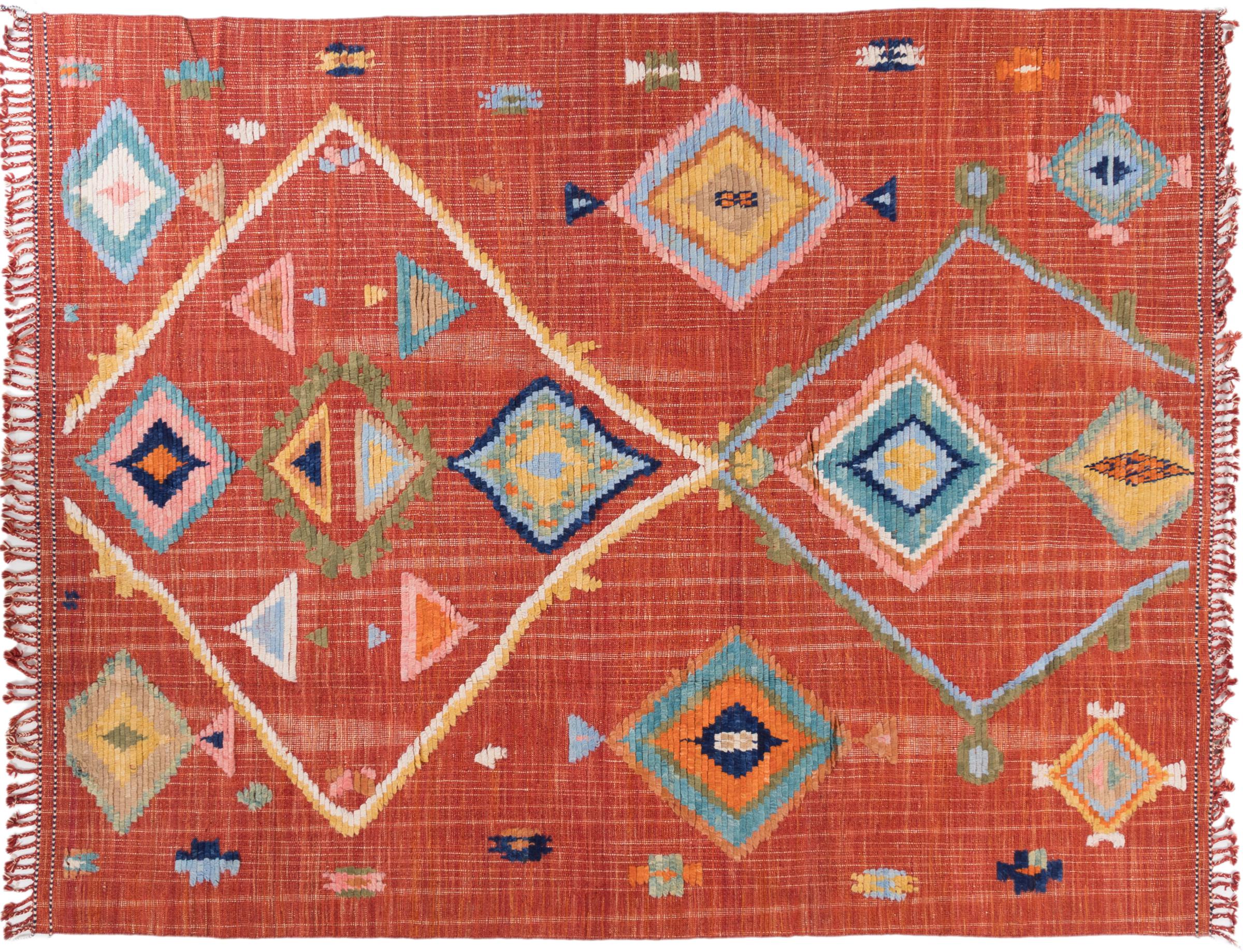 This rug was made as a flat weave by hand on a loom. Flatweave is the term used to describe rugs that have no pile. As the name promises, these rugs are woven and not knotted. This results in a flat rug with a structured surface. Flatweaves are not as soft and usually thinner than knotted rugs. At the same time they are much less complex to manufacture and can usually be laid out from both sides (front and back). Their patterns are usually geometric, which is determined by the fabric.