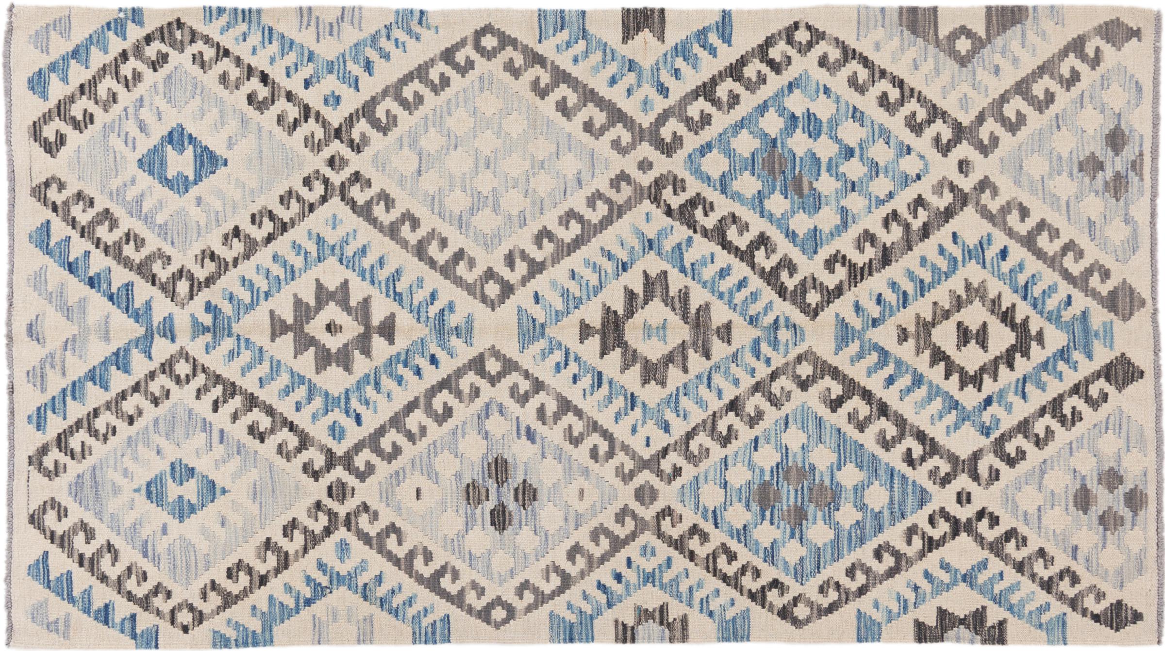 Carpet ID: 2945460048912 Size: 182x101 cm Thickness: ap. 3 mm Manufacturing: Woven by hand Pile: Handspun wool Warp: Sheep wool Origin: Afghanistan Age: New Weight: ap. 3 kg Also know as Kilim, Qilim, Chilim, Afgan, Afghán In stock: Unique - Only 1 in stock